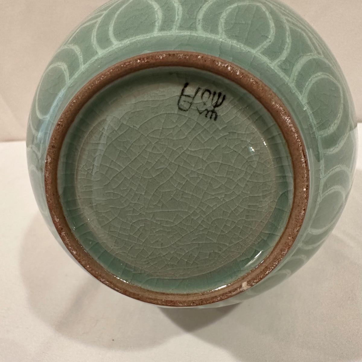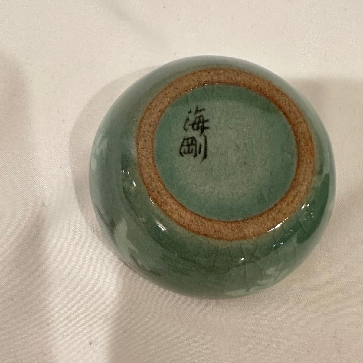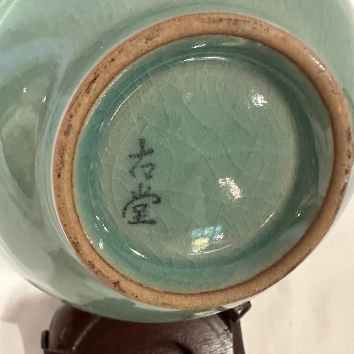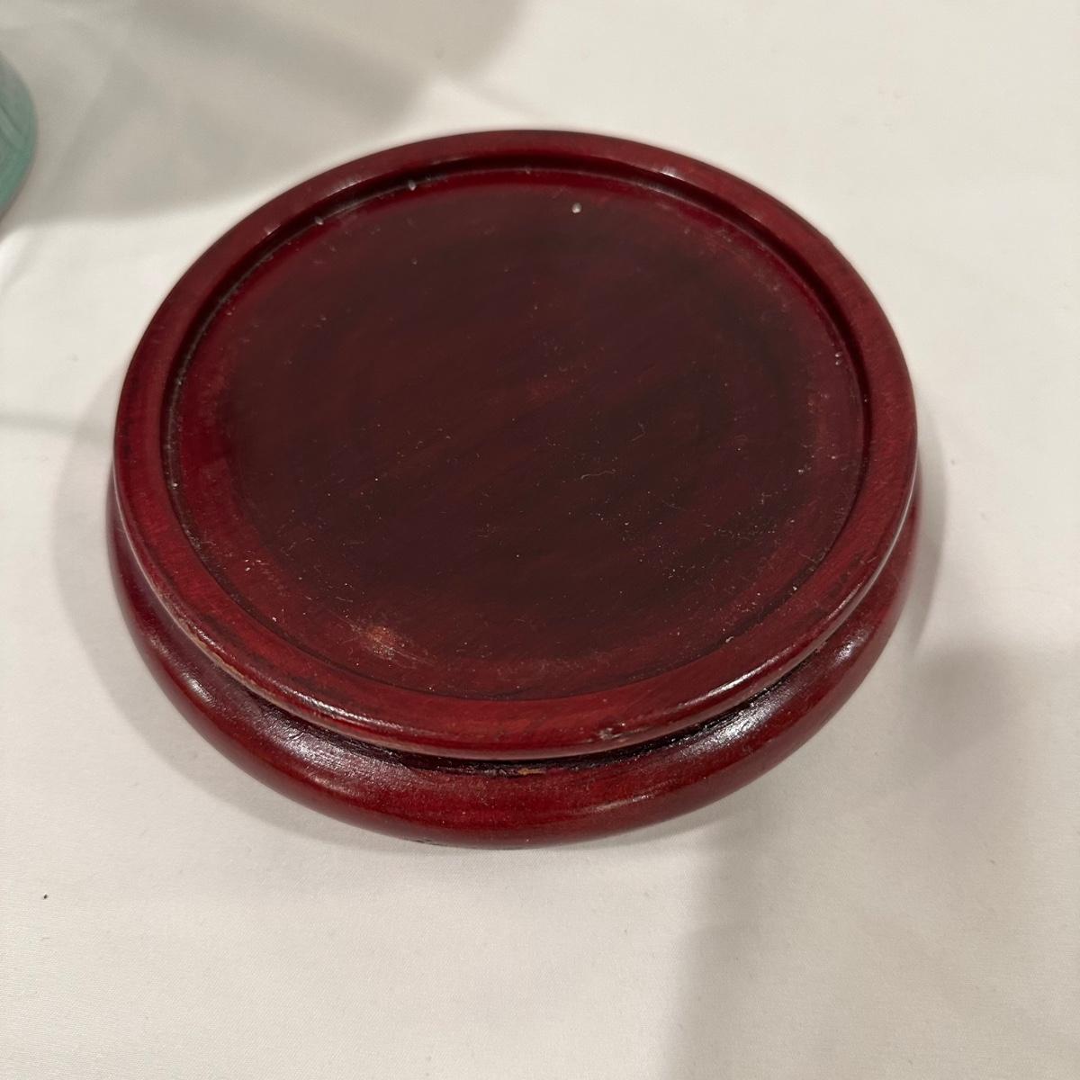 Three vases with wooden stands that appear to be porcelain with crackle celadon glaze with a flying crane design. Includes small apple with lid. Tallest vase is 12”H with wooden stand. Stand measures is 6.5”D. Shortest vase is 6.5”H with stand. Stand measures 3.5”D. Apple is 3”H x 2.5”D. Shipping available.