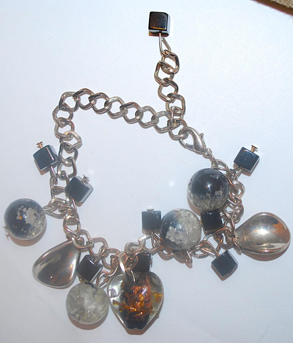 Crackled Globes, "Silver Spoons" and Sparkly Rust Heart BRACELET (3" Opening) with Black Cube Accents on Looped Chain and Lobster Clasp