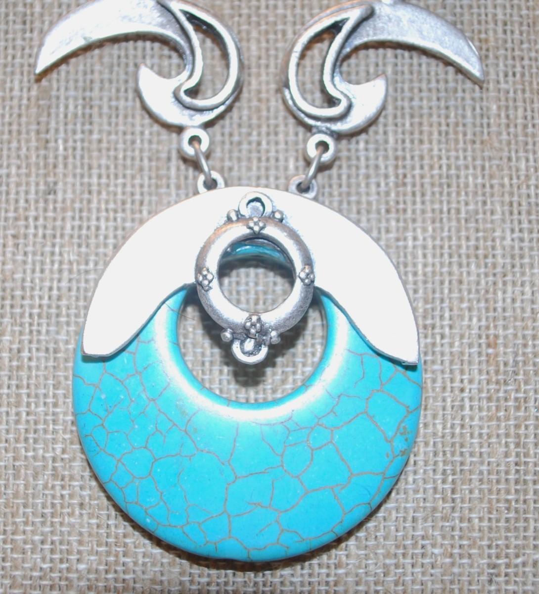 Crackled Jade-Style Necklace with Silver Tone Circles & Crescent Accents 20" L