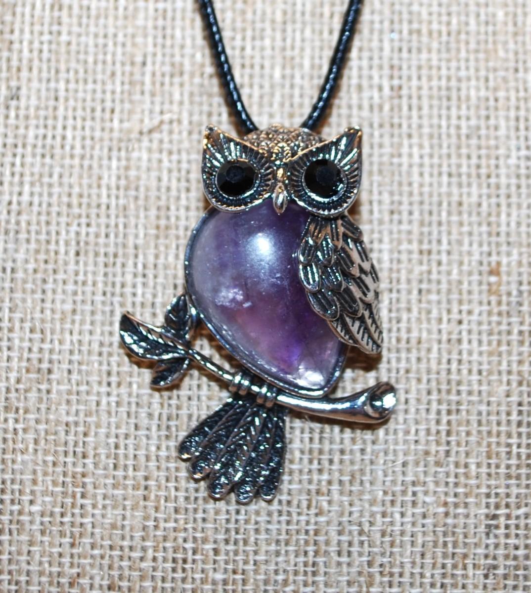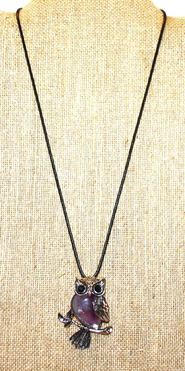 Crackled Purple Belly Owl PENDANT (2" x 1½") with Black Eyes on a Black Rope Necklace Chain 18" L