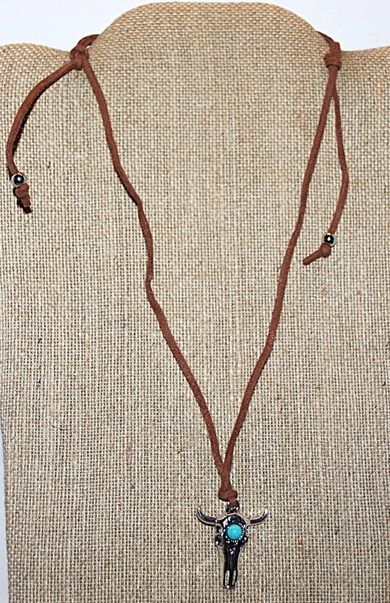 "Crackled" Round Jade Style Stone CATTLE SKULL PENDANT / NECKLACE with Leather-Style Rope Attachment