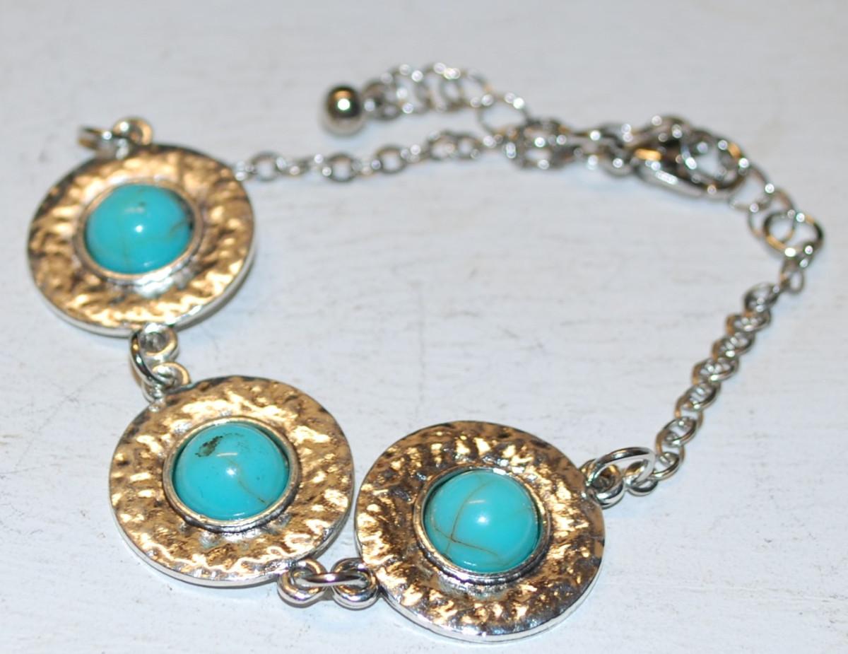 Crackled Turquoise Style Silver Tone Disks Bracelet 6" Circumference