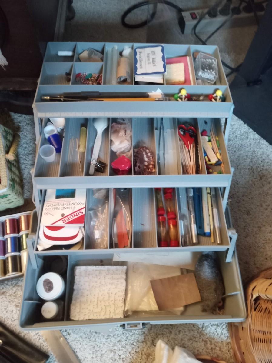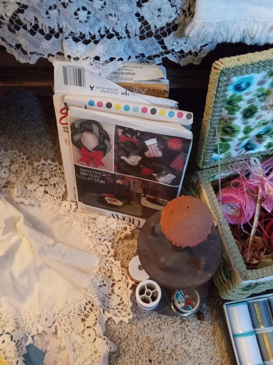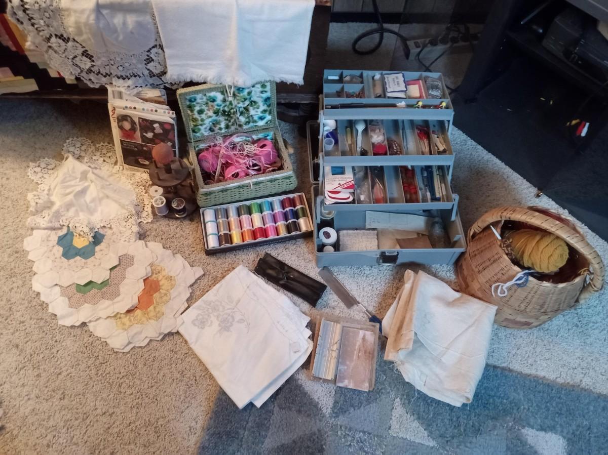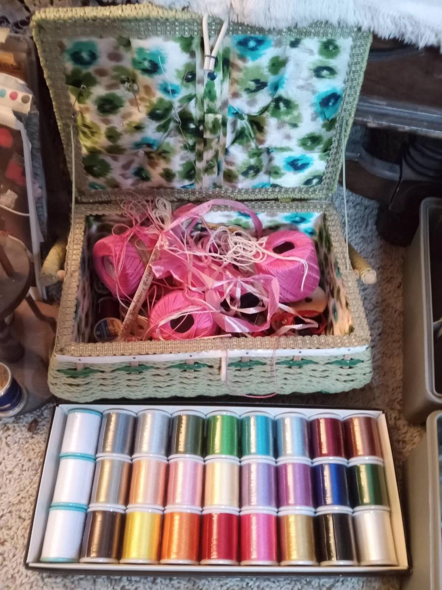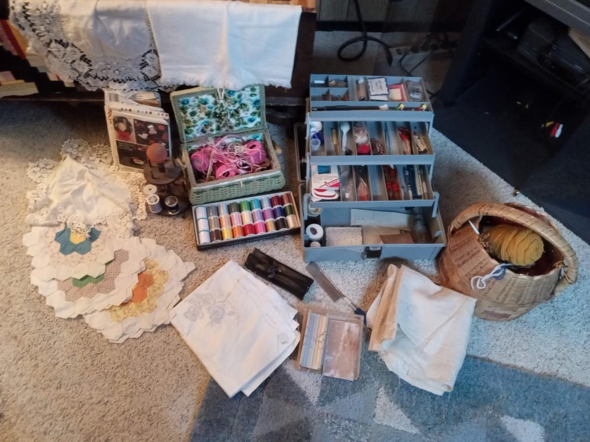 YARN IN A BASKET, NEW SPOOLS OF THREAD, PATTERNS, 3 TIER ORGANIZING BOX, EMBROIDERY THREAD, QUILTED PIECES AND MORE