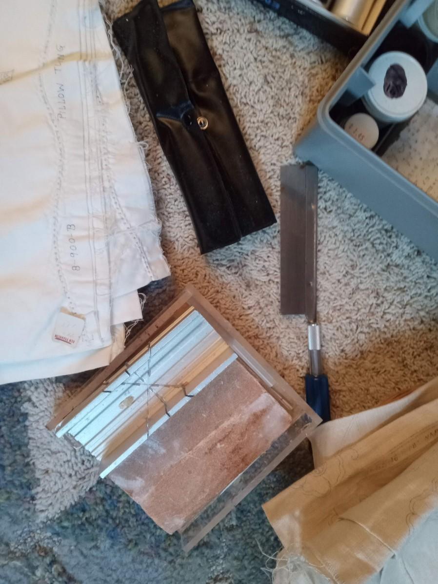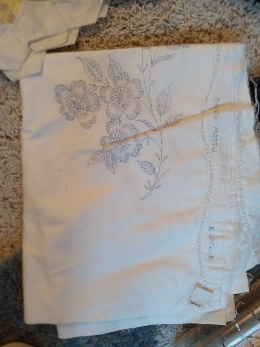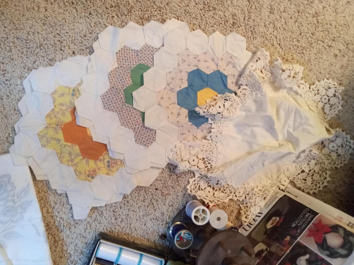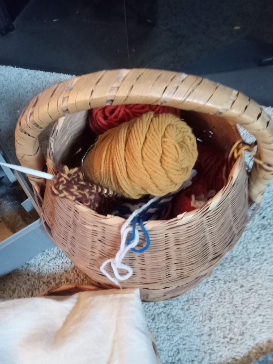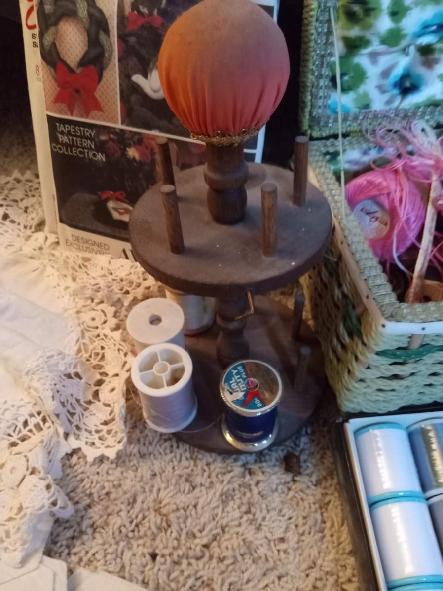 YARN IN A BASKET, NEW SPOOLS OF THREAD, PATTERNS, 3 TIER ORGANIZING BOX, EMBROIDERY THREAD, QUILTED PIECES AND MORE