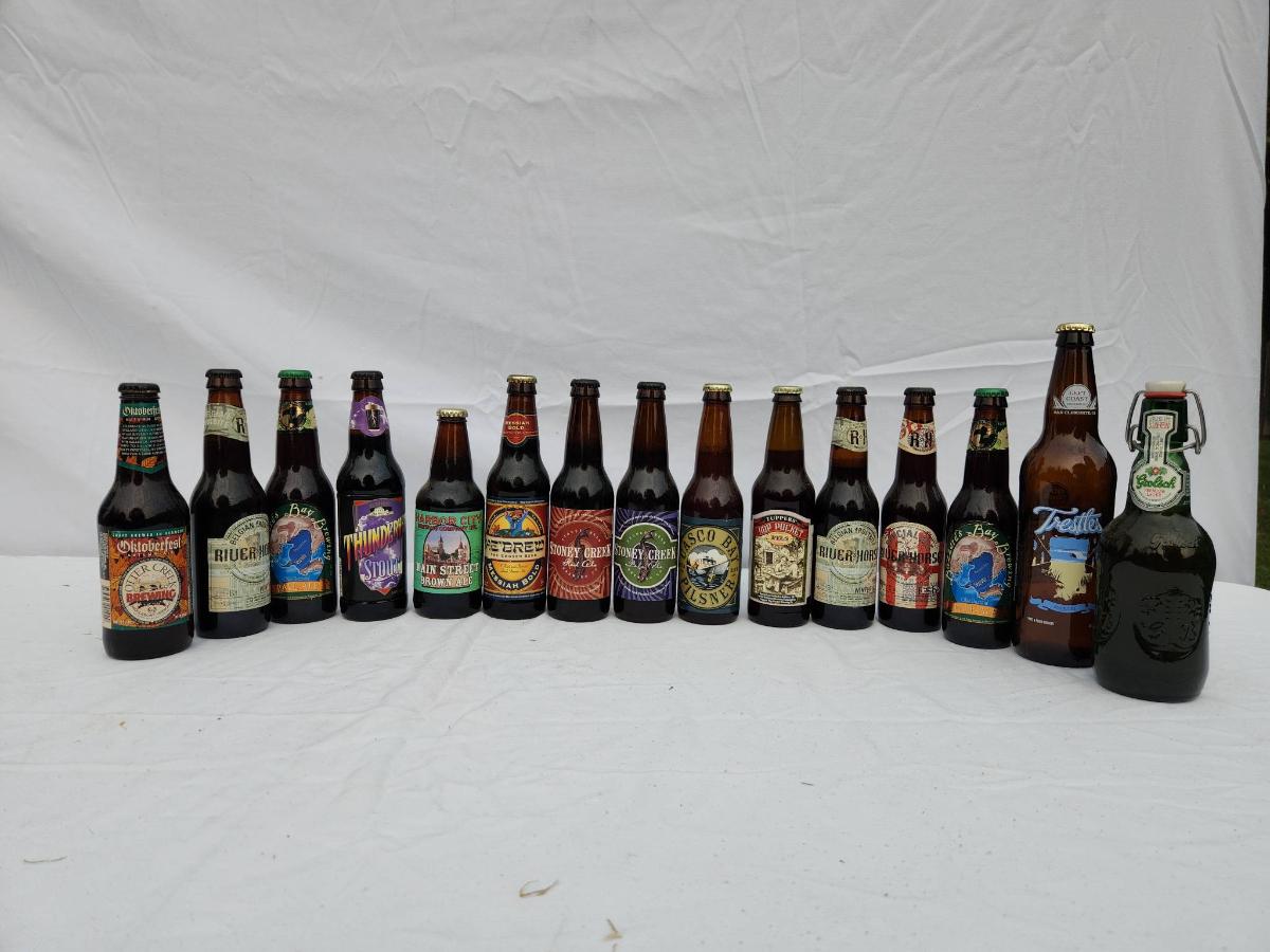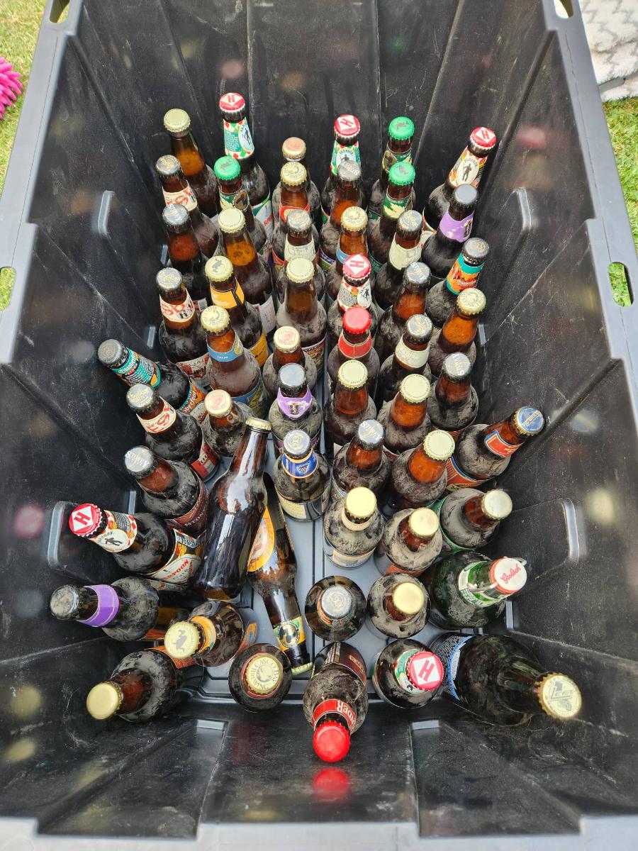 Craft beer bottles consisting of various brands and labels. The collection includes both sealed and possibly empty bottles (condition unspecified), with labels featuring a wide range of designs and themes. Some bottles have swing-top caps and are from smaller breweries. Includes approximately 40 bottles stored in a black plastic container. Specific details about contents, brands, or production dates are not provided.