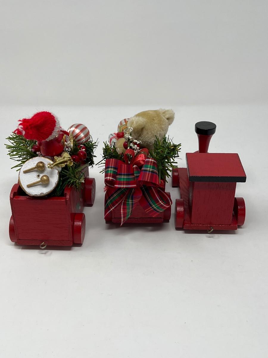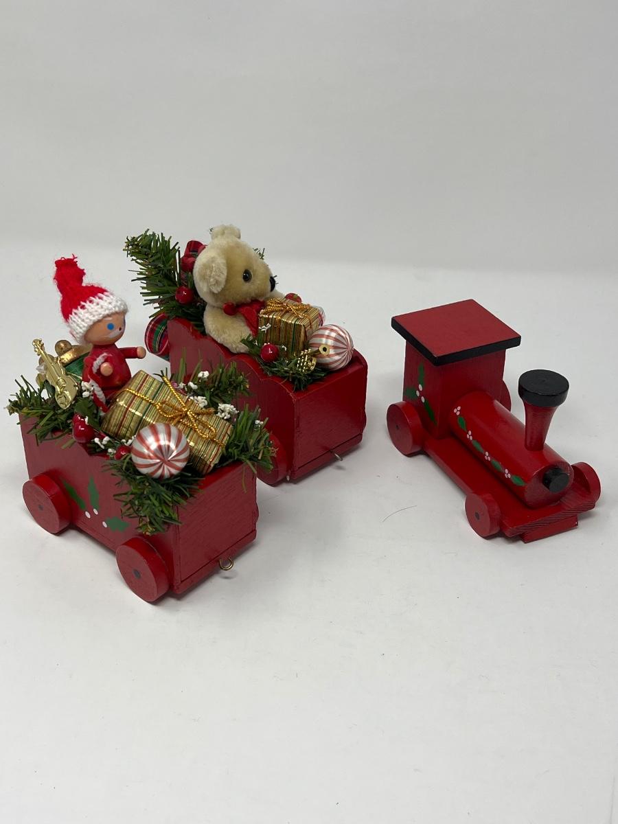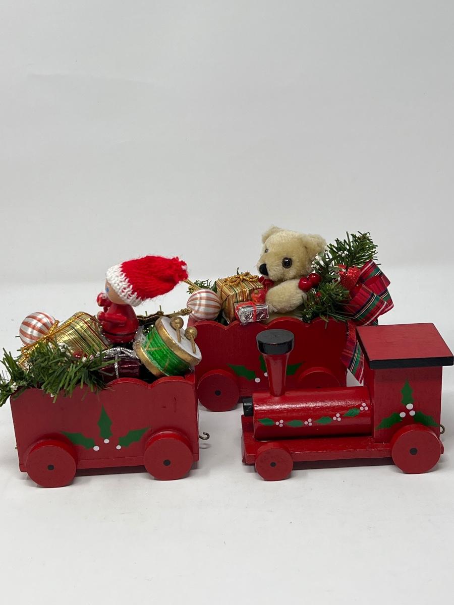 Wood train with engine, boxcar, and caboose filked with packages and toys. 4.25” long x 2” wide x 2.25” tall - each car. Total length when connected 13” long.