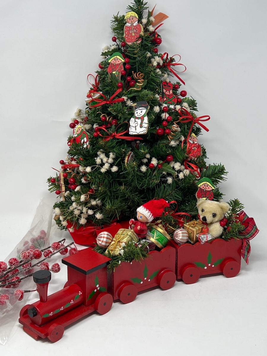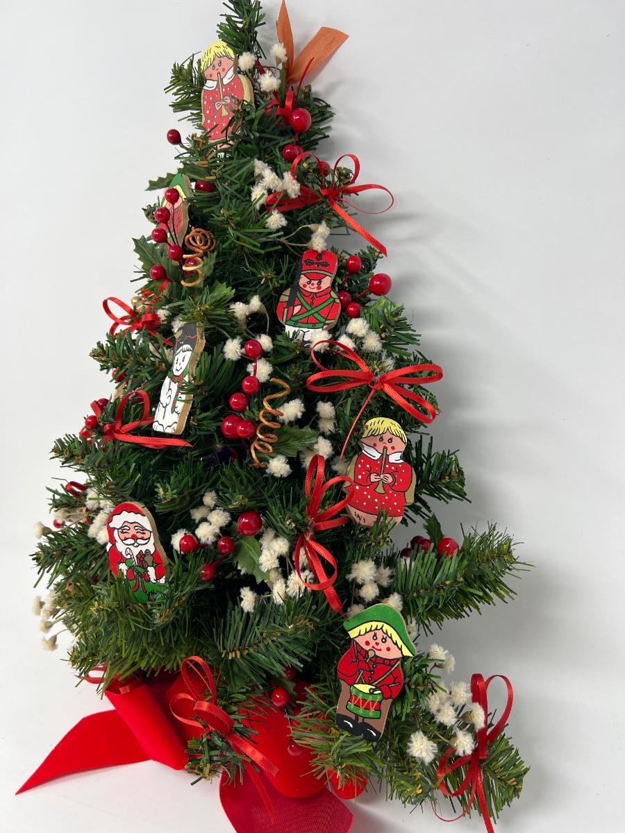 Tree is 17” tall and 13” wide at base. Crafted with faux fir boughs, painted wood figures, toys and Red Bow. Craft Cottage, Redmond. Retailed for $37.50.