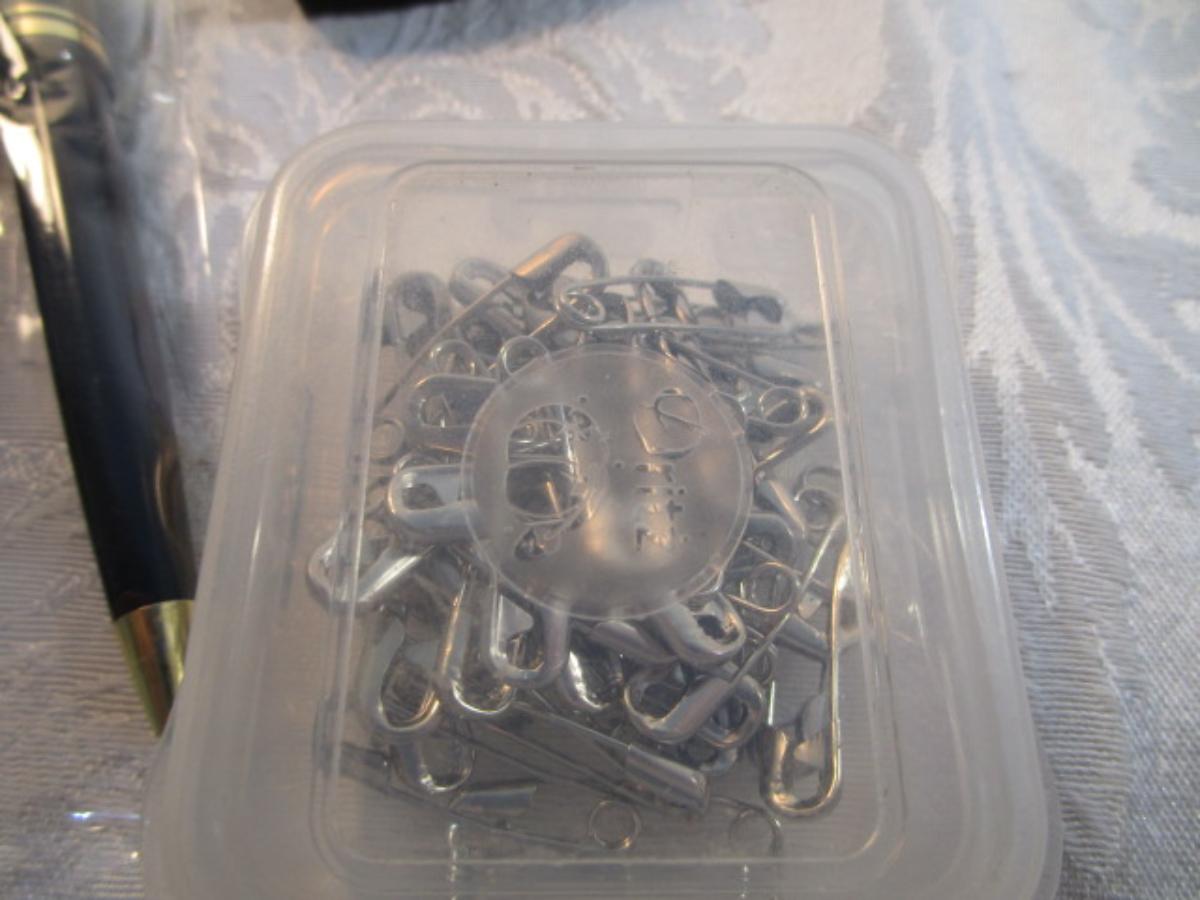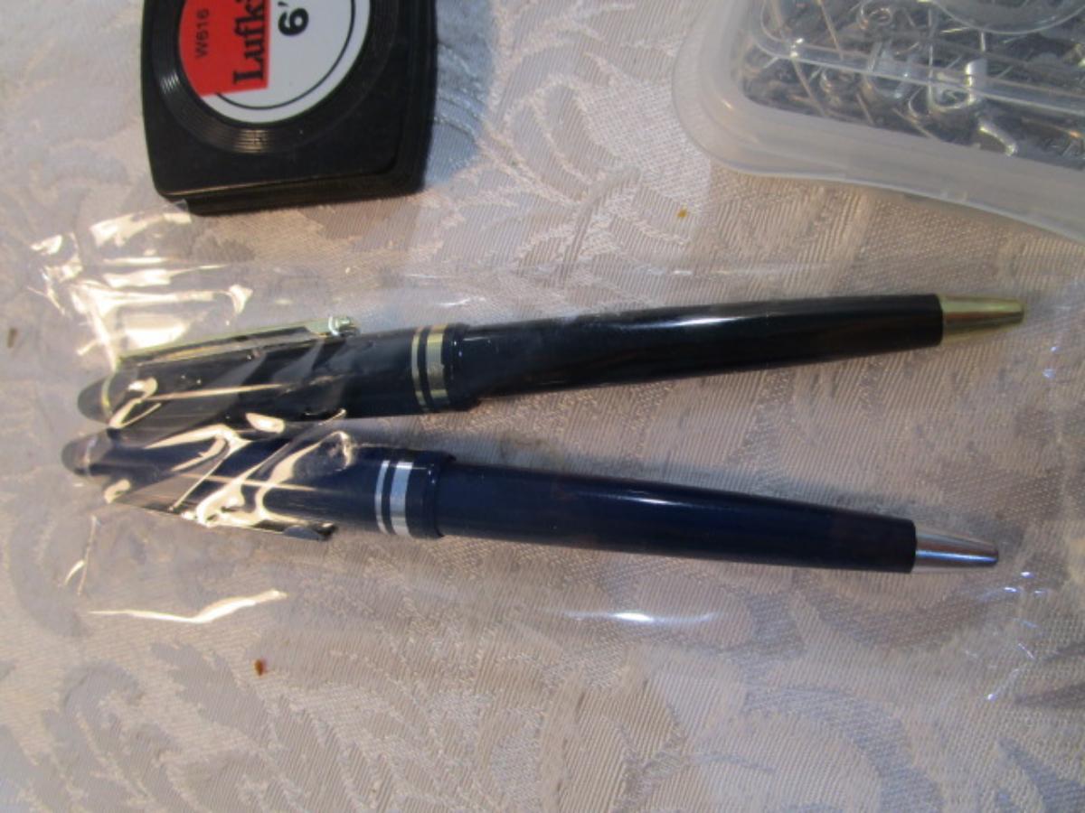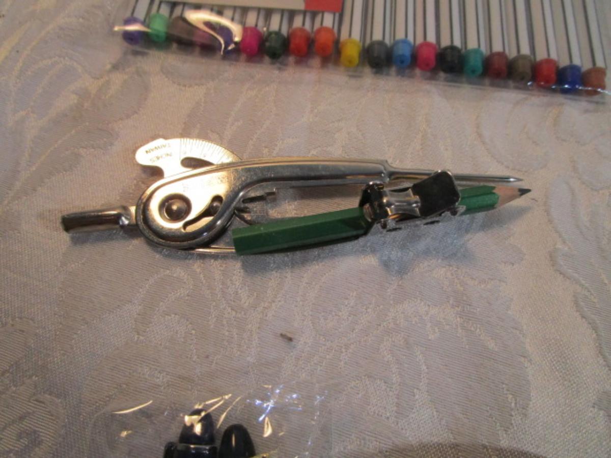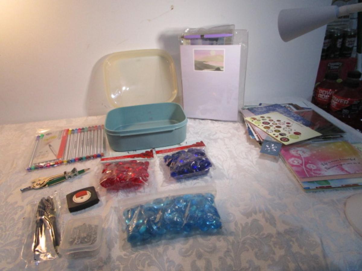 1 hinge-lid plastic container, stationery kit, greeting cards & Christmas cards, 2 new pkg Acrylic gems (blue & red), teal glass gems, 6' measuring tape, compass, 20 fine markers, 2 pens, container of safety pins