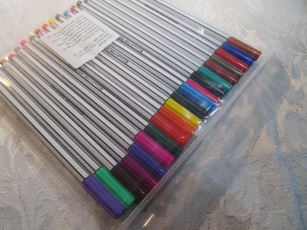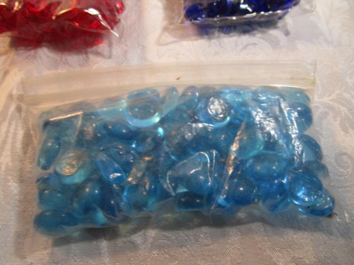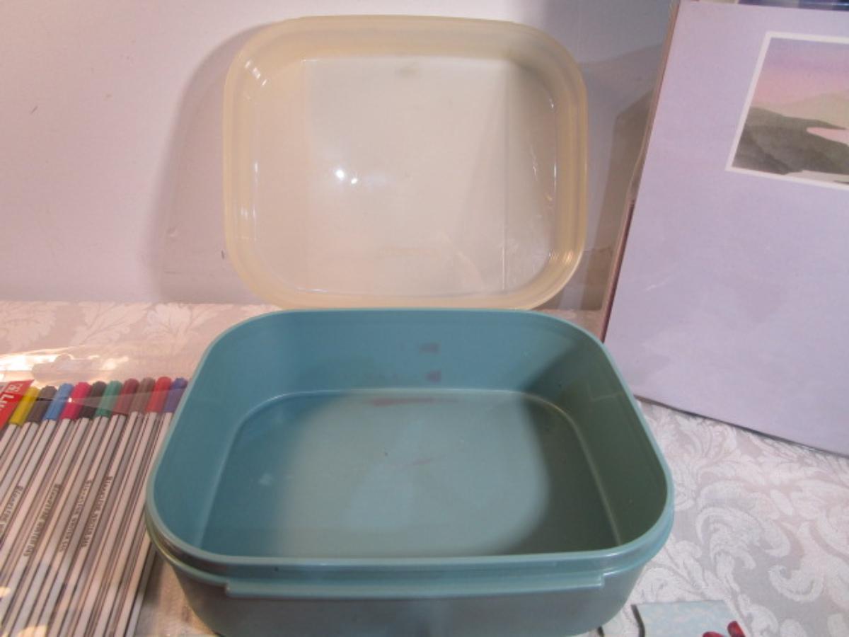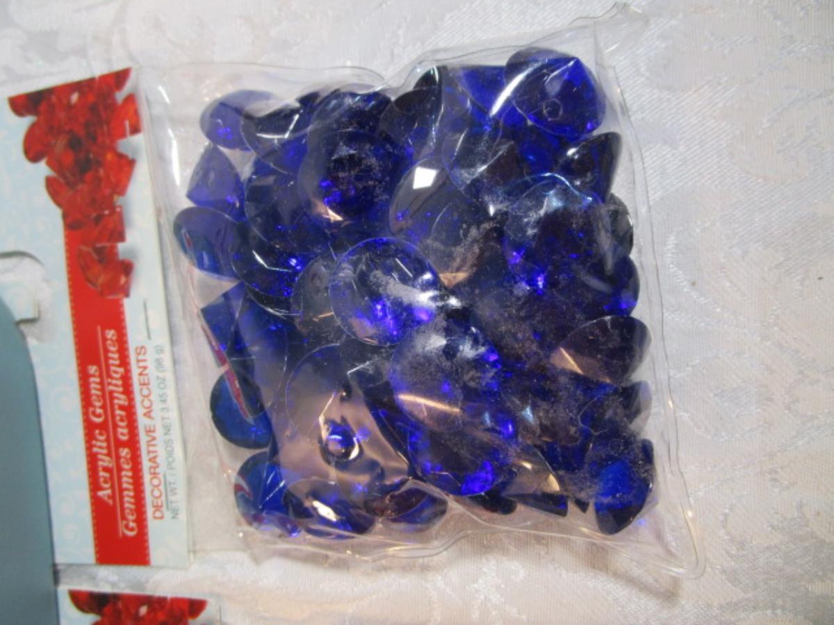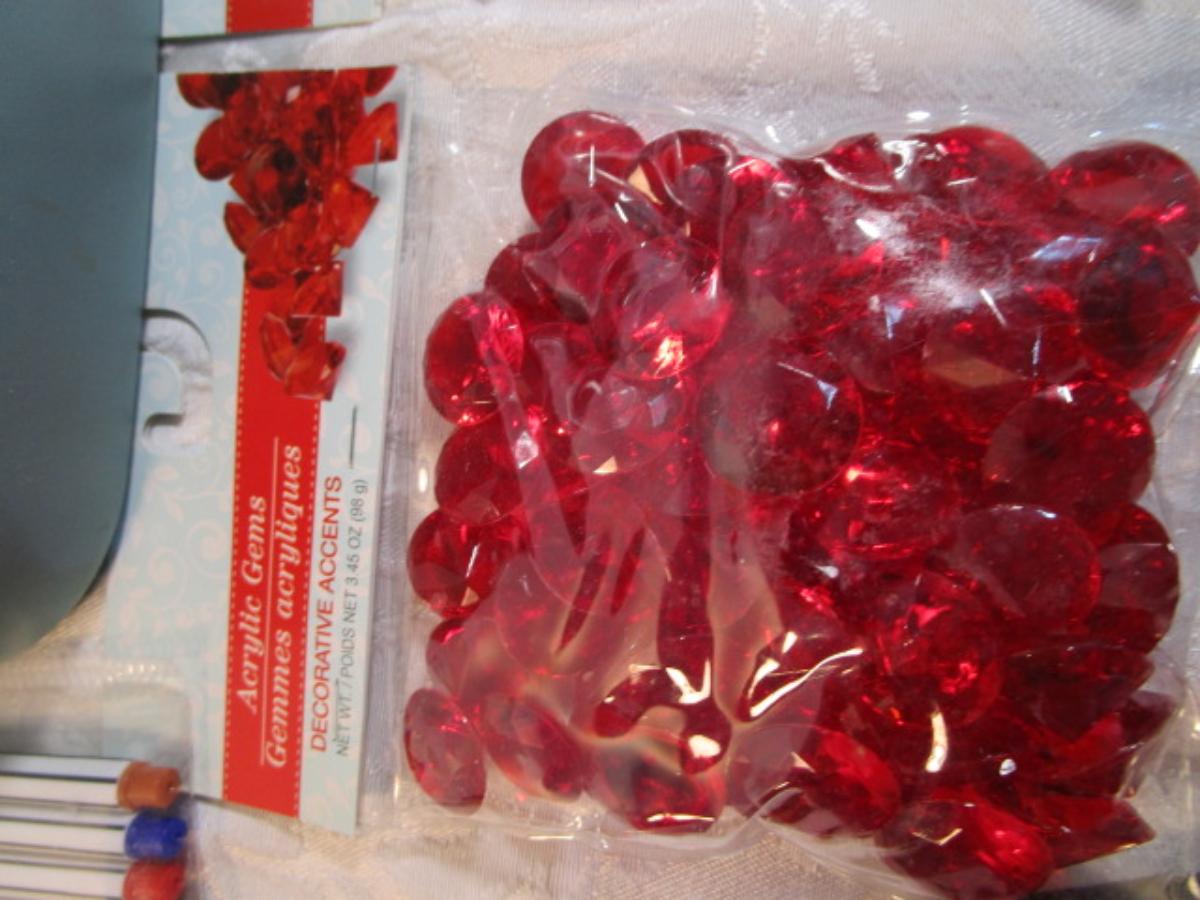1 hinge-lid plastic container, stationery kit, greeting cards & Christmas cards, 2 new pkg Acrylic gems (blue & red), teal glass gems, 6' measuring tape, compass, 20 fine markers, 2 pens, container of safety pins