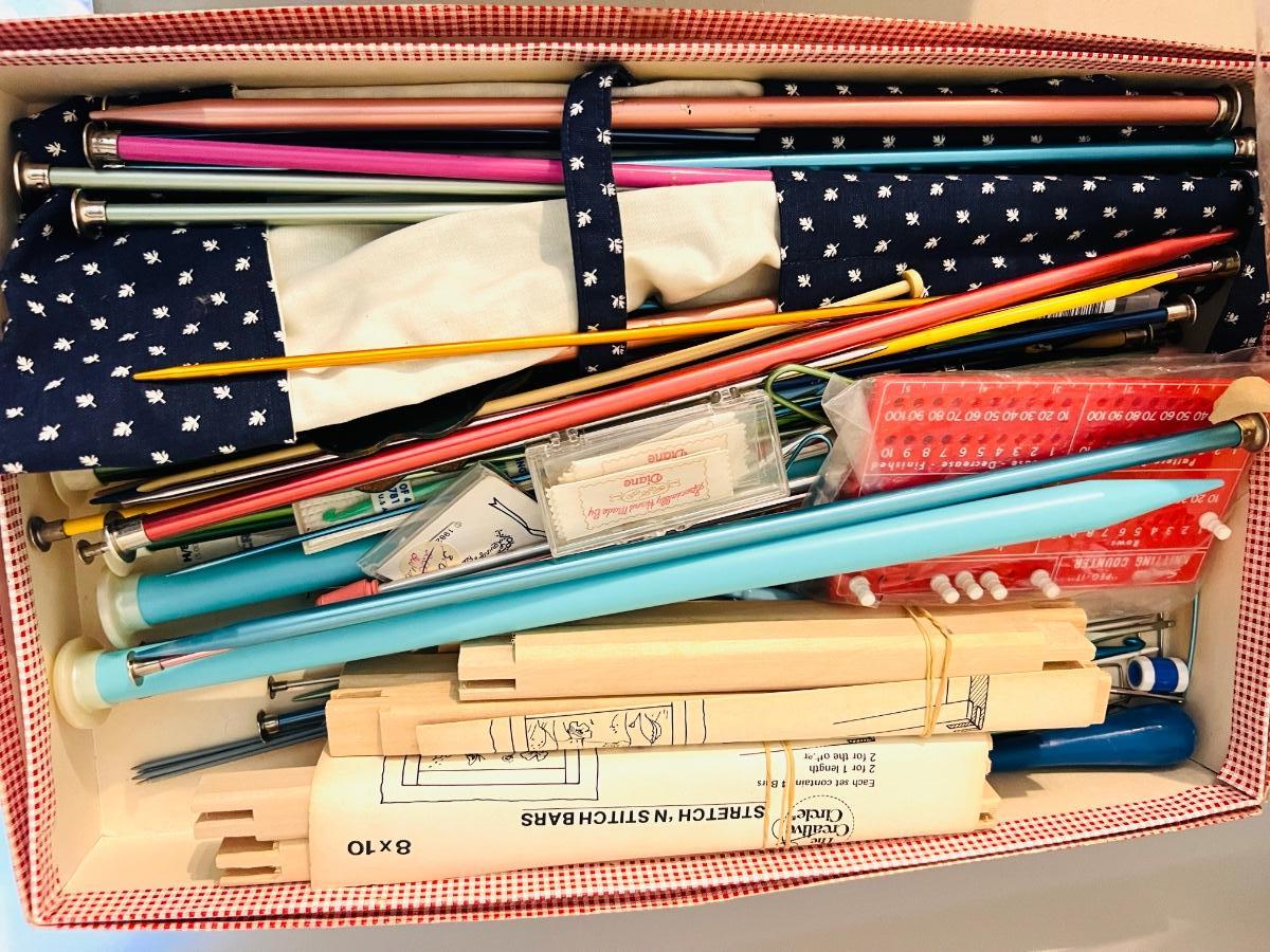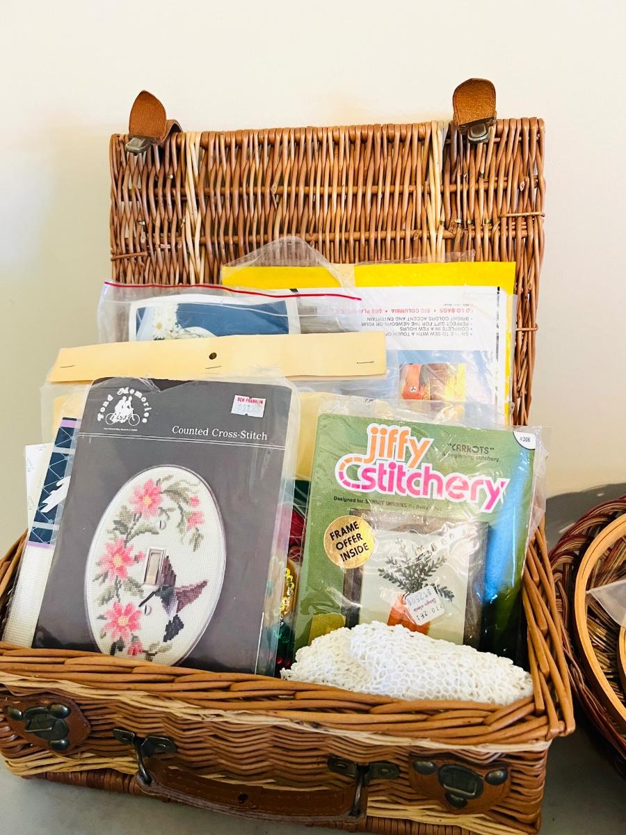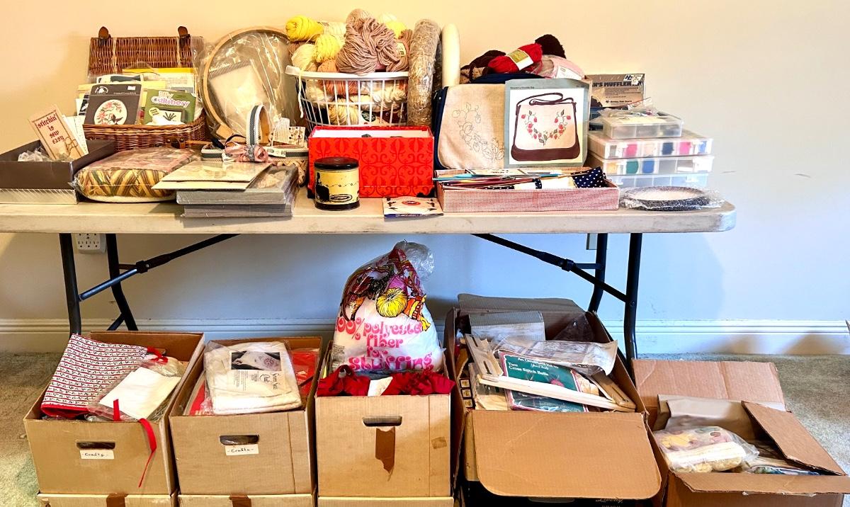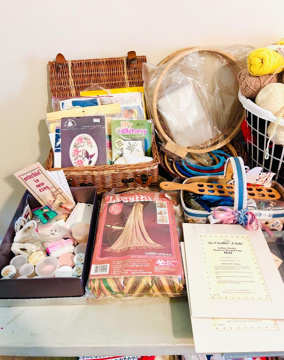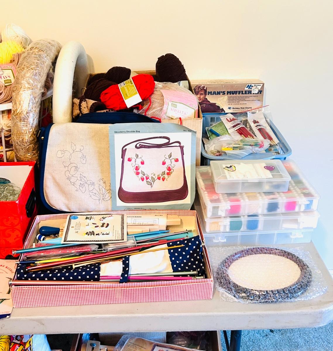 Large lot of patterns, some fabric, yarn and so much more! Everything pictured plus a bag of yarn. Table not included.