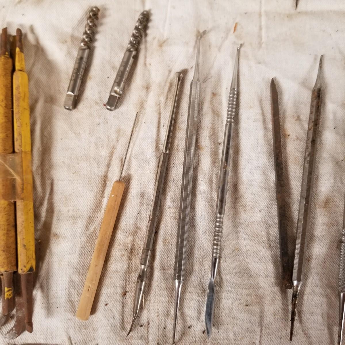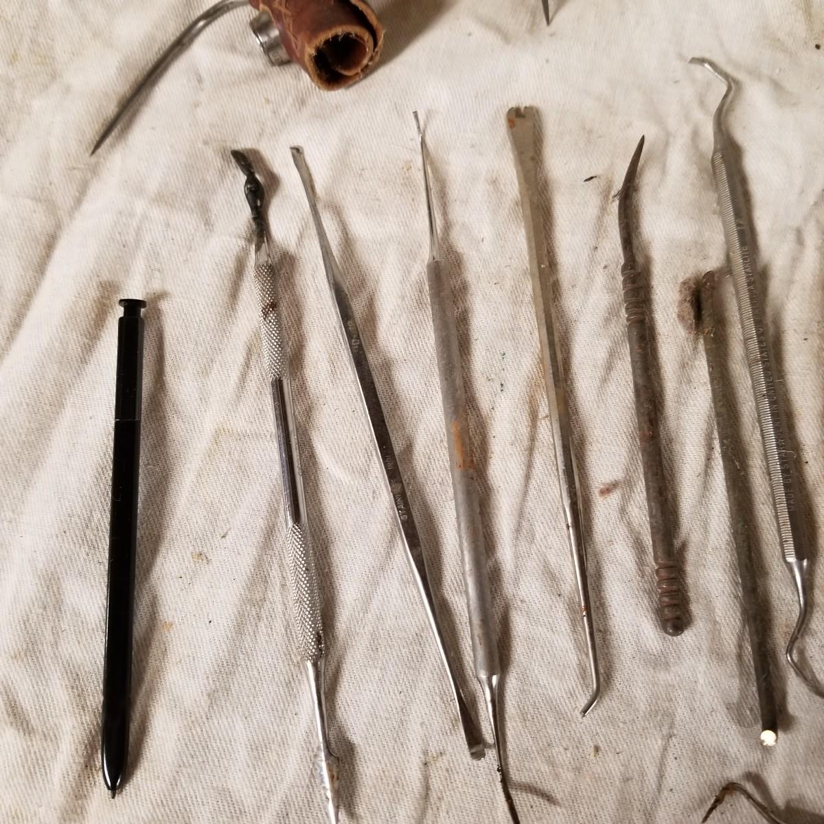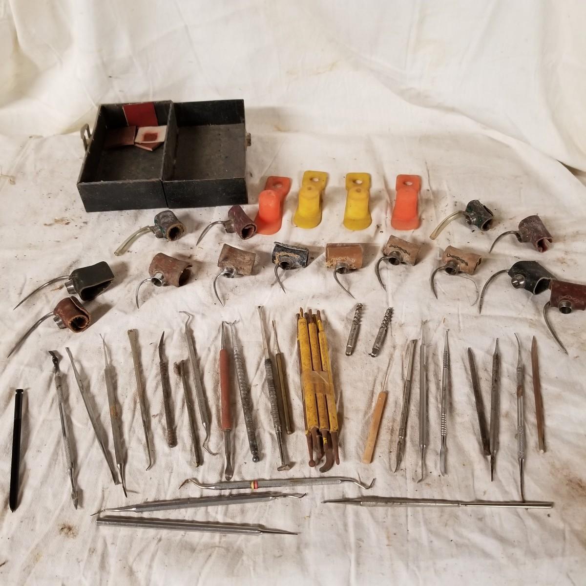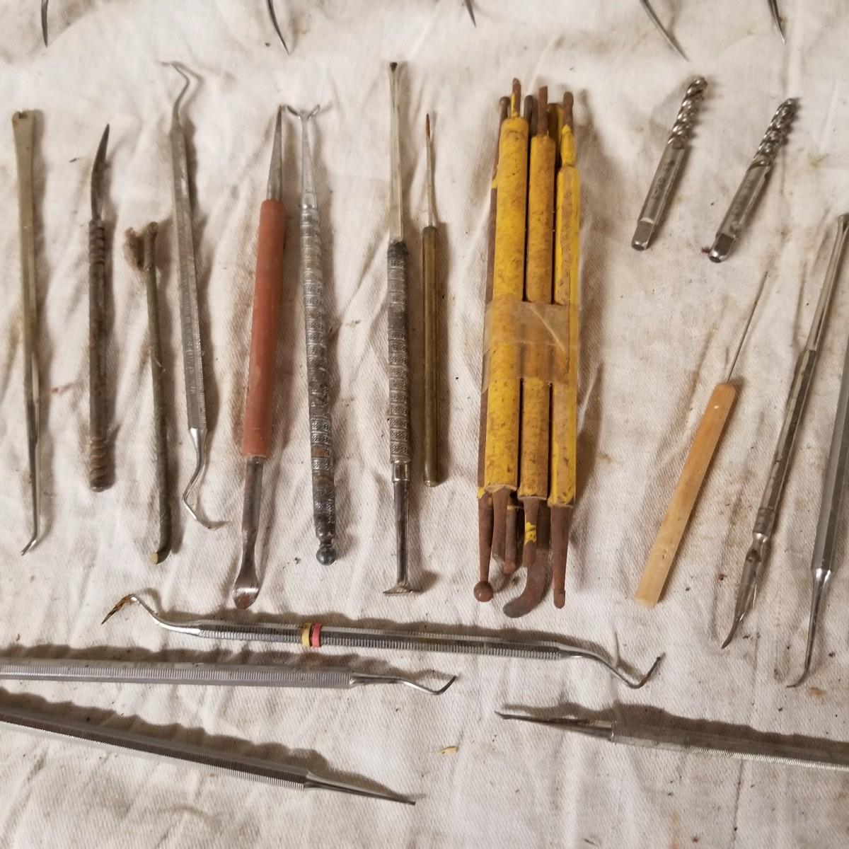 Collection of dental picks for craft or sculpting work.  Also includes leather items with curved hooks, exact use uncertain.  About fifty pieces.  Shipping available.