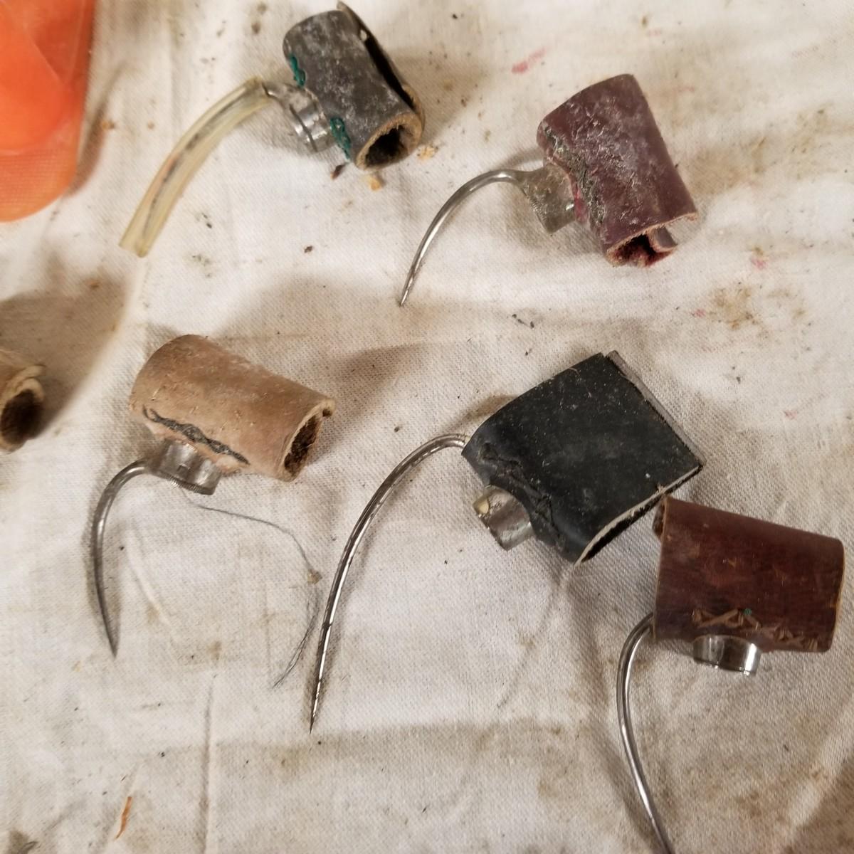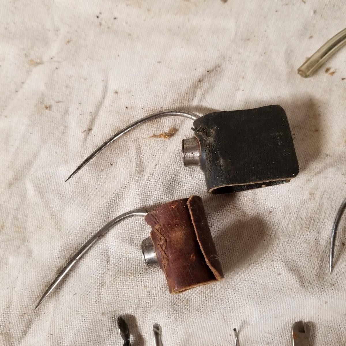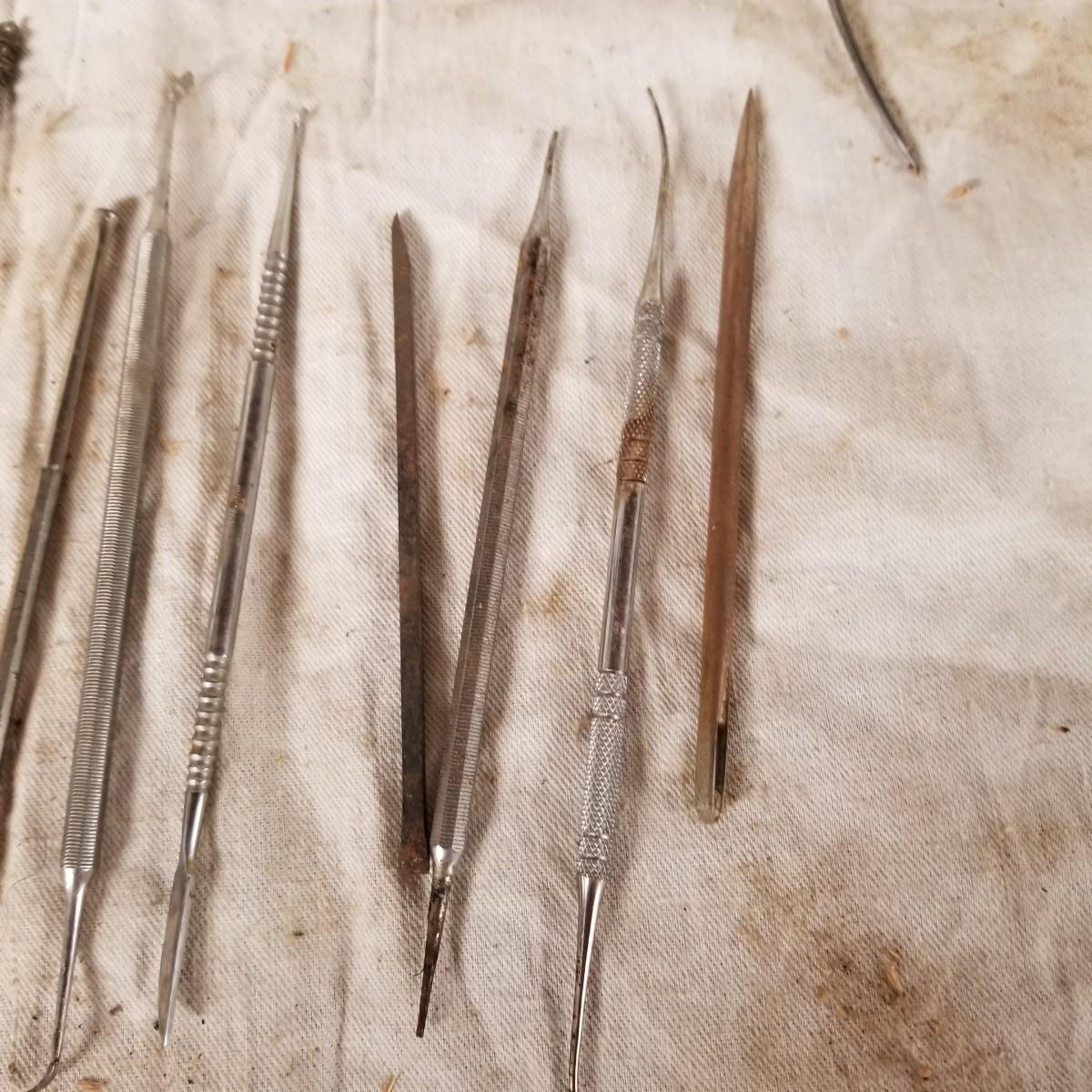 Collection of dental picks for craft or sculpting work.  Also includes leather items with curved hooks, exact use uncertain.  About fifty pieces.  Shipping available.