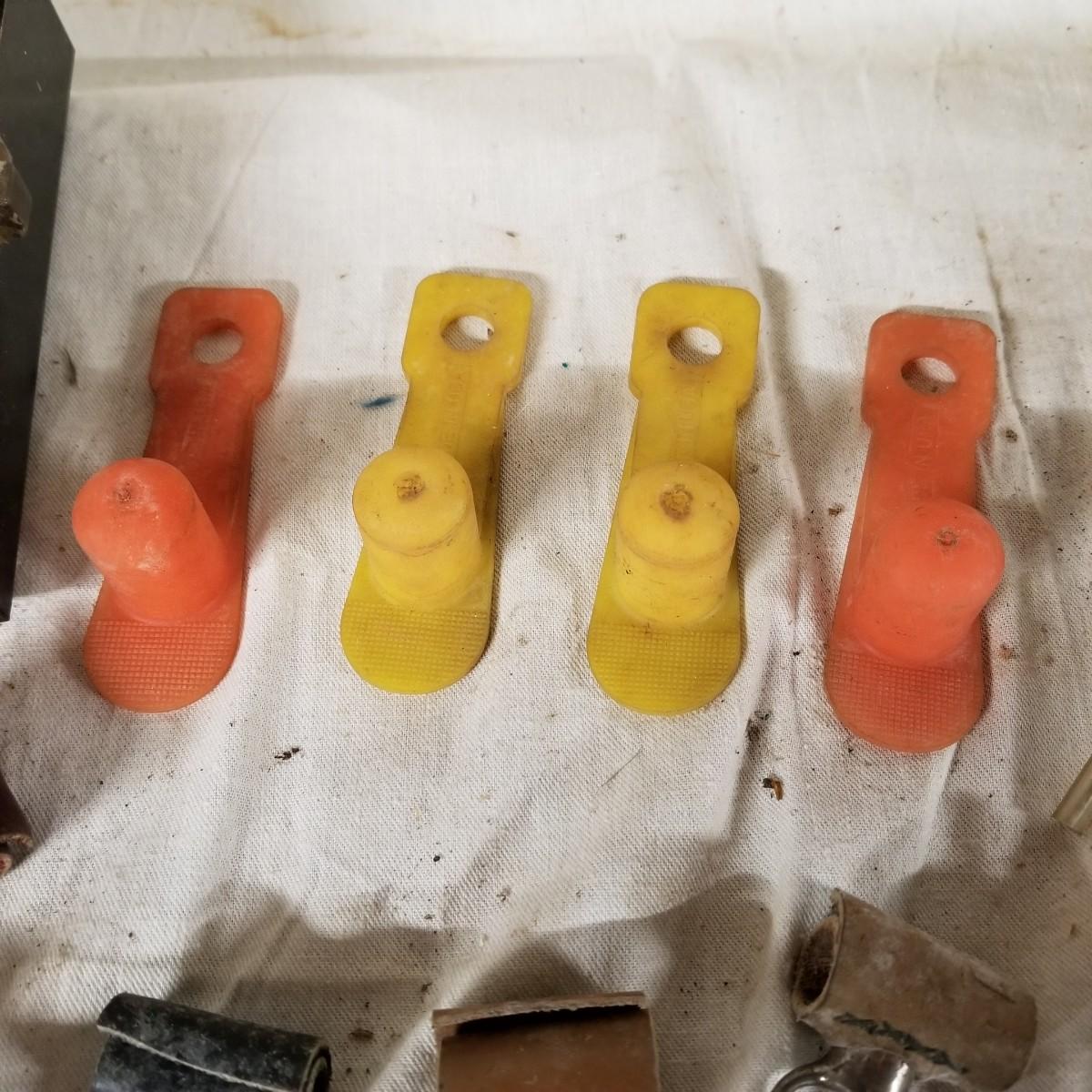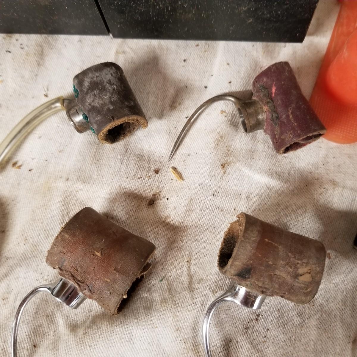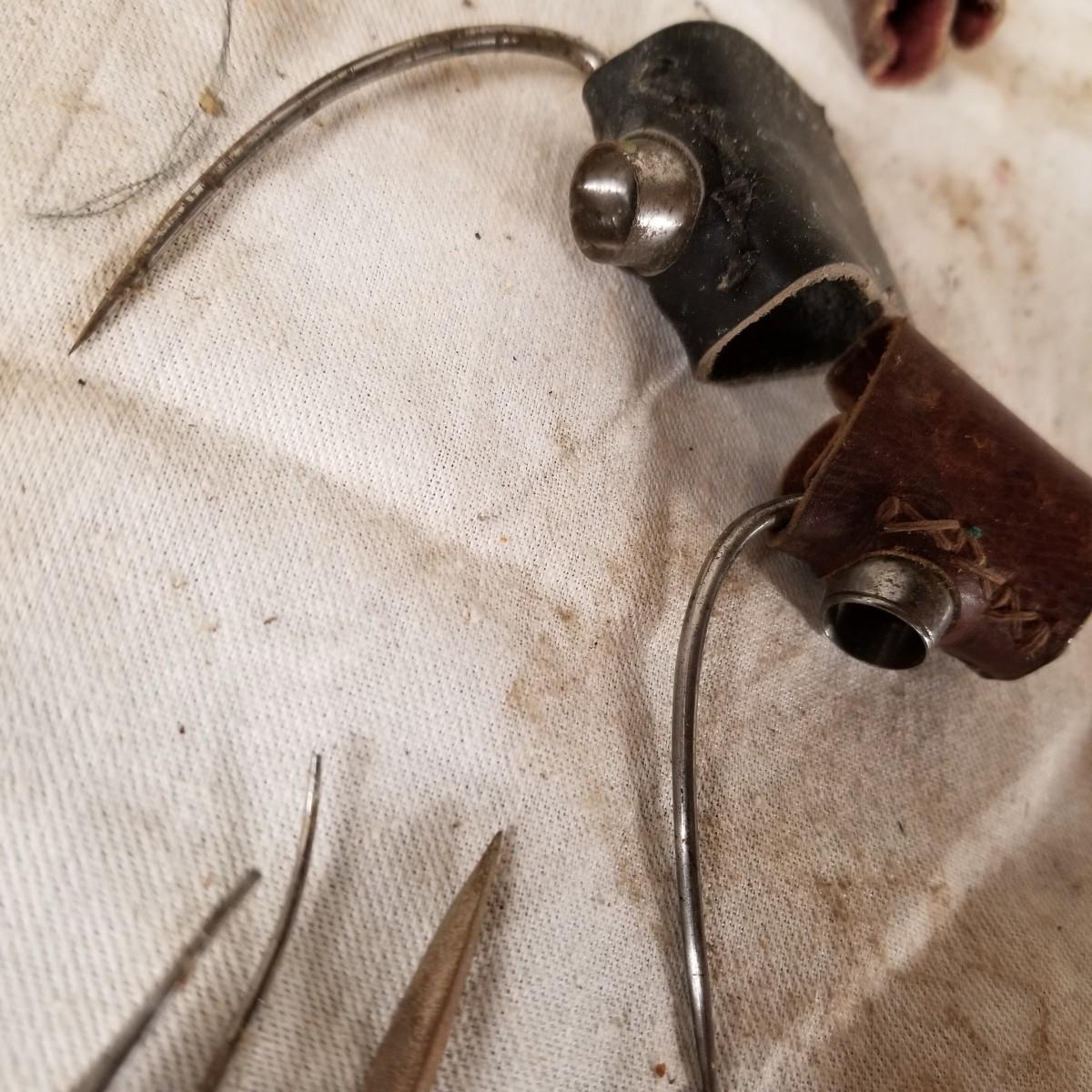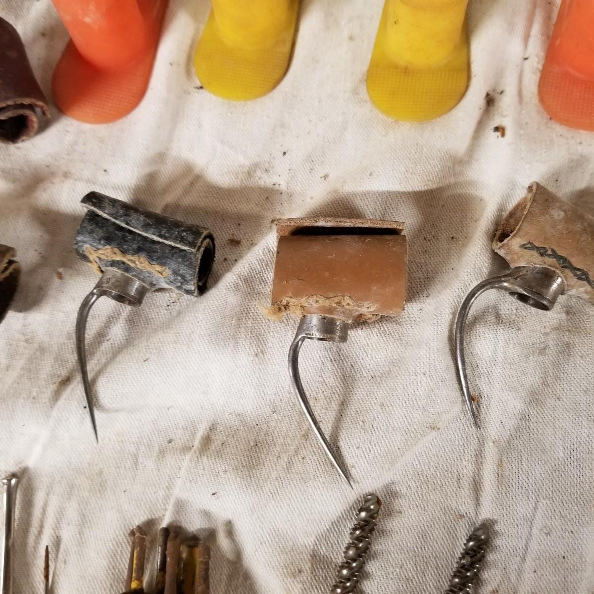Collection of dental picks for craft or sculpting work.  Also includes leather items with curved hooks, exact use uncertain.  About fifty pieces.  Shipping available.