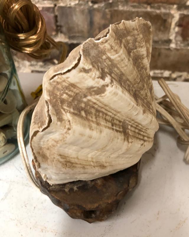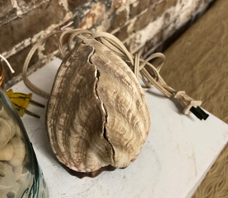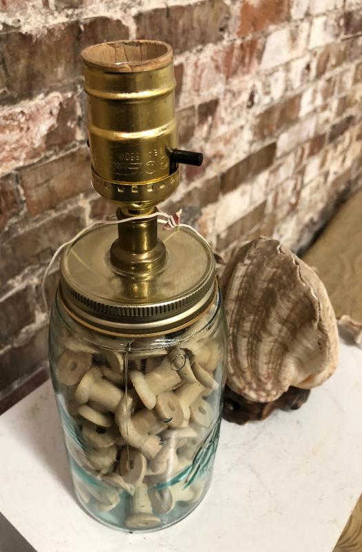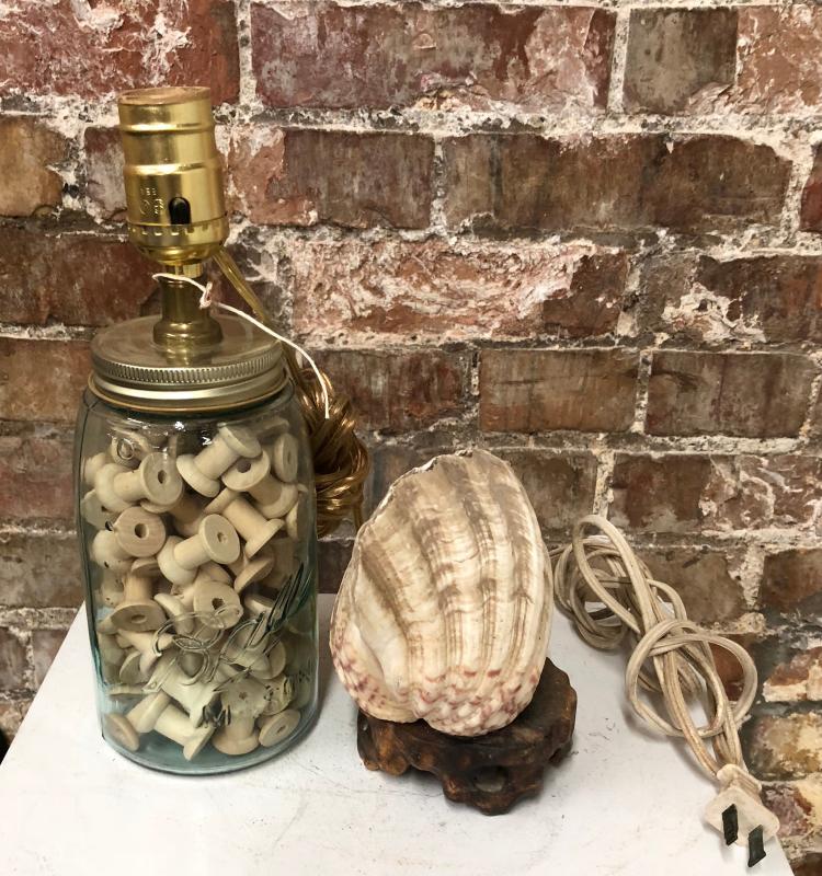 Here are a pair of table lamps..a jar lamp with wooden spools and one made from a seashell..as shown...