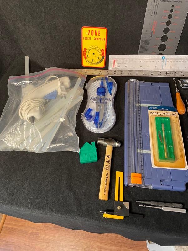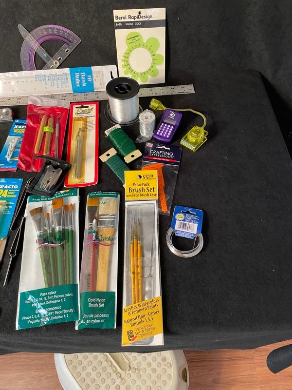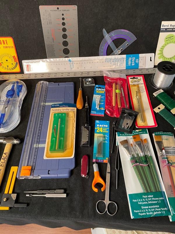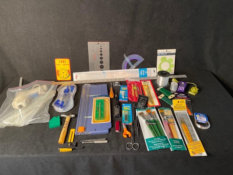 Includes: paint brushes, craft wire, fishing line, protractor, exacto knives, metal yardstick, paper cutter, awl, glue gun. glue sticks, tape measure, sculpture tools, tweezers,