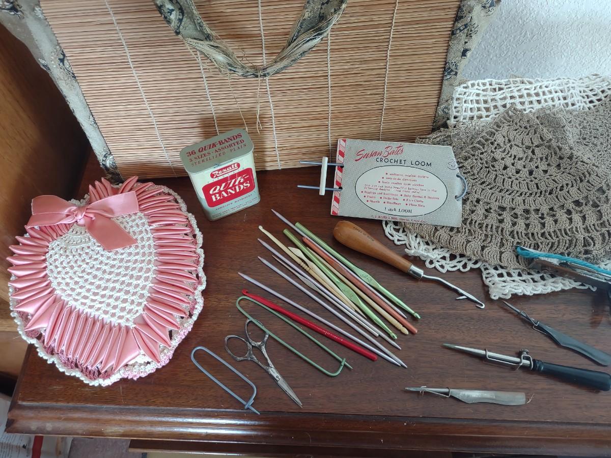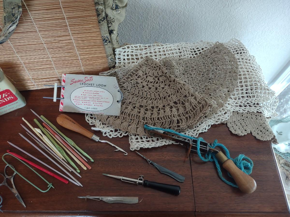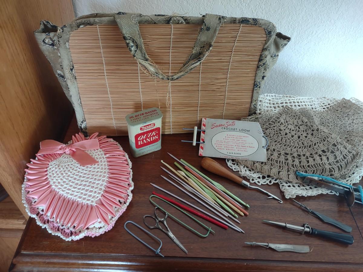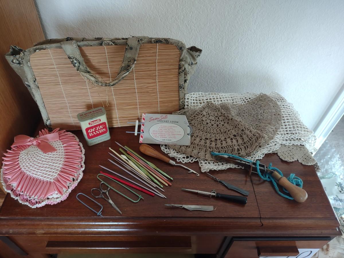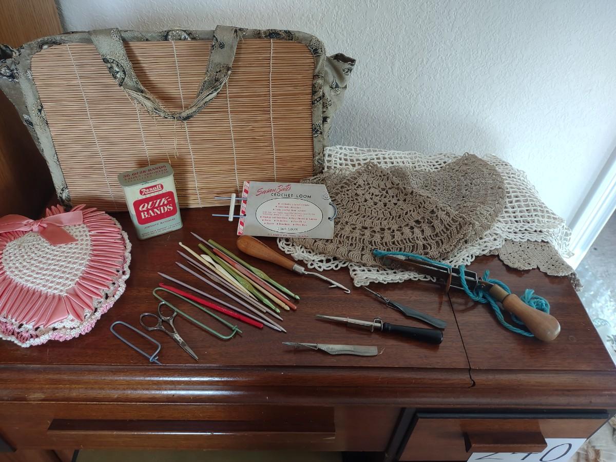 CRAFT TOTE, CROCHET AND LATCH HOOK NEEDLES, LARGE DOILIES AND MORE