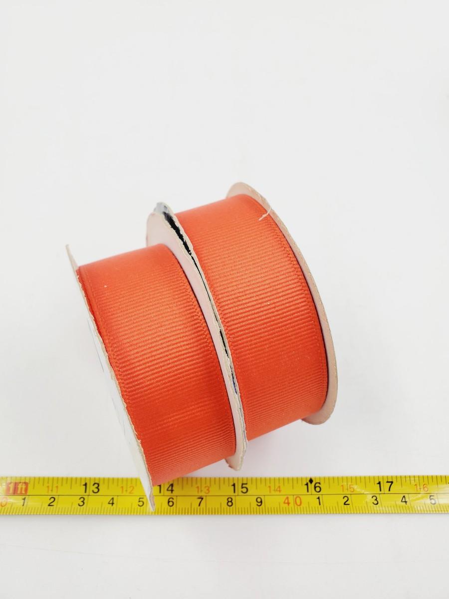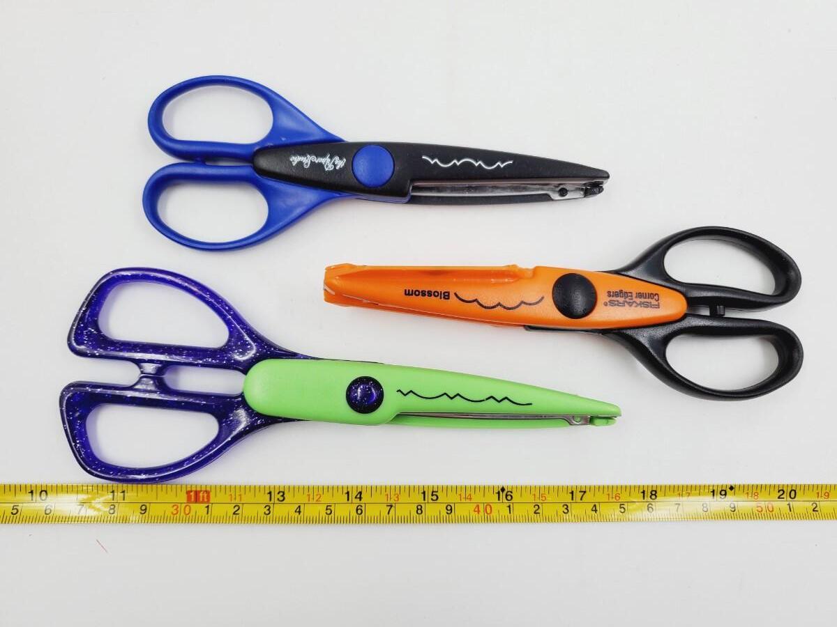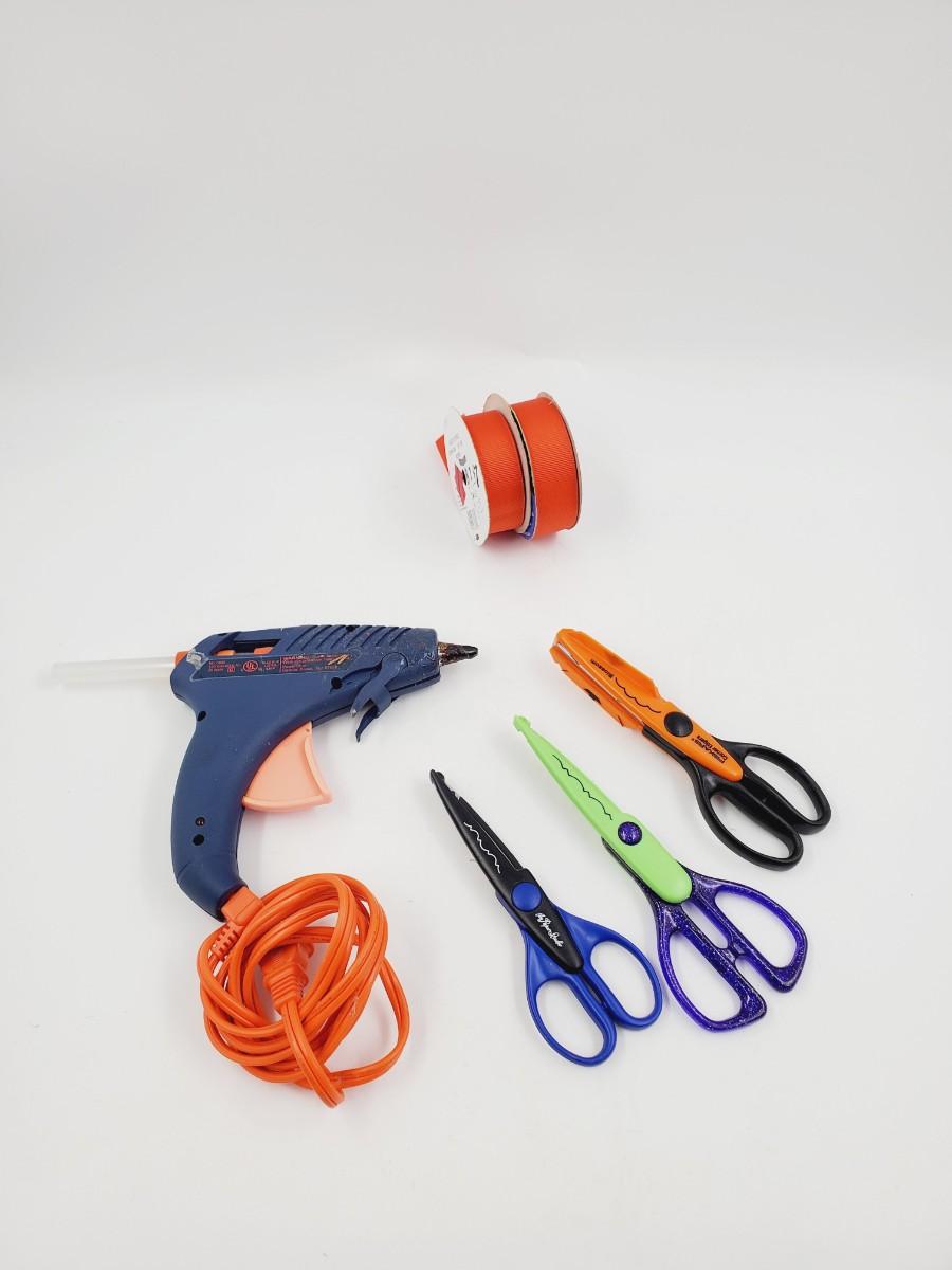 Hot glue gun with heavy duty cord and a glue stick, 3 pairs decorative edge scissors, and orange ribbon.