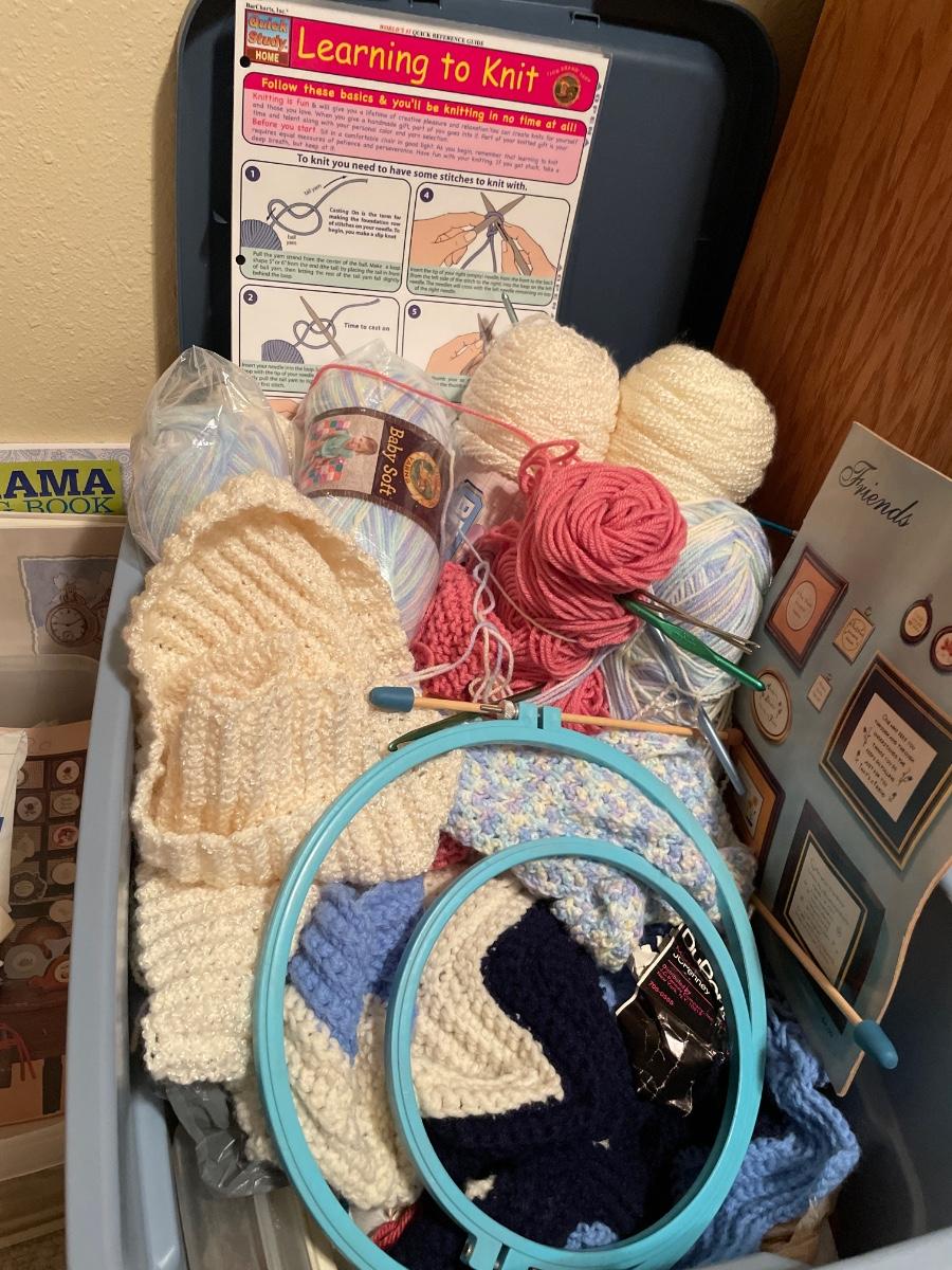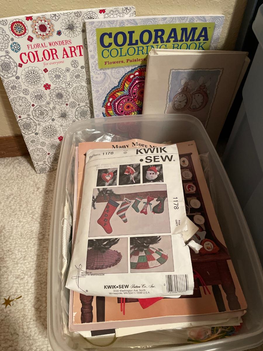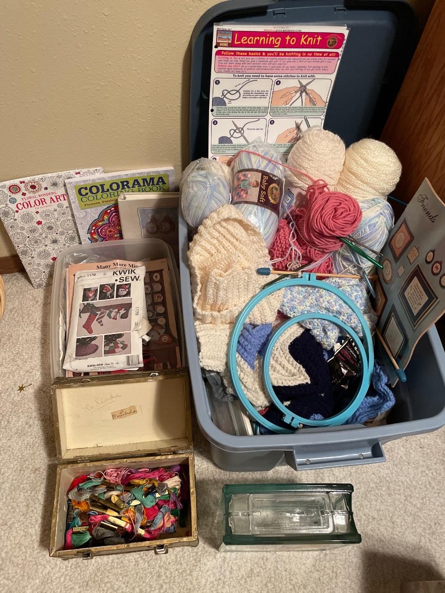 Includes floss, yarn, coloring books, totes