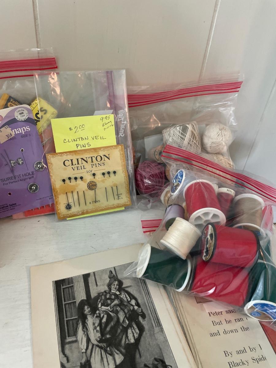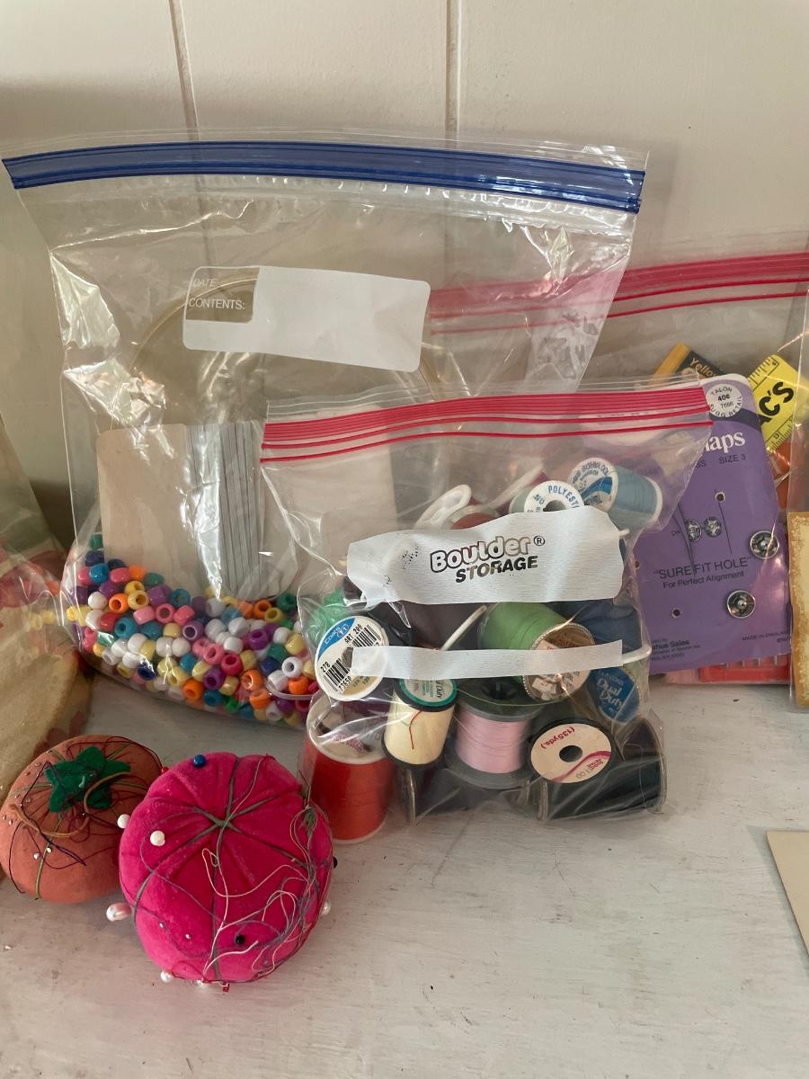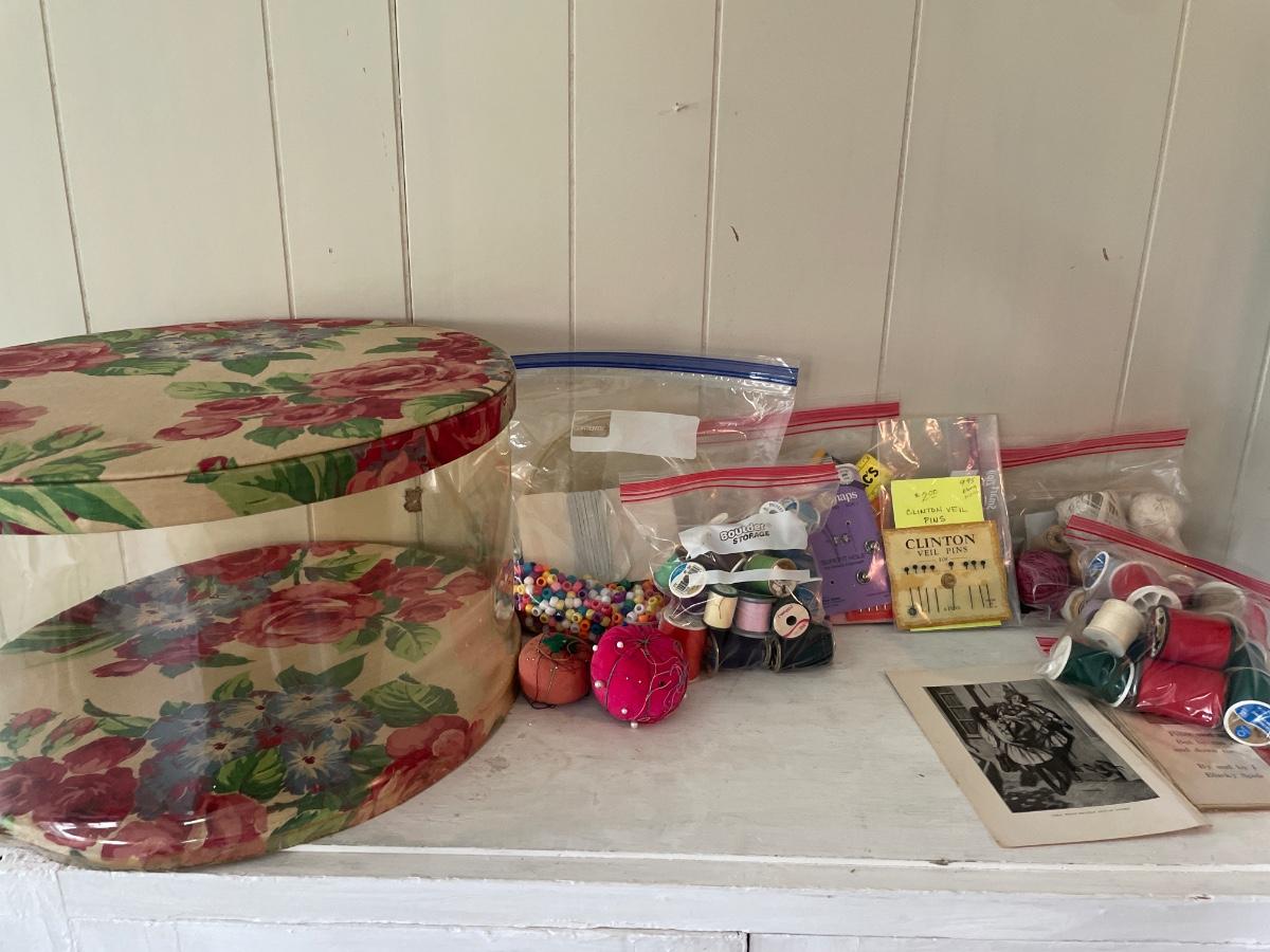 Storage is plastic with floral top and bottom with crafting items