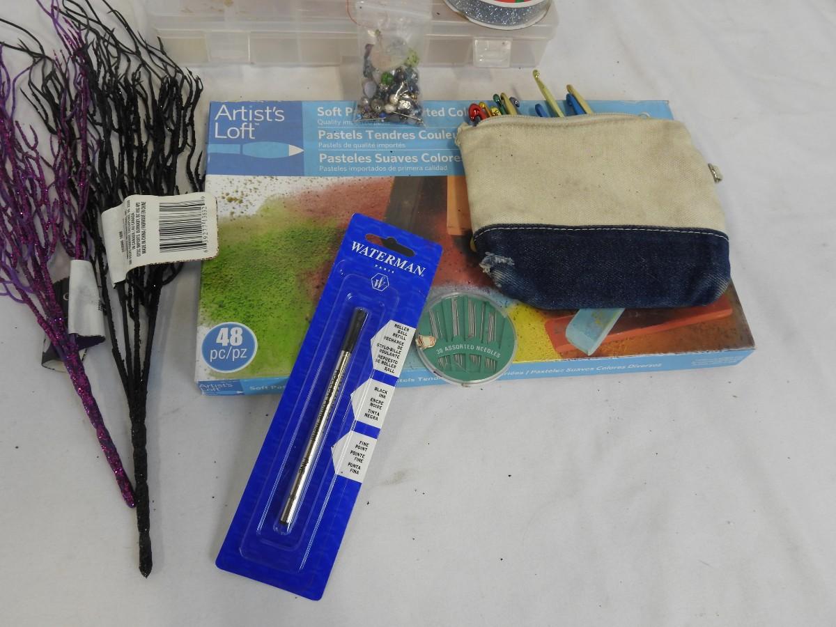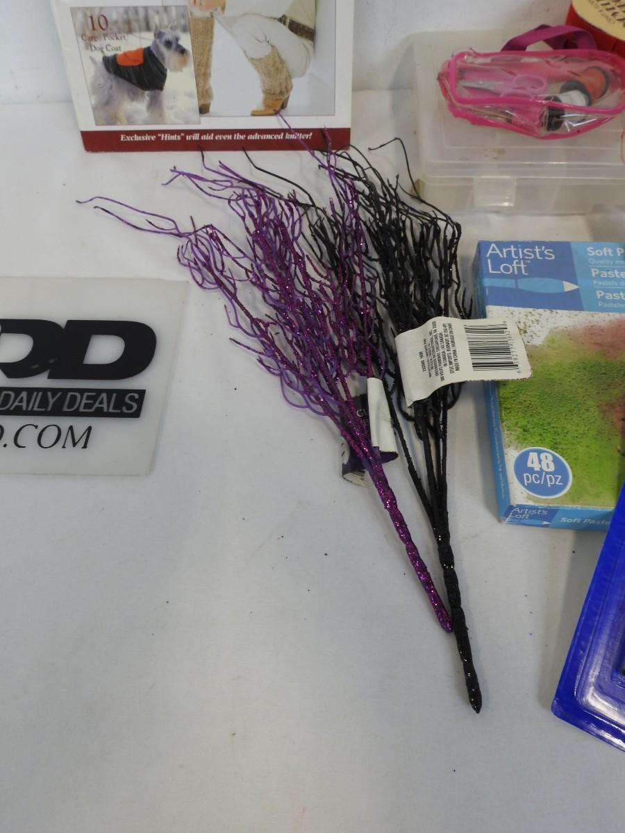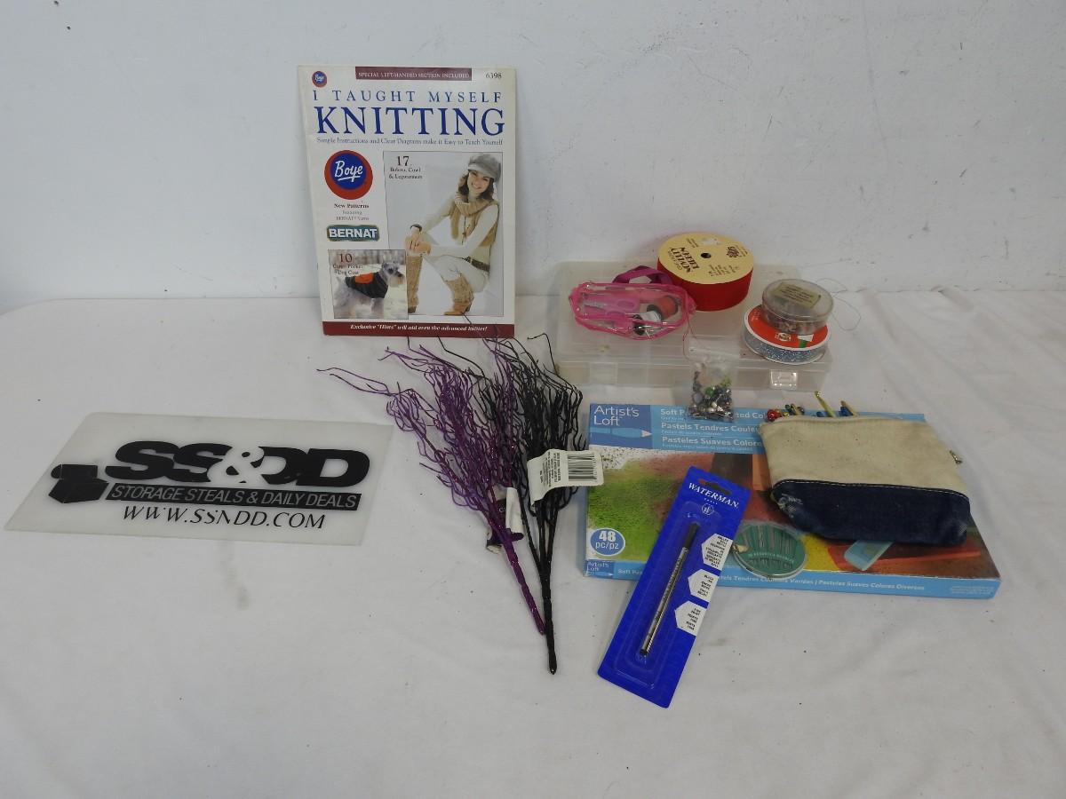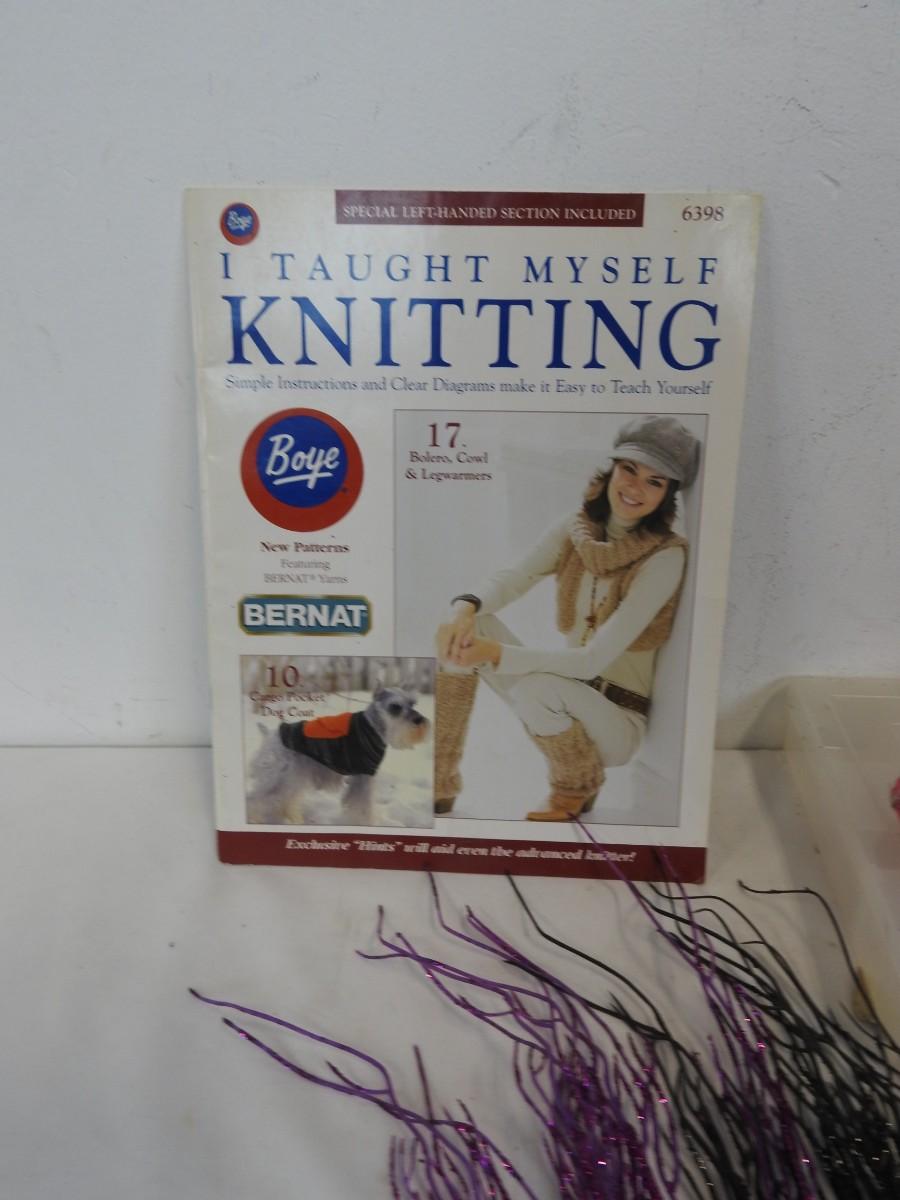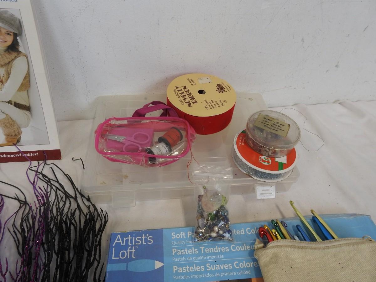 Crafting Lot: Knitting Book, Ribbon, Knitting Needles, Pastels, String, Etc