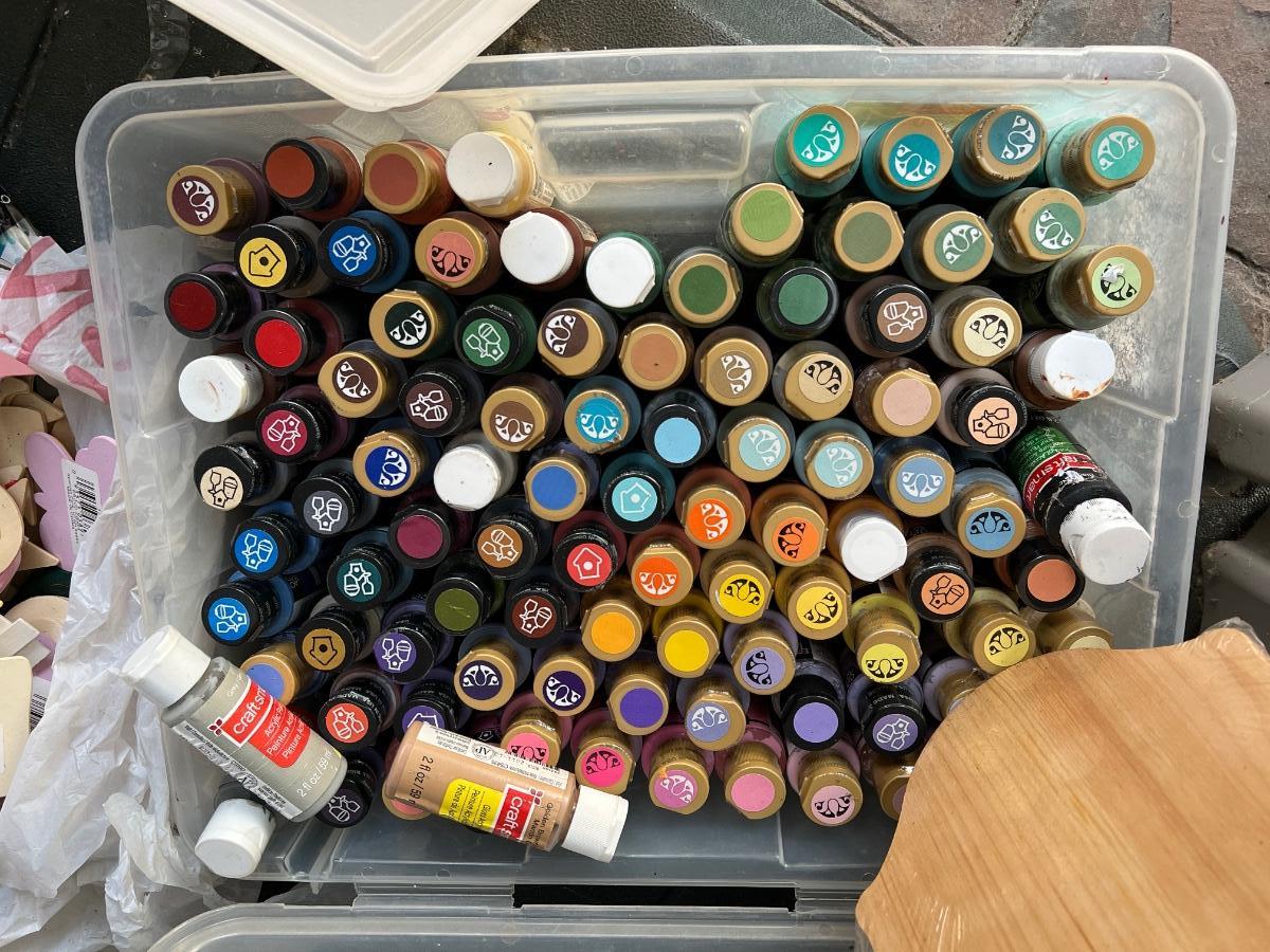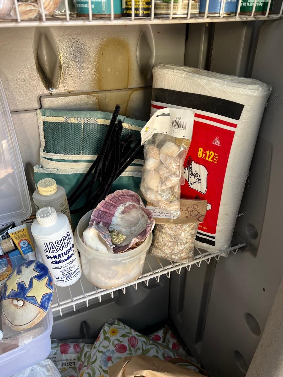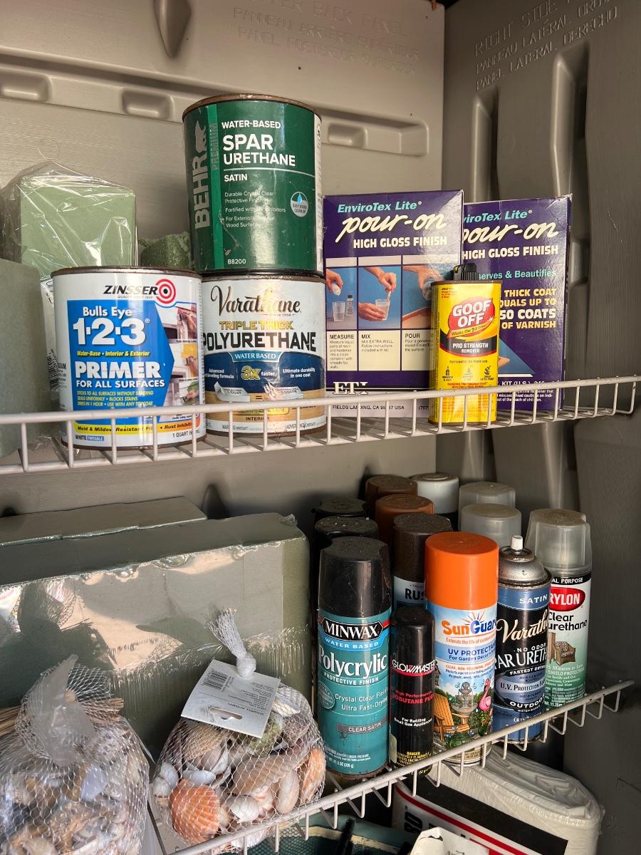 Contents only . Cabinet is lot 900 This lot includes acrylic paints, seashells, stencil, foam wall stamps, floral foam blocks, and crafting supplies.