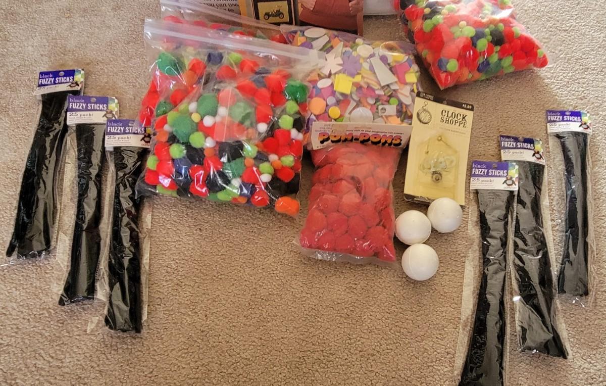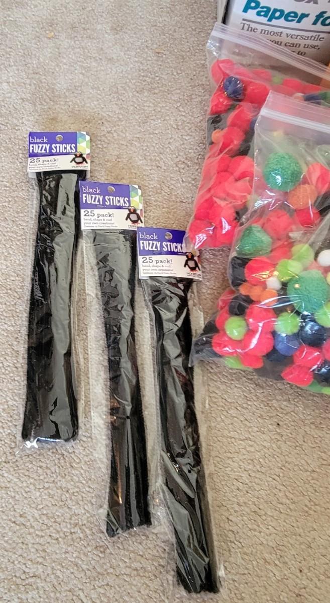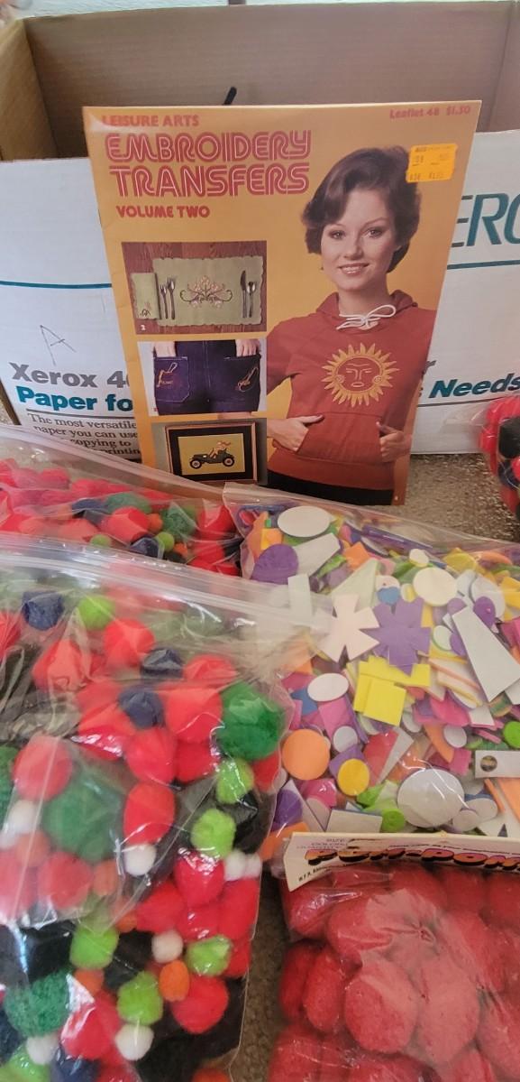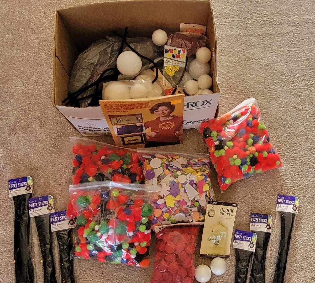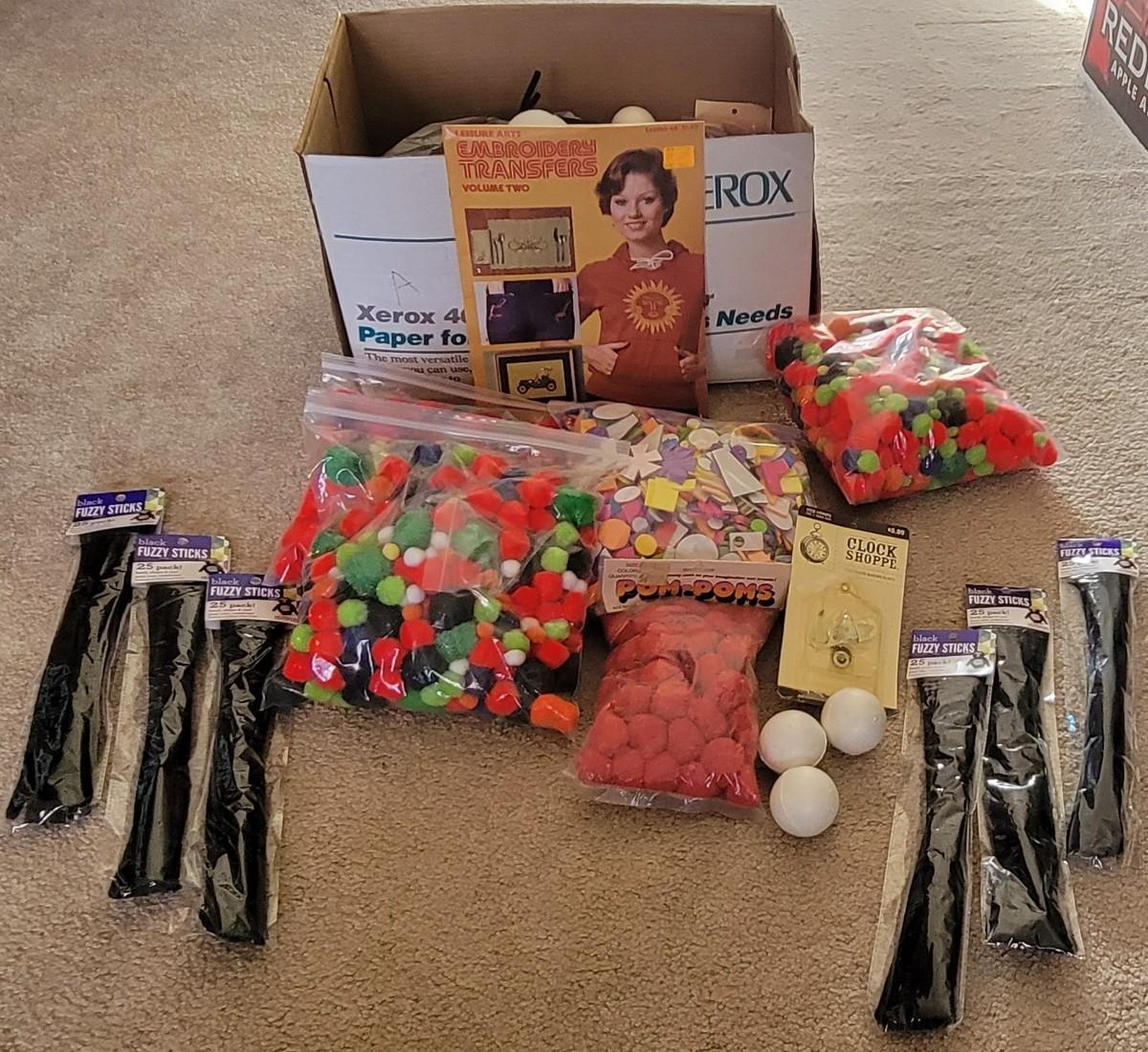 This is a box lot of crafting items and supplies. Pipe cleaners, fuzzy buttons, assorted plastic balls, and a whole lot more are contained within.