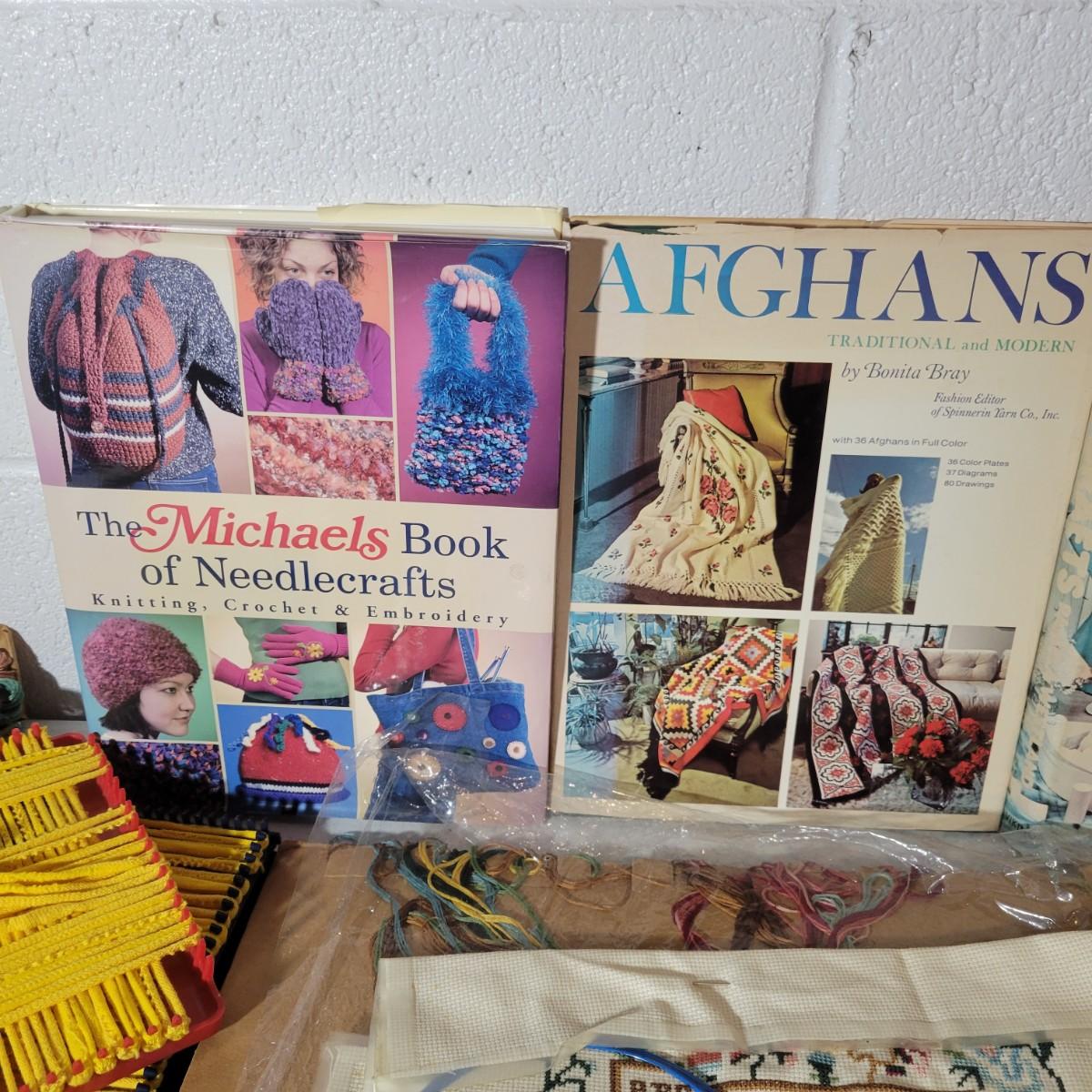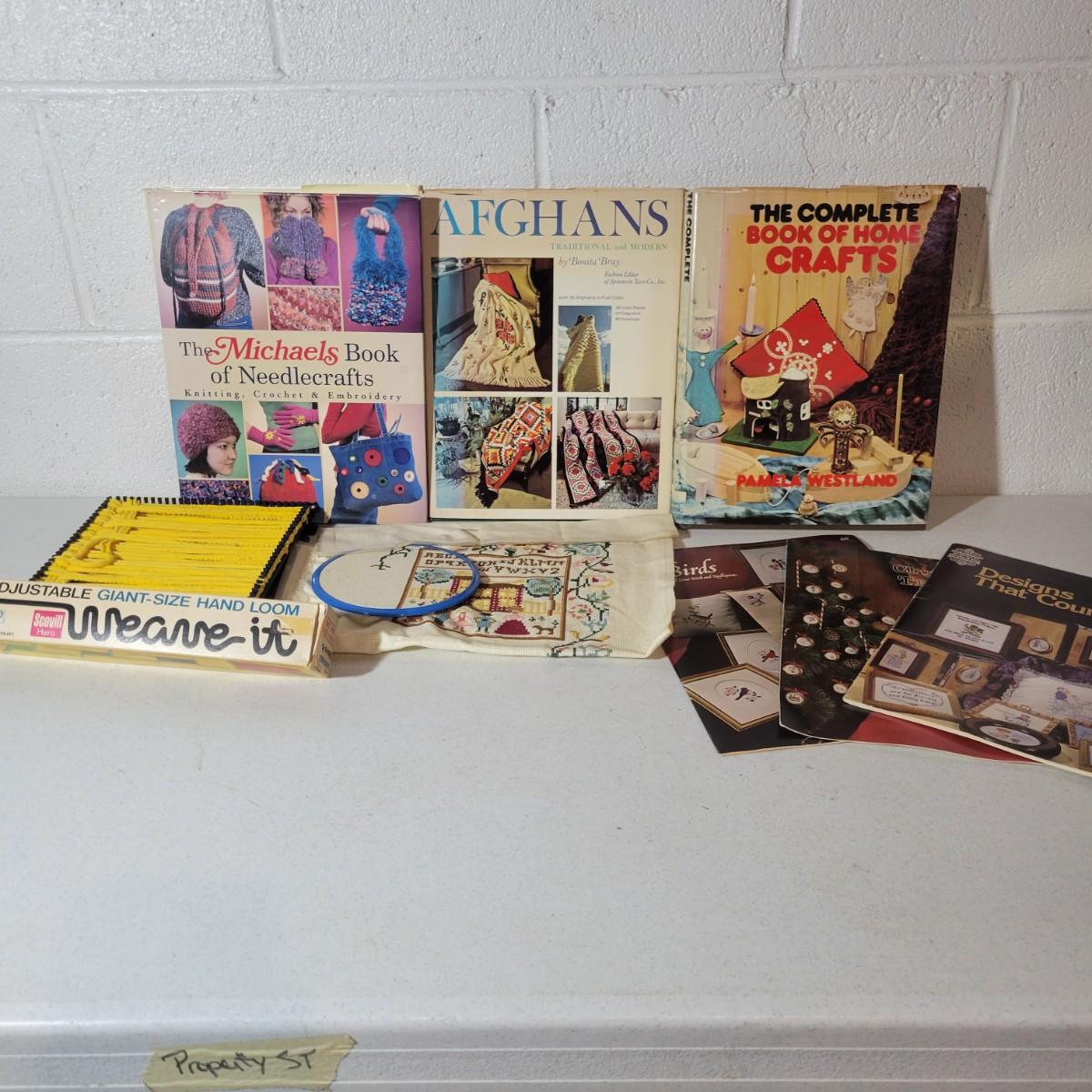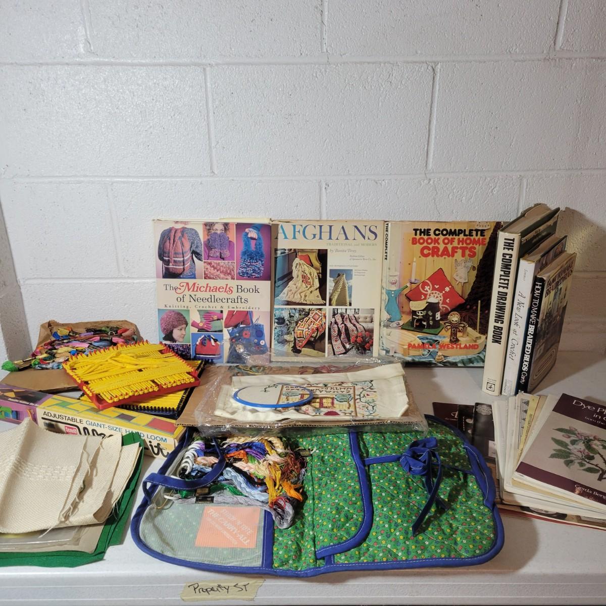 An assortment of crafting supplies, books, fabrics and more. This lot has multiple books on crafting, an assortment of cross stitch fabric and threads, various cross stitch patterns, hand loom frames and partially finished cross stitches. Shipping available