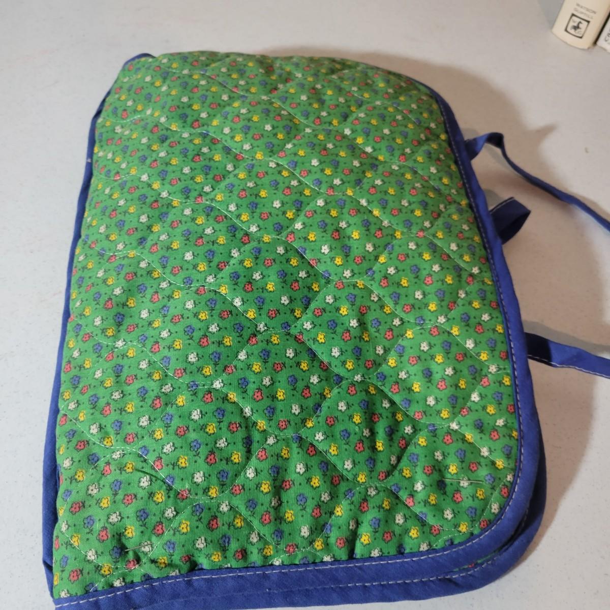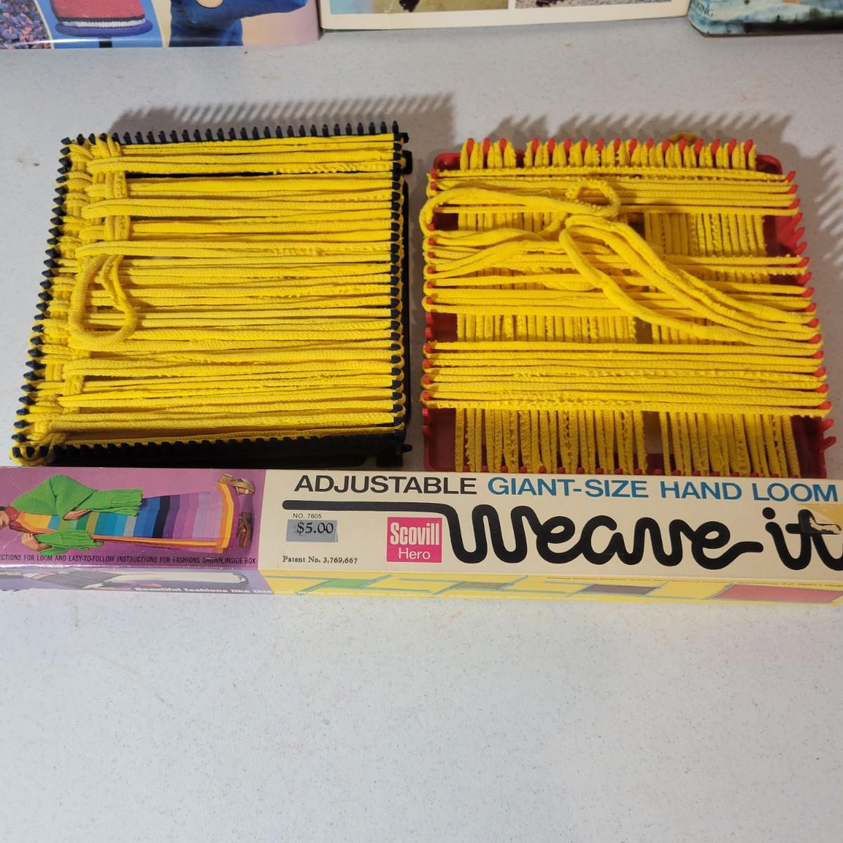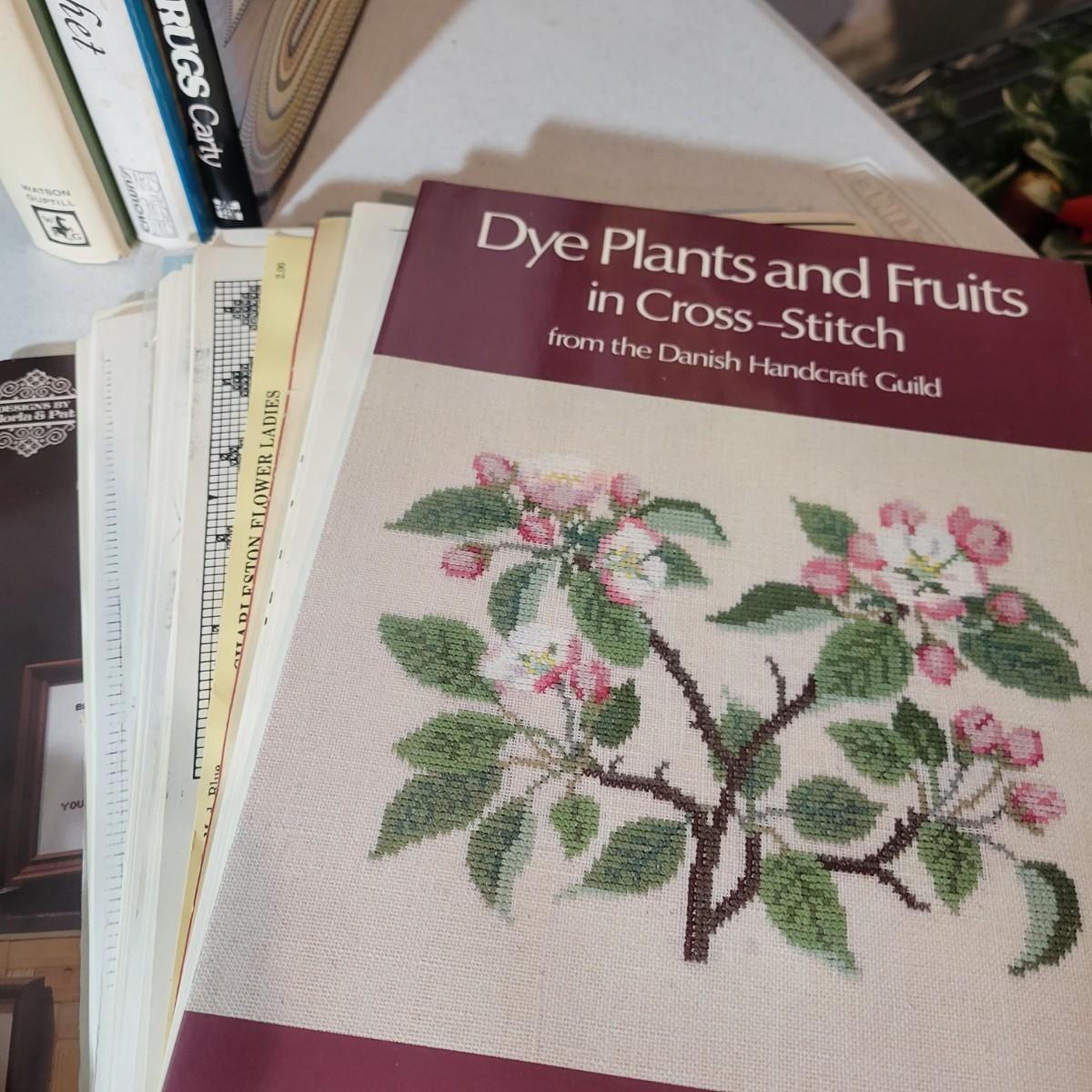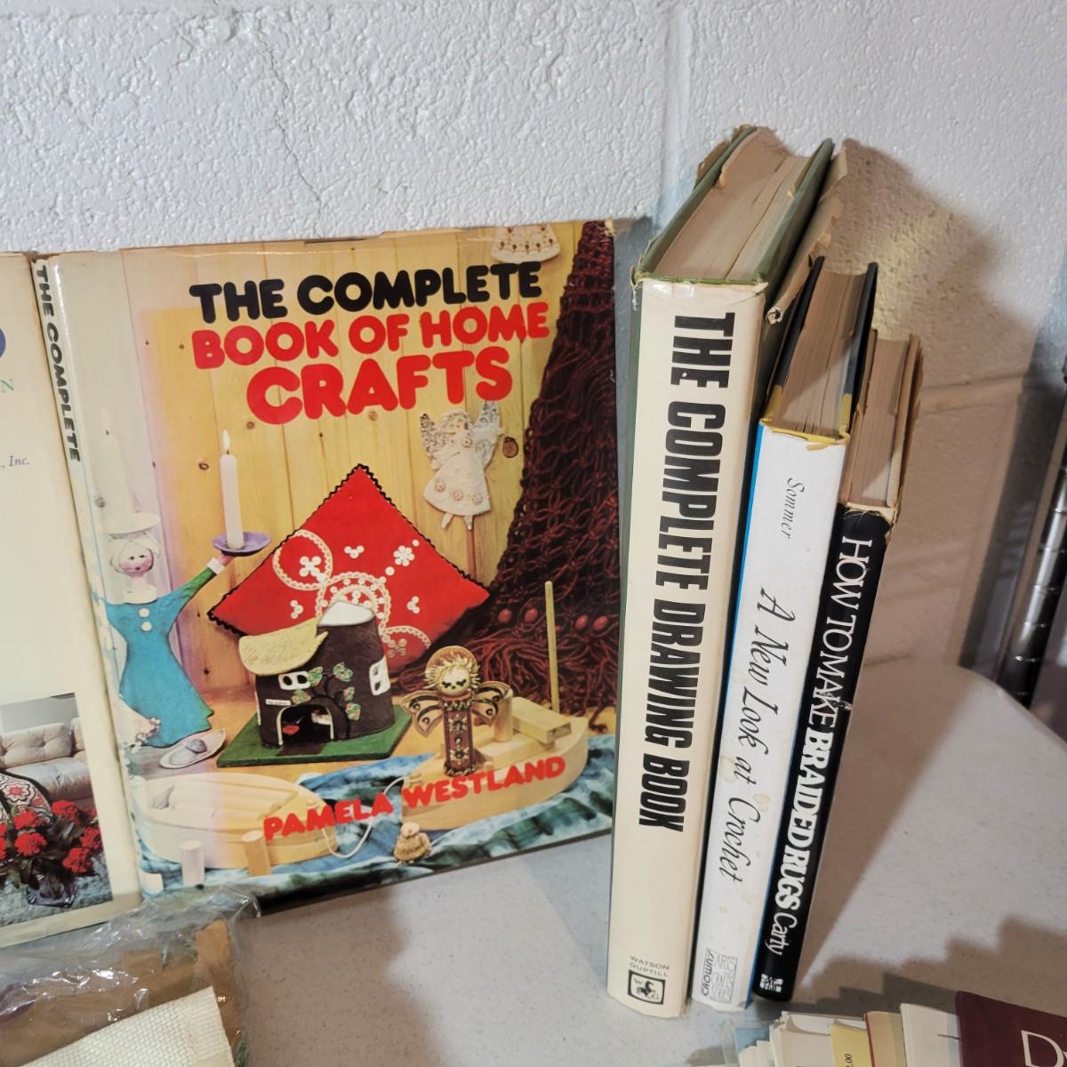 An assortment of crafting supplies, books, fabrics and more. This lot has multiple books on crafting, an assortment of cross stitch fabric and threads, various cross stitch patterns, hand loom frames and partially finished cross stitches. Shipping available