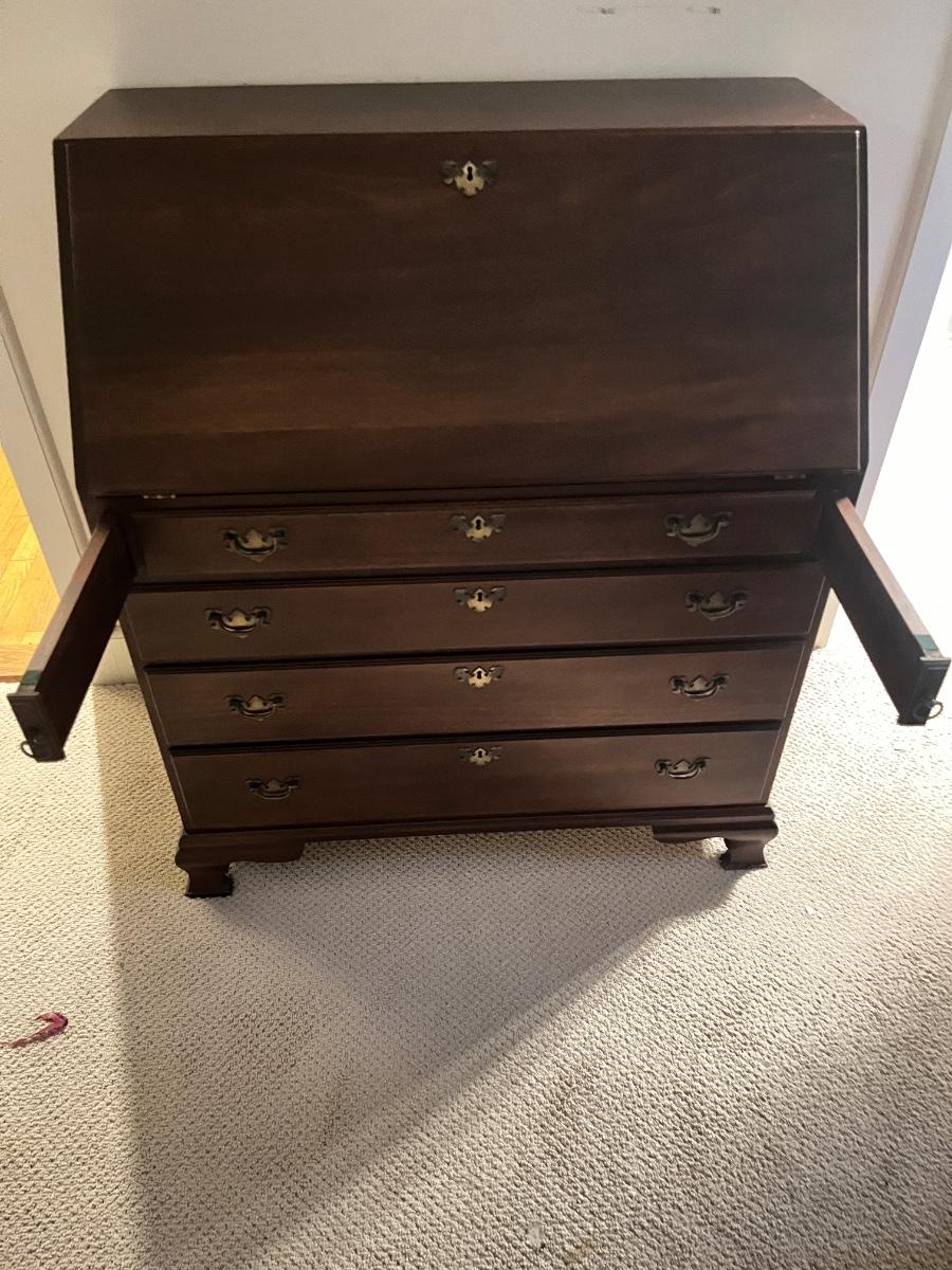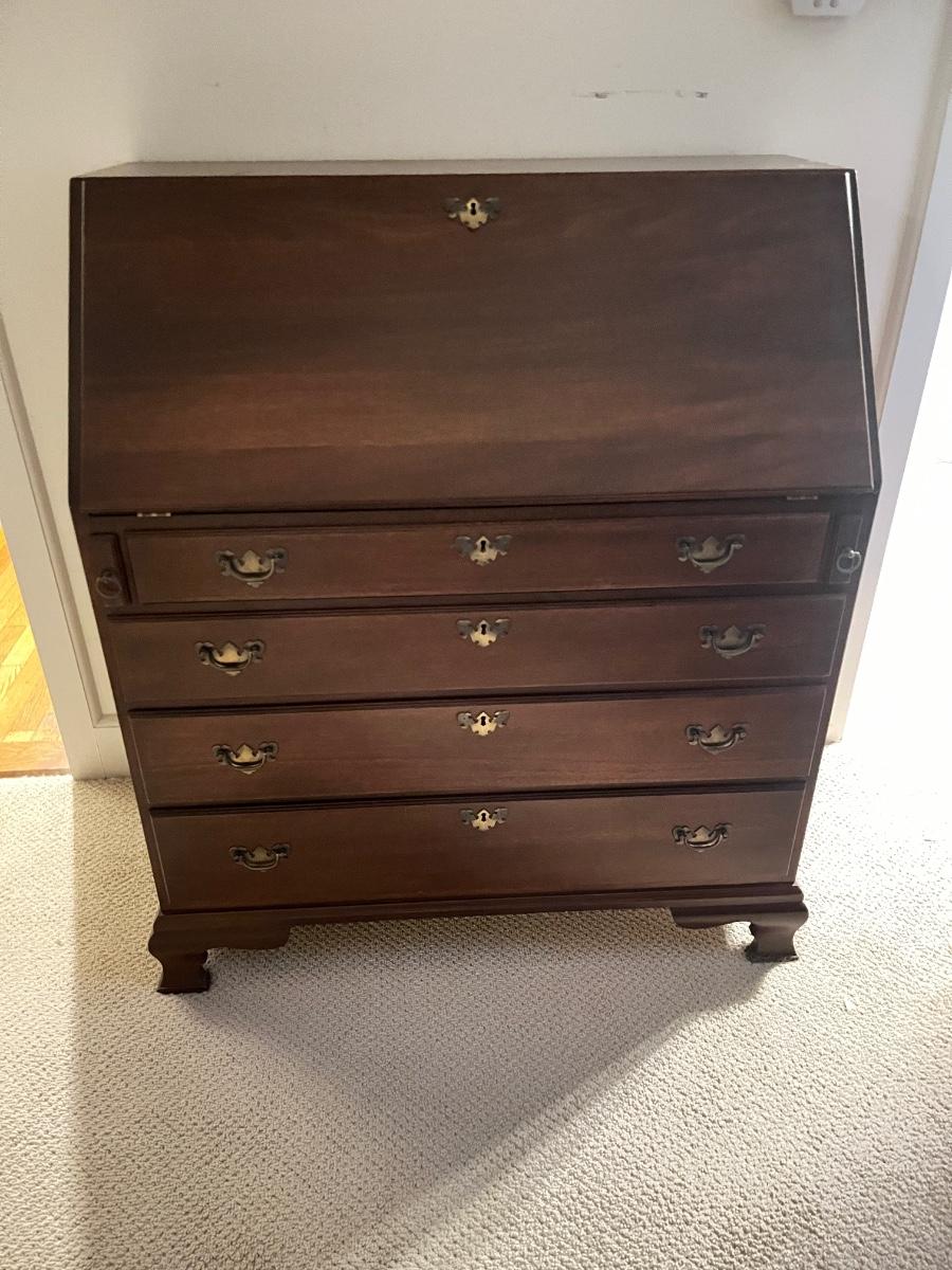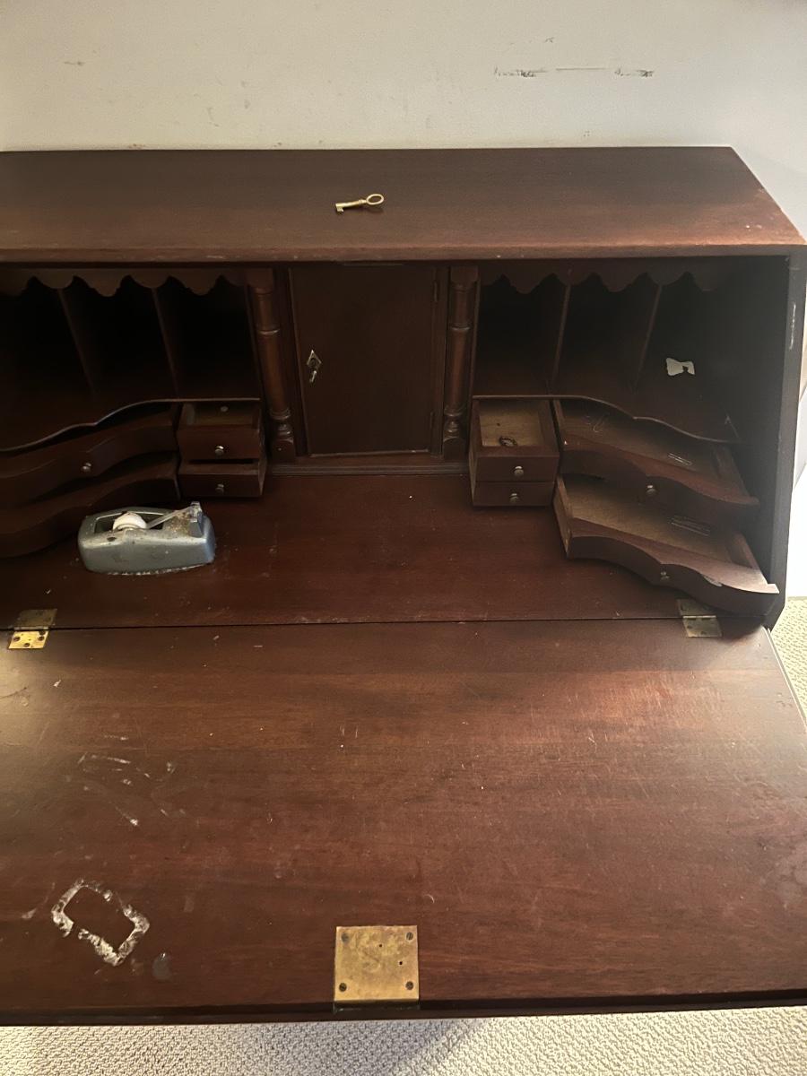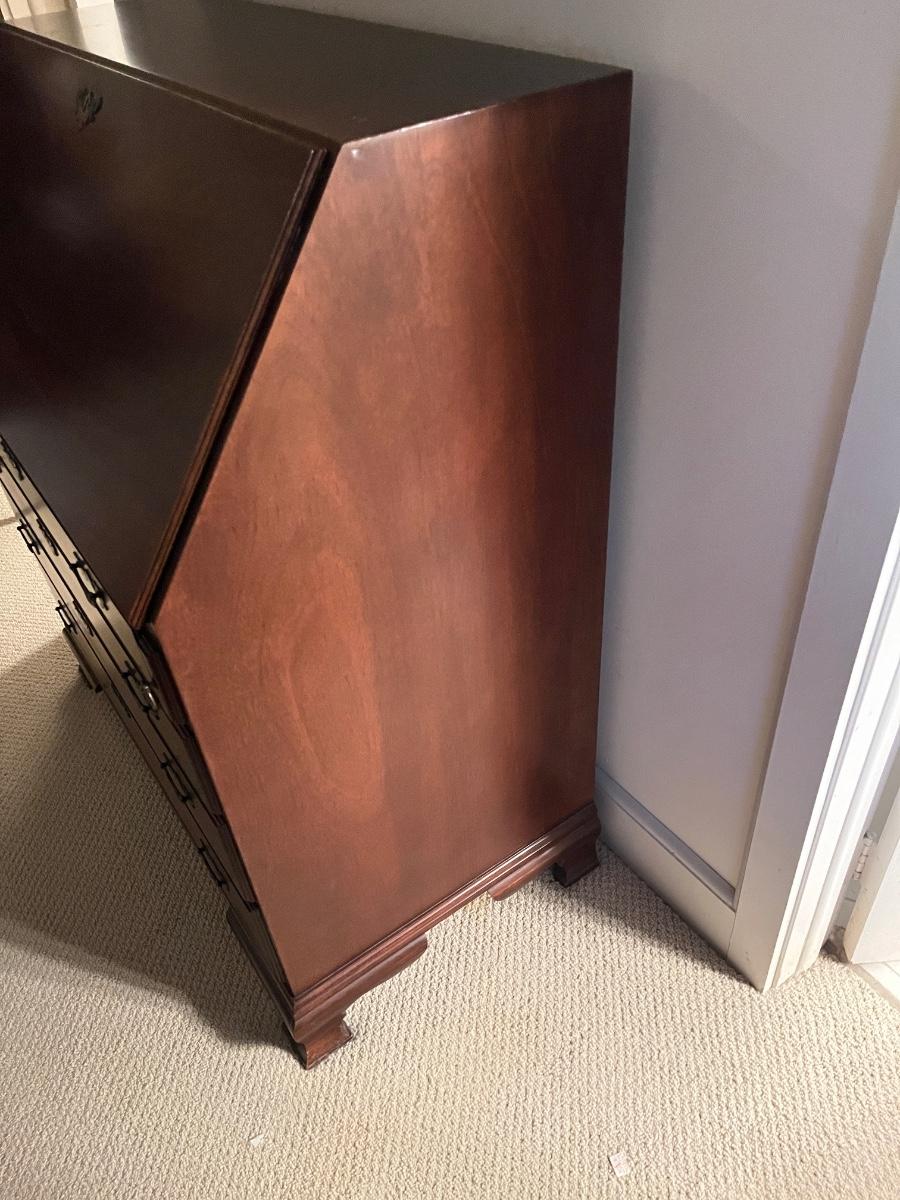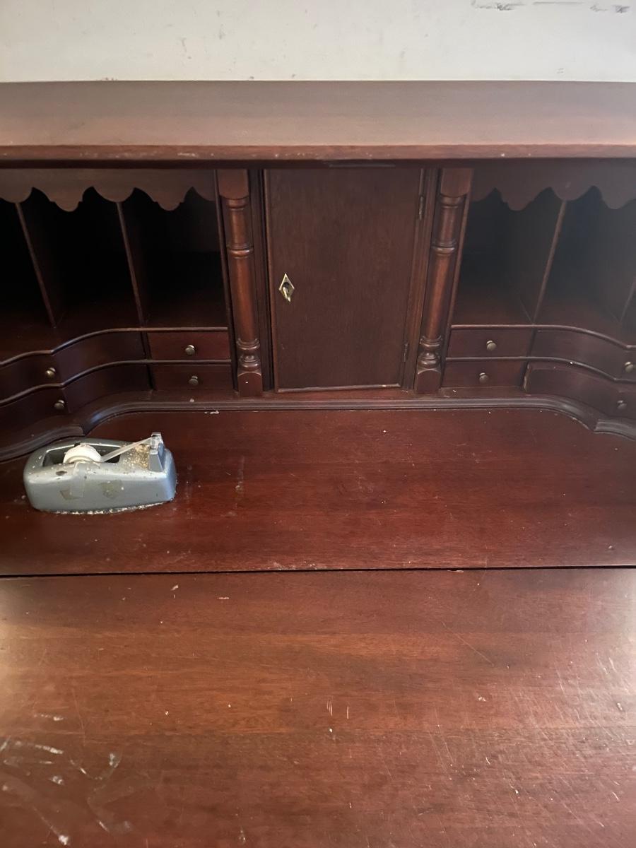 Lot includes a Four dovetailed drawer Secretary made by Craftique. Secretary has eight visible drawers and two hidden drawers. Secretary measures 21” x 38” x 43.5”H when closed and 36” x 38” x 43.5 when open. Secretary also has a tape dispenser that is attached. See images for examples of scratches and nicks.