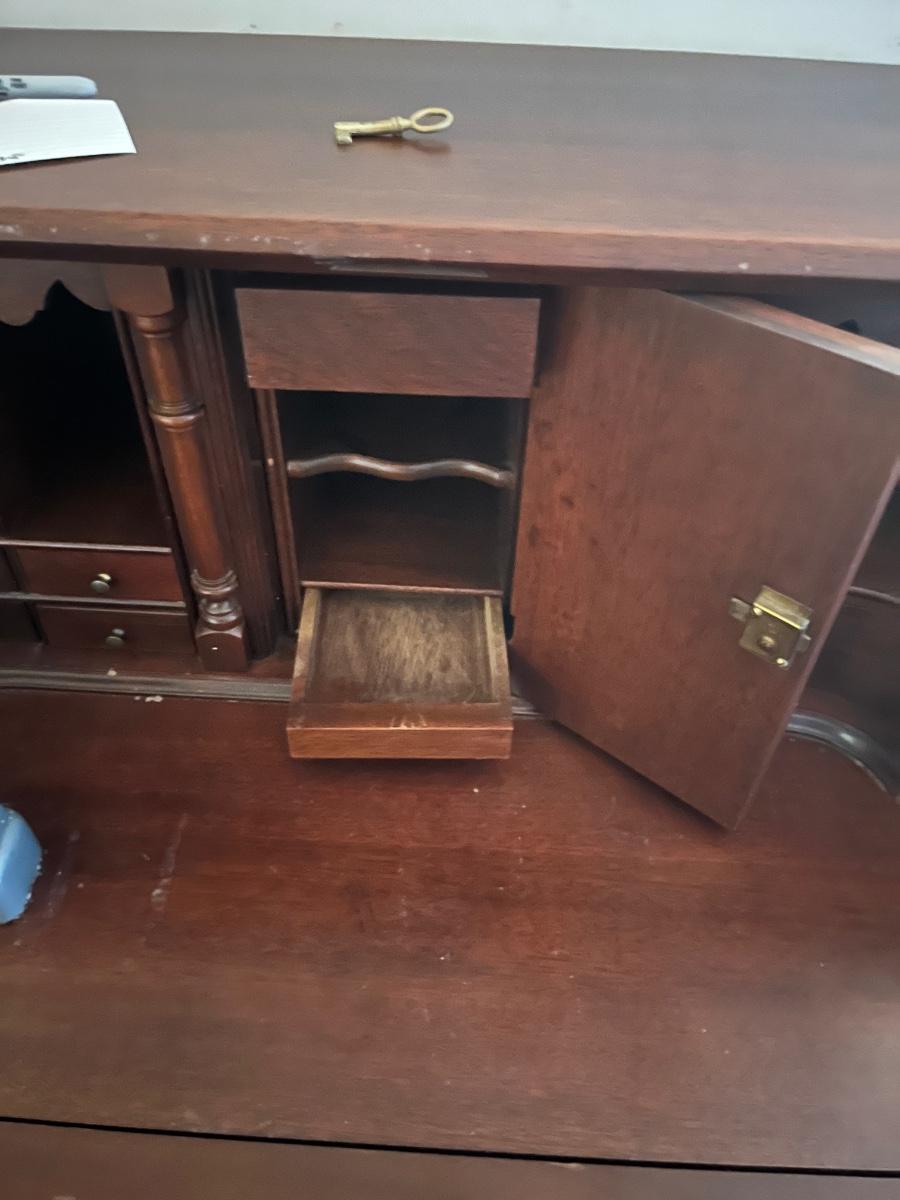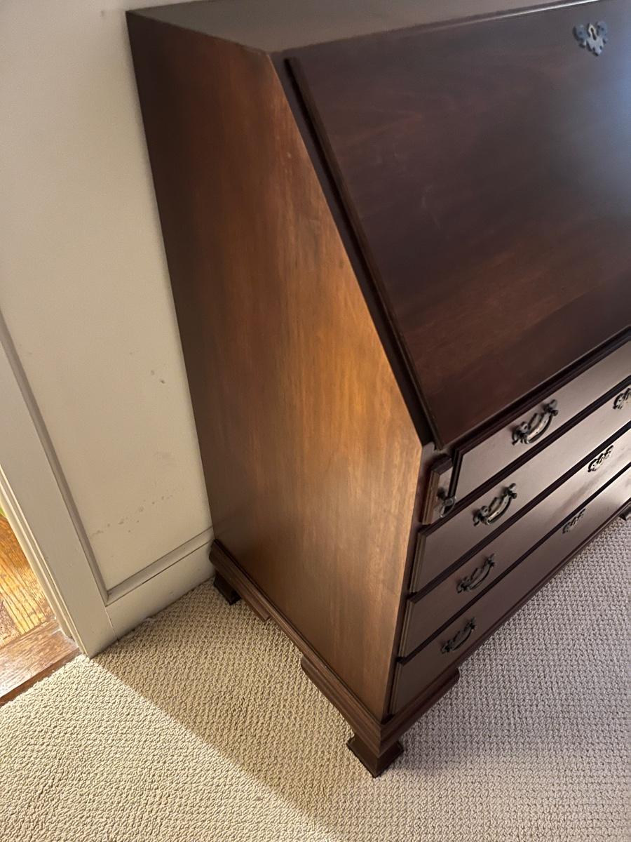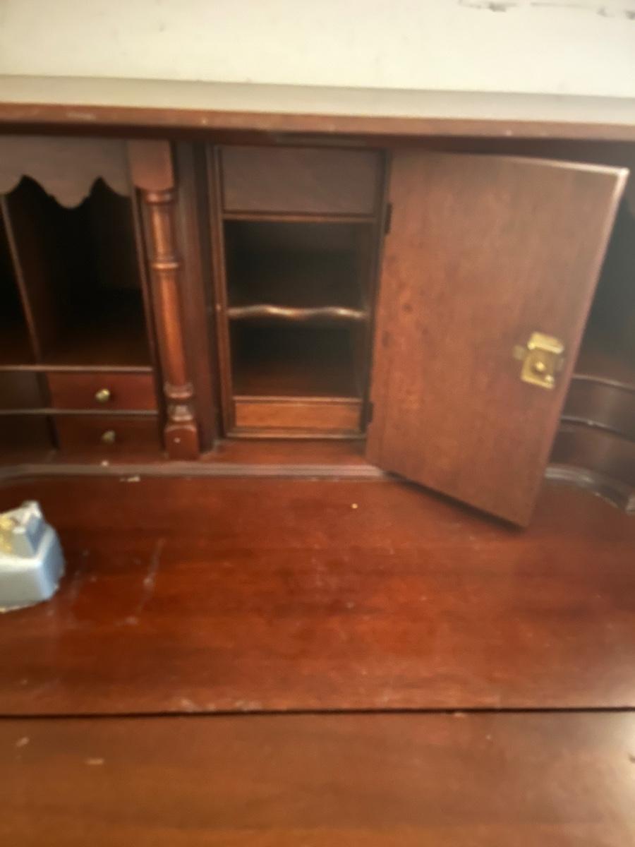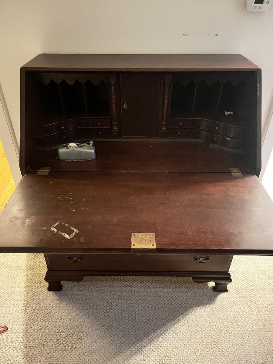 Lot includes a Four dovetailed drawer Secretary made by Craftique. Secretary has eight visible drawers and two hidden drawers. Secretary measures 21” x 38” x 43.5”H when closed and 36” x 38” x 43.5 when open. Secretary also has a tape dispenser that is attached. See images for examples of scratches and nicks.