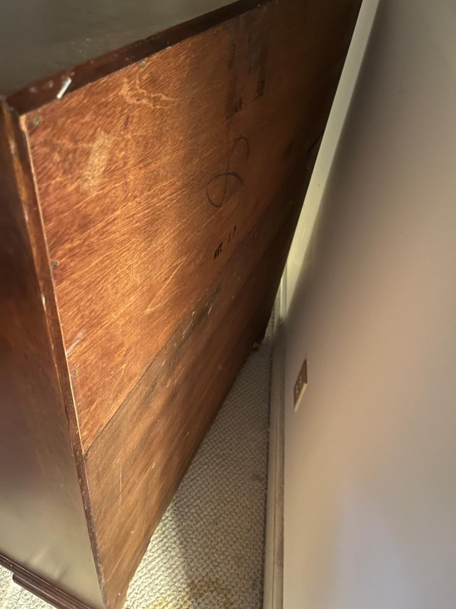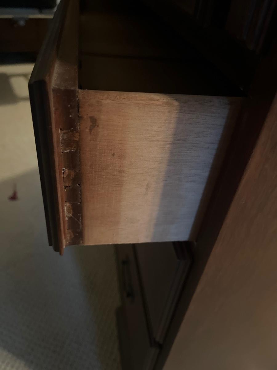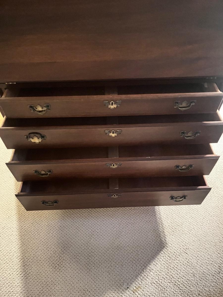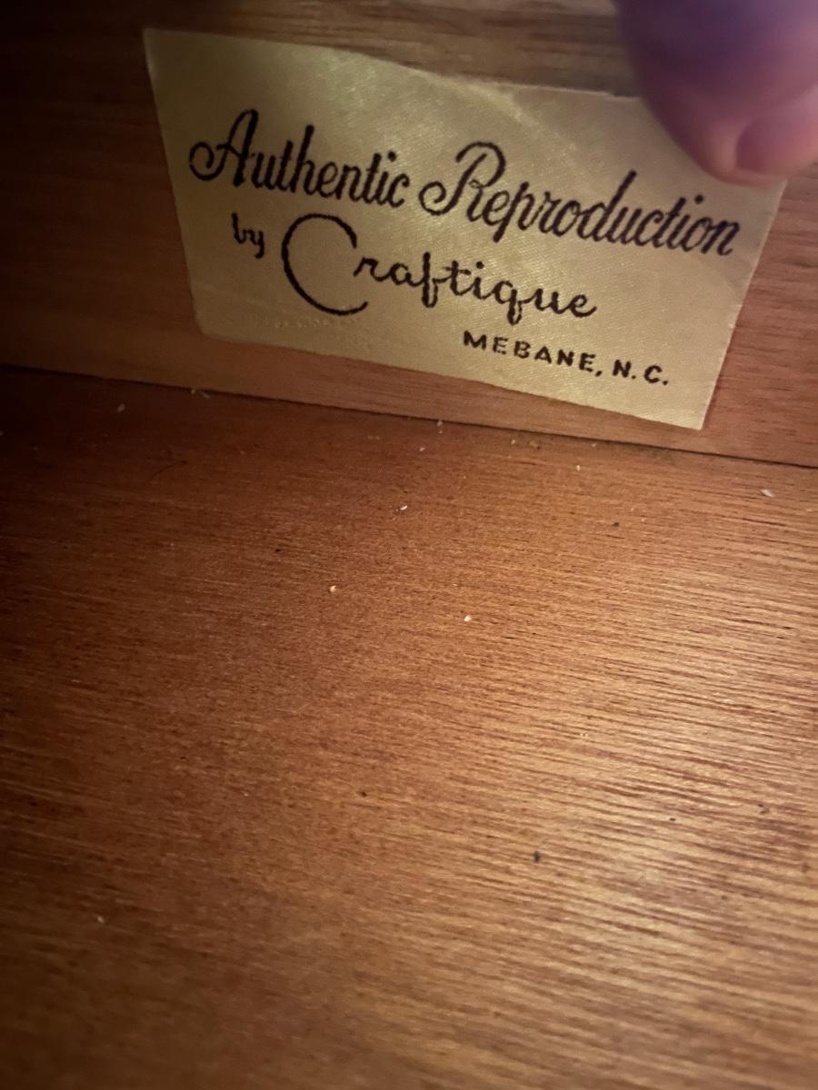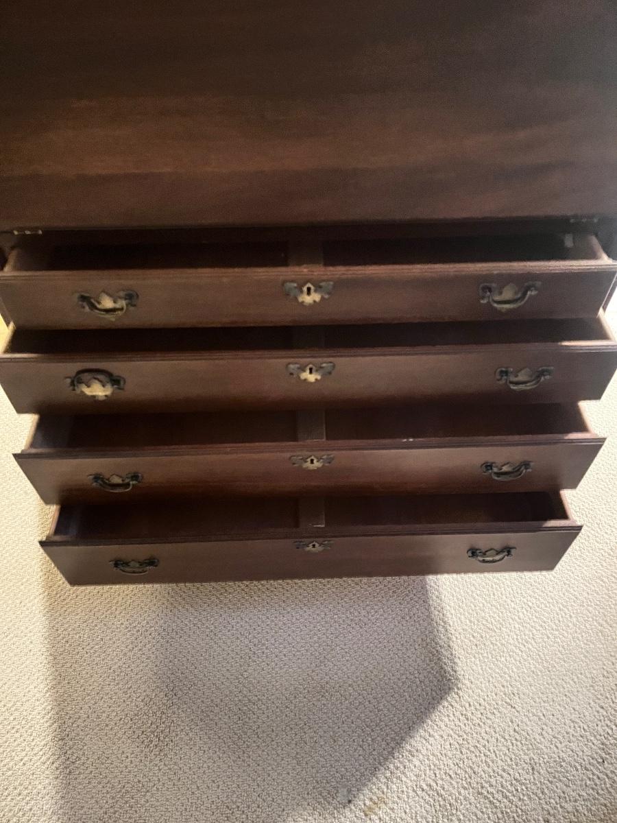 Lot includes a Four dovetailed drawer Secretary made by Craftique. Secretary has eight visible drawers and two hidden drawers. Secretary measures 21” x 38” x 43.5”H when closed and 36” x 38” x 43.5 when open. Secretary also has a tape dispenser that is attached. See images for examples of scratches and nicks.