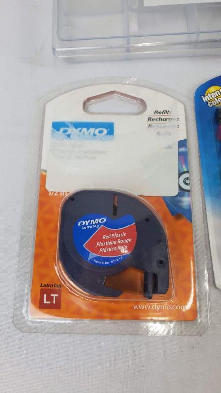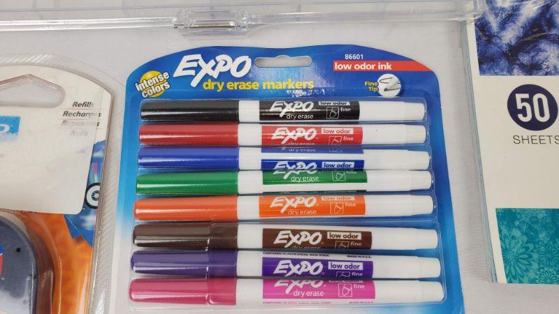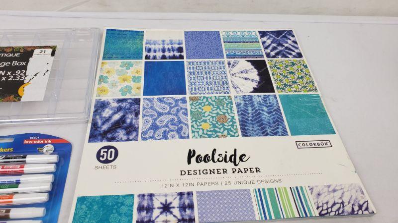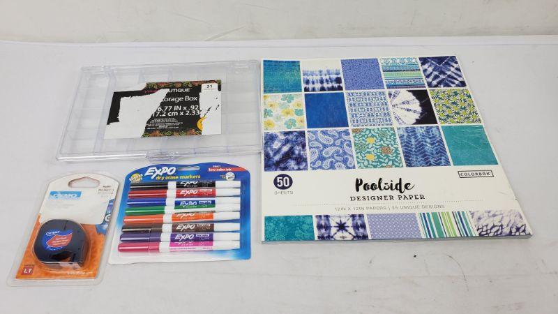 Craft/Office Supplies: Storage Box/Poolside Design Paper 12" x 12"/Expo Markers/Dymo Red Plastic Refill - New