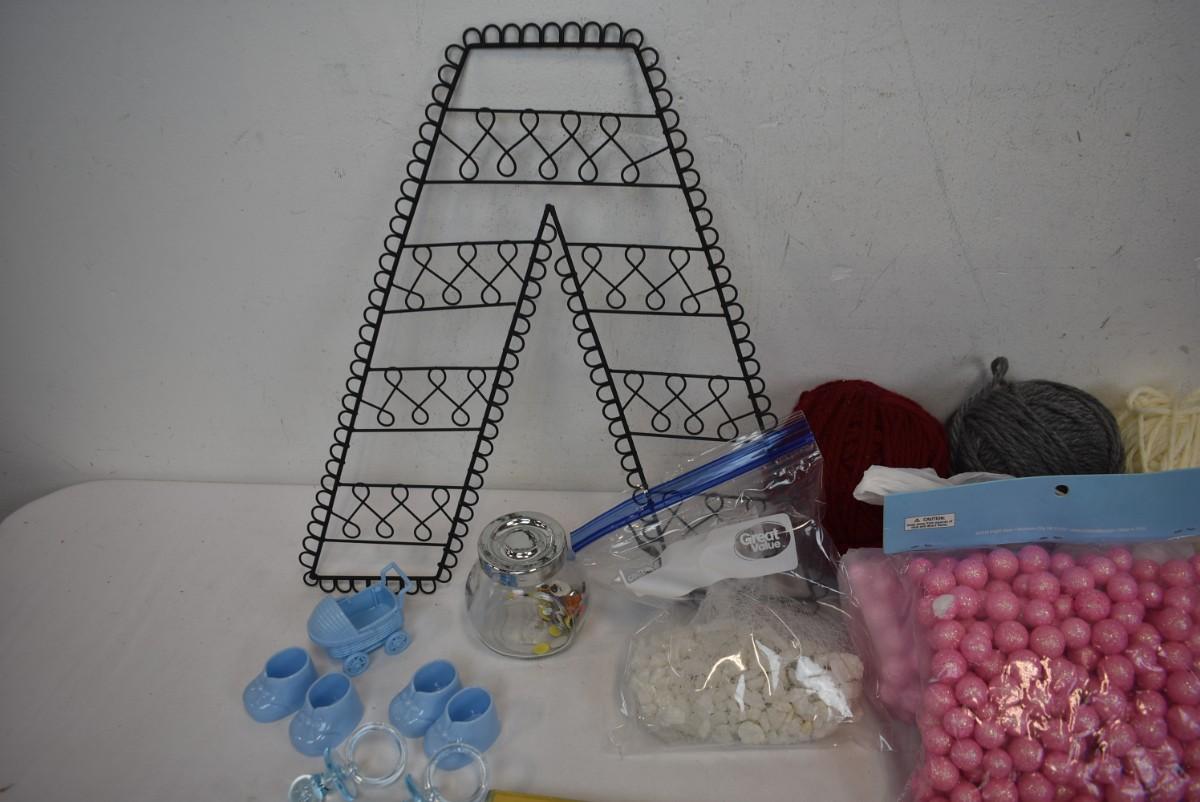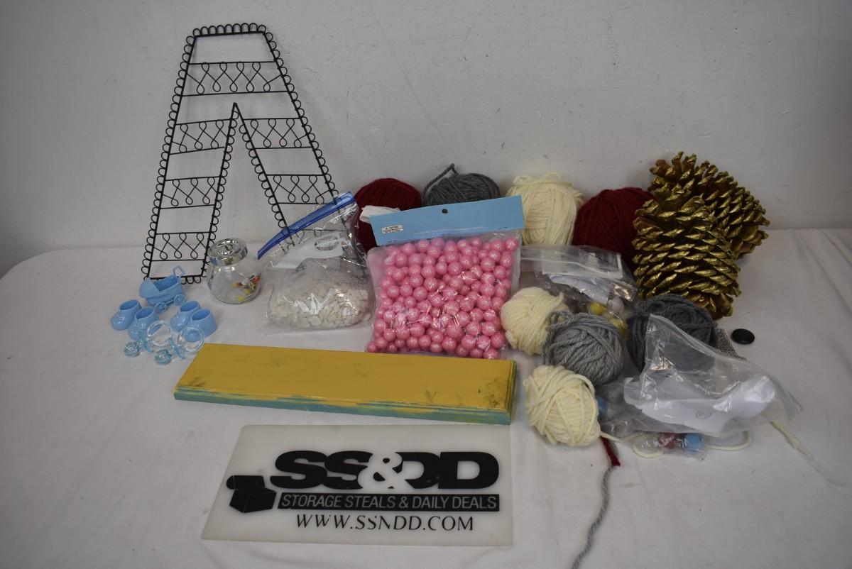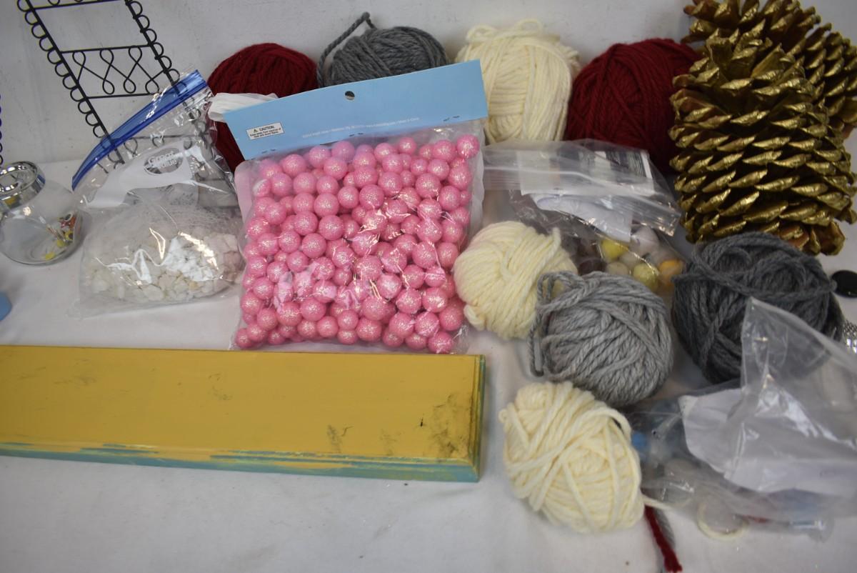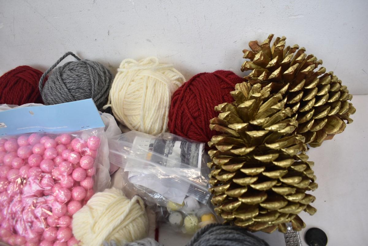 Crafts Supplies: 2 Gold Pinecones, Yarn Balls, A Frame, Pink Balls
