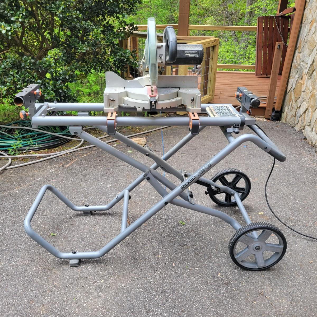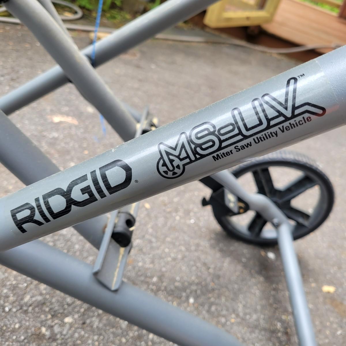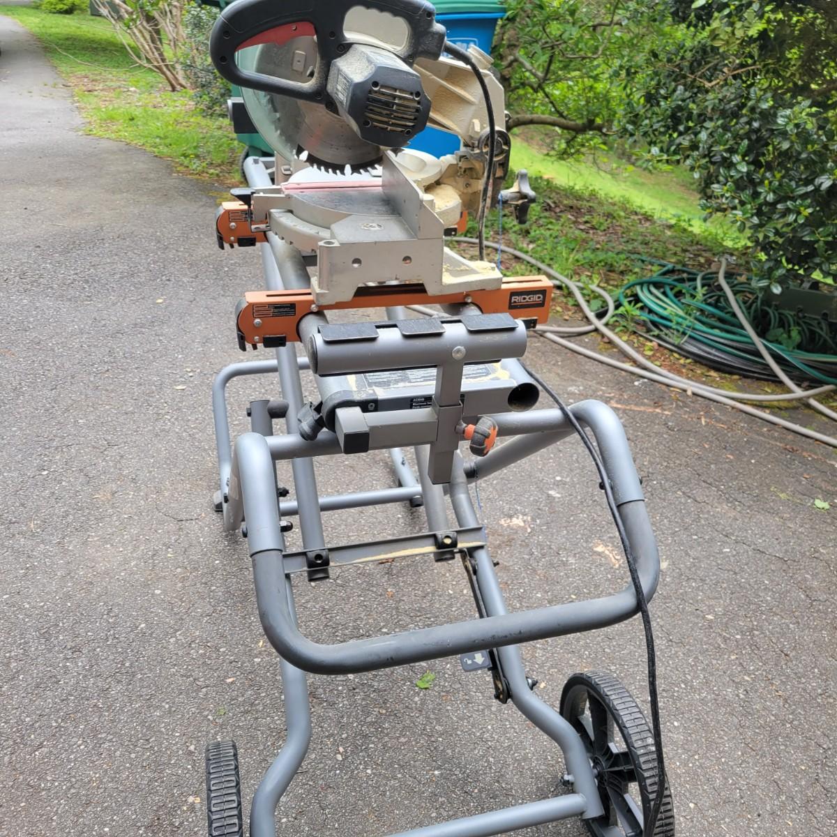 A Craftsman 10" compound mitre Saw that powered on when plugged in. Saw does show some wear and tear from use and is missing a locking screw. Also included is a Rigid Mitre Saw Utility Vehicle that makes transporting and using your saw convenient. It features adjustable levelers, large wheels for easy movement and folds down into a compact size for transportation or storage. Stand and saw measures approximately 56" x 20" x 50"H. Local pickup only