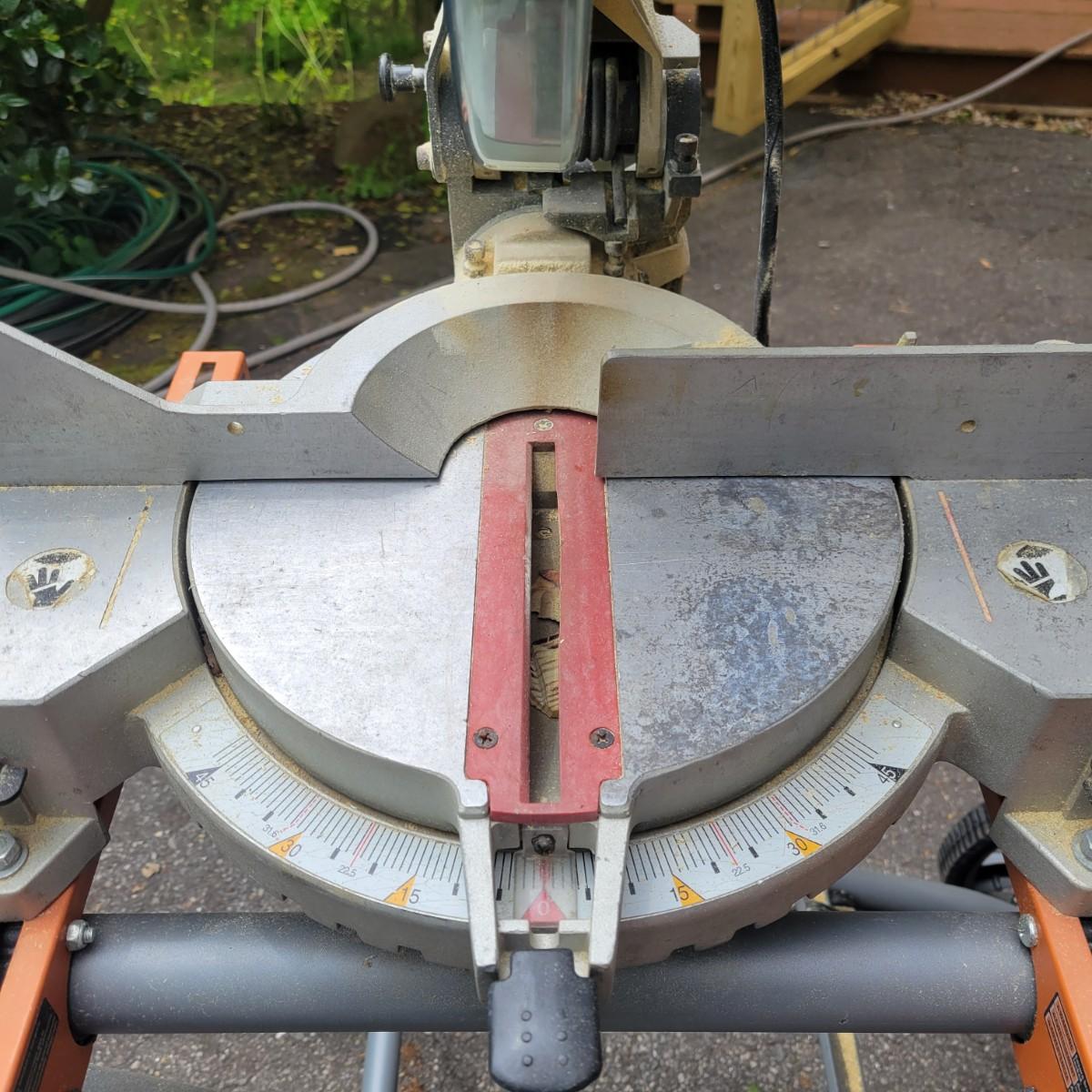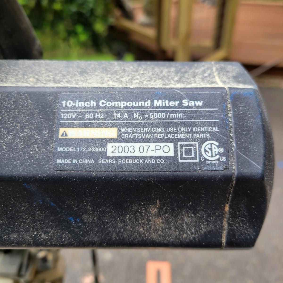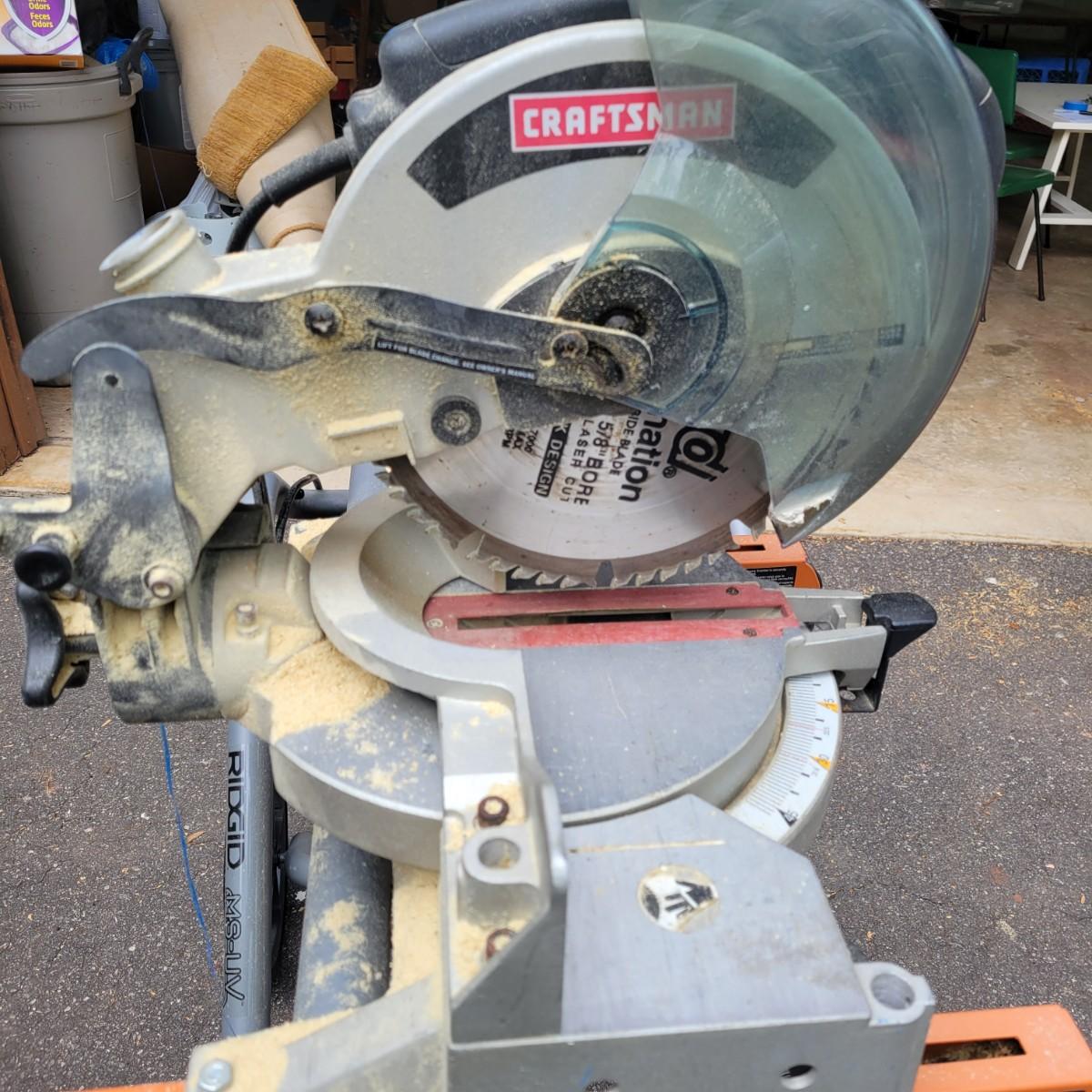 A Craftsman 10" compound mitre Saw that powered on when plugged in. Saw does show some wear and tear from use and is missing a locking screw. Also included is a Rigid Mitre Saw Utility Vehicle that makes transporting and using your saw convenient. It features adjustable levelers, large wheels for easy movement and folds down into a compact size for transportation or storage. Stand and saw measures approximately 56" x 20" x 50"H. Local pickup only