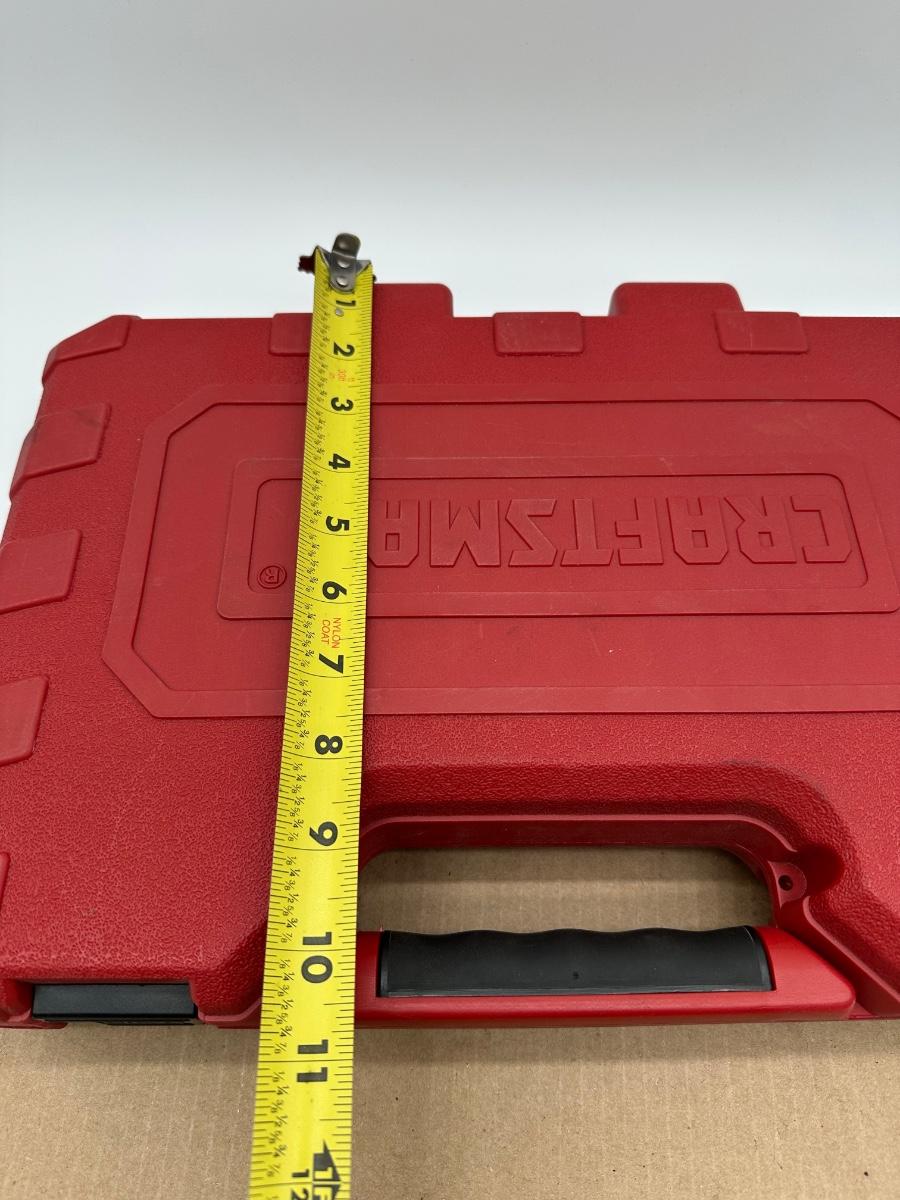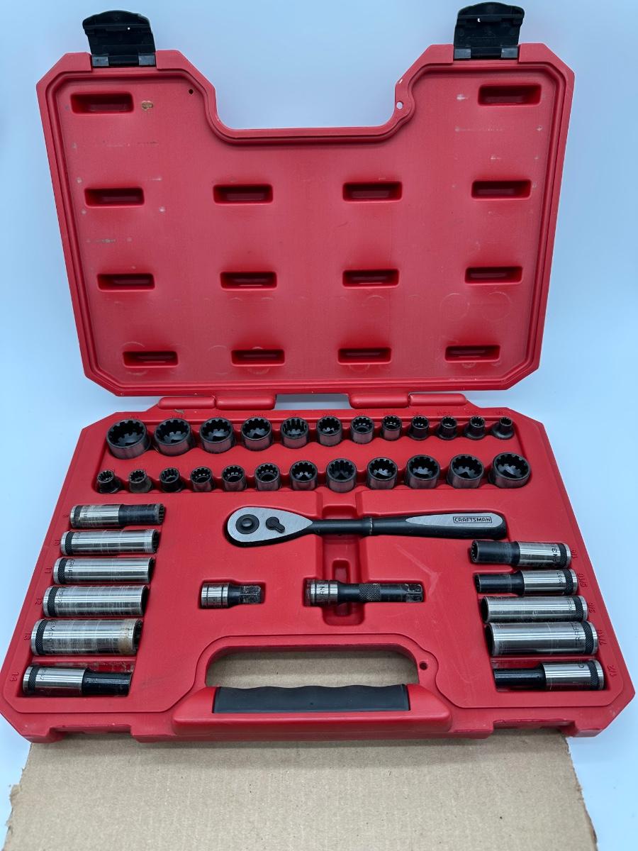 Complete Craftsman 1/2” drive socket set in original red hard case. Includes Craftsman ratchet, extensions, and a mix of standard and deep sockets (SAE sizes). Solid homeowner or shop set.