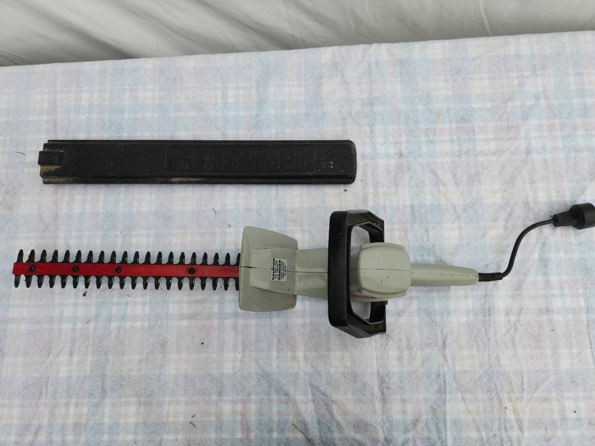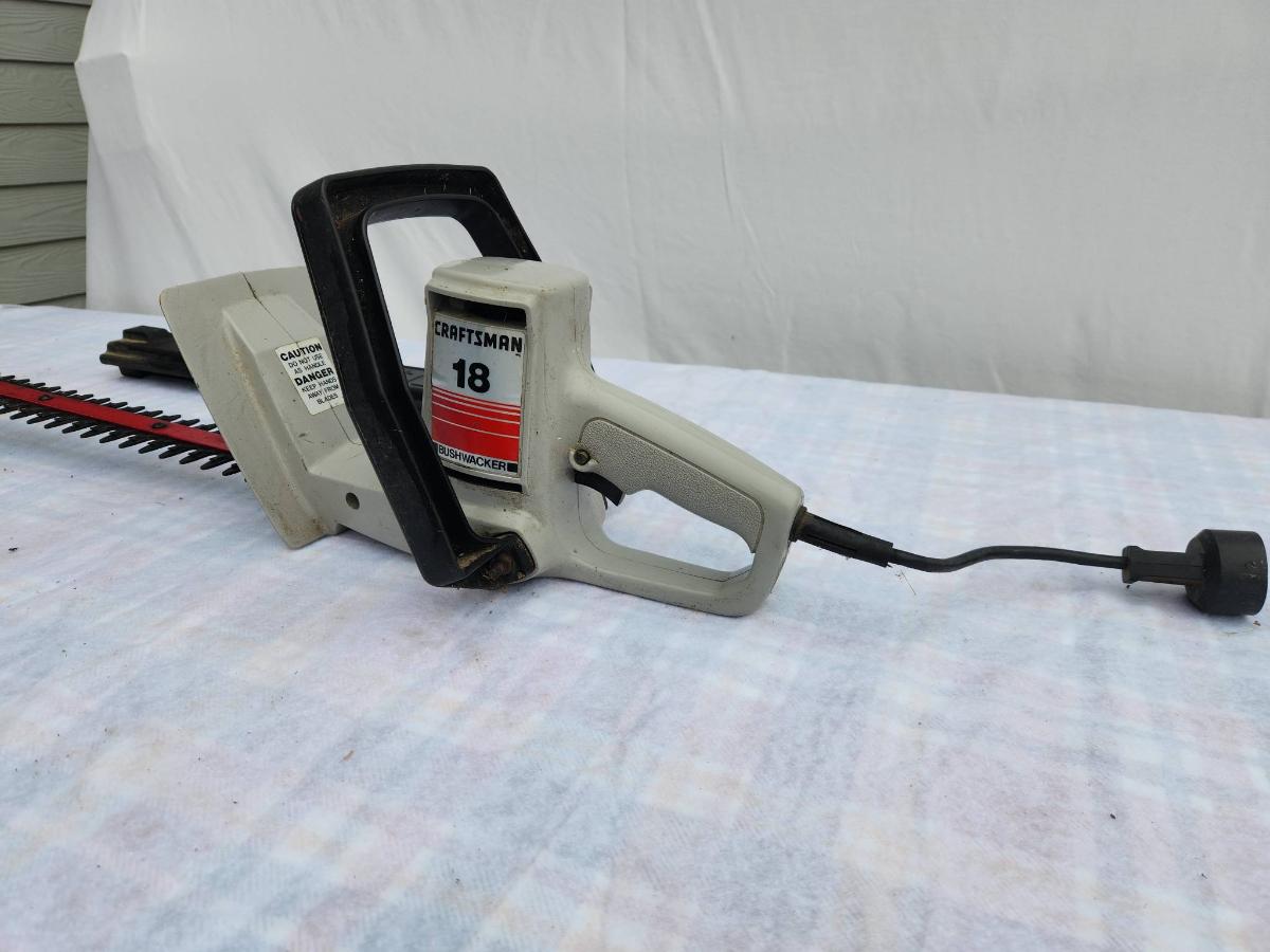 Craftsman 18-inch electric hedge trimmer featuring a durable blade and ergonomic handle. Includes a blade cover for safety. Powered by a standard electrical cord, this trimmer is ideal for light to medium trimming tasks. Condition appears functional with some signs of use on the body and blade cover.