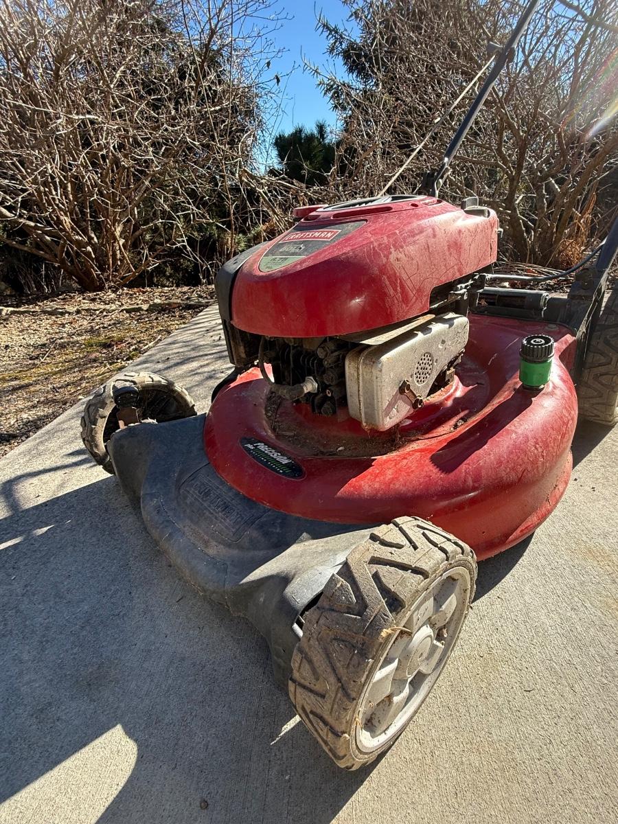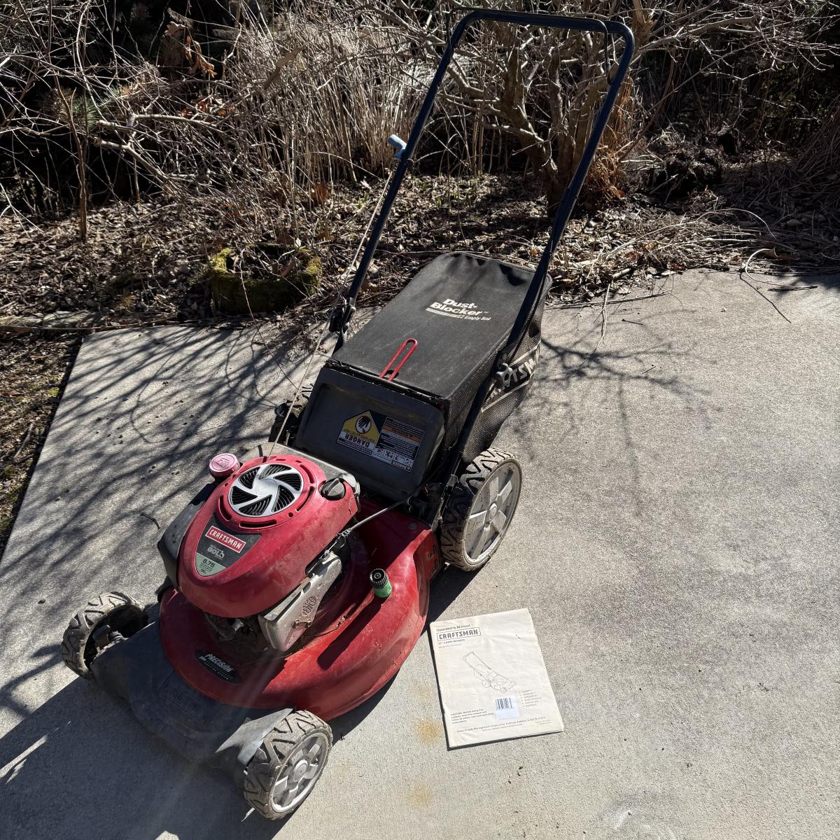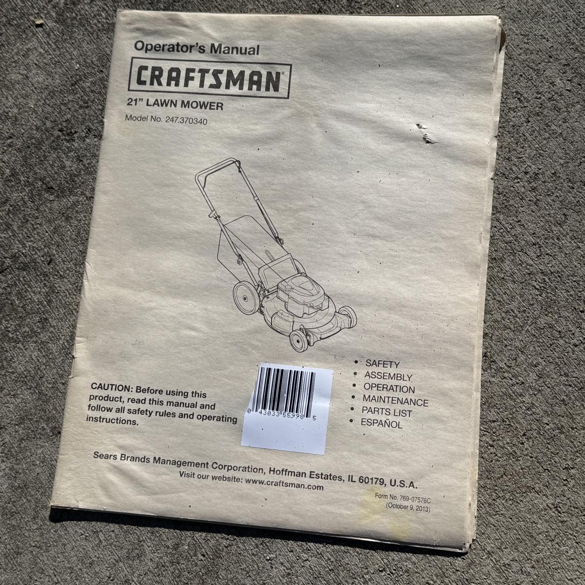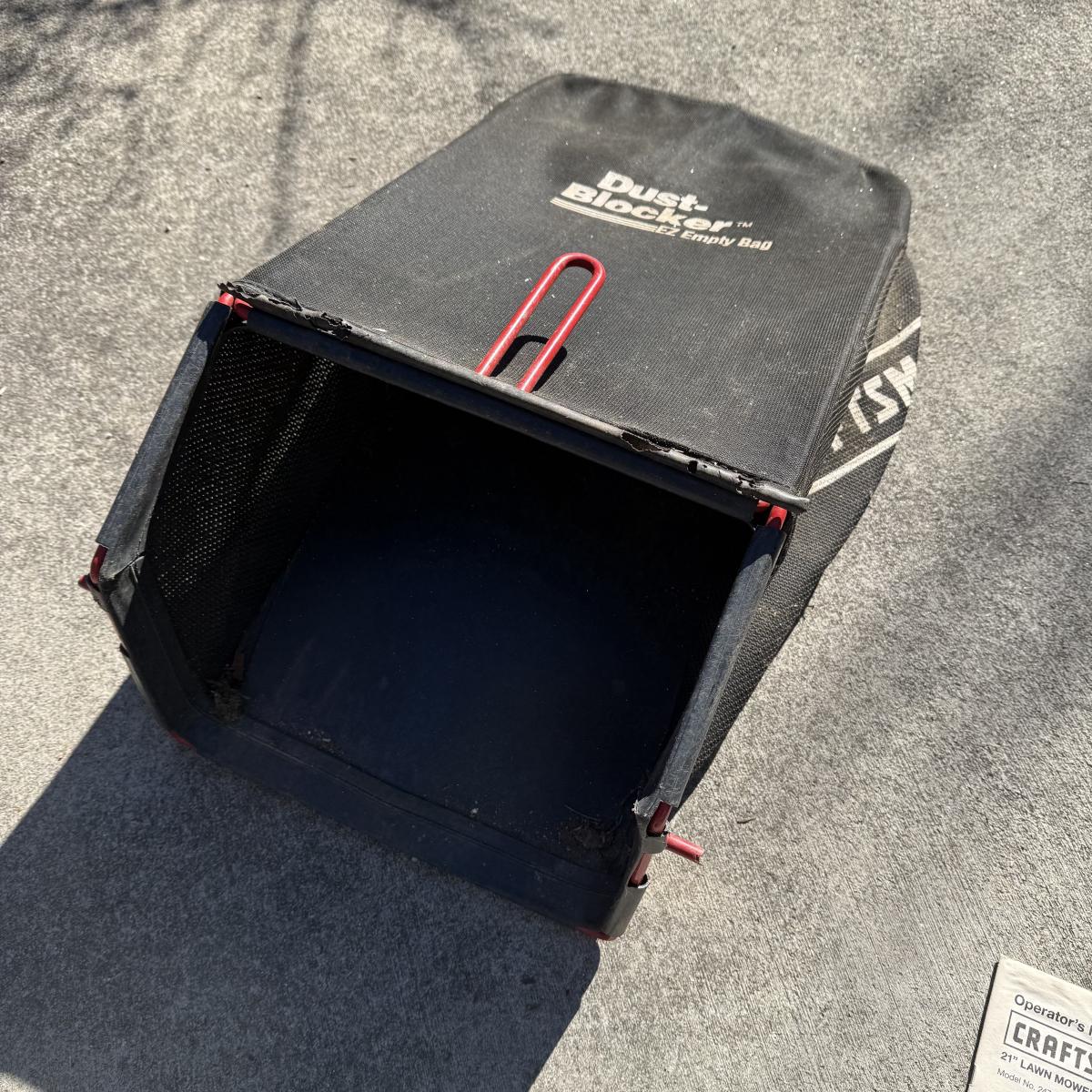Craftsman lawn mower with grass catcher and operator’s manual. Grass catcher has some damage but appears that it shouldn’t affect its functionality. Mower turned over when pulled but did not start, likely due to no gas. Cord pulls freely.
