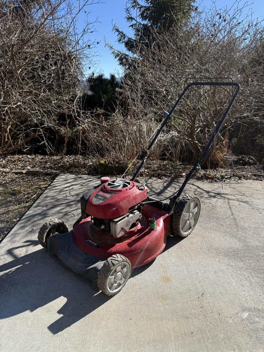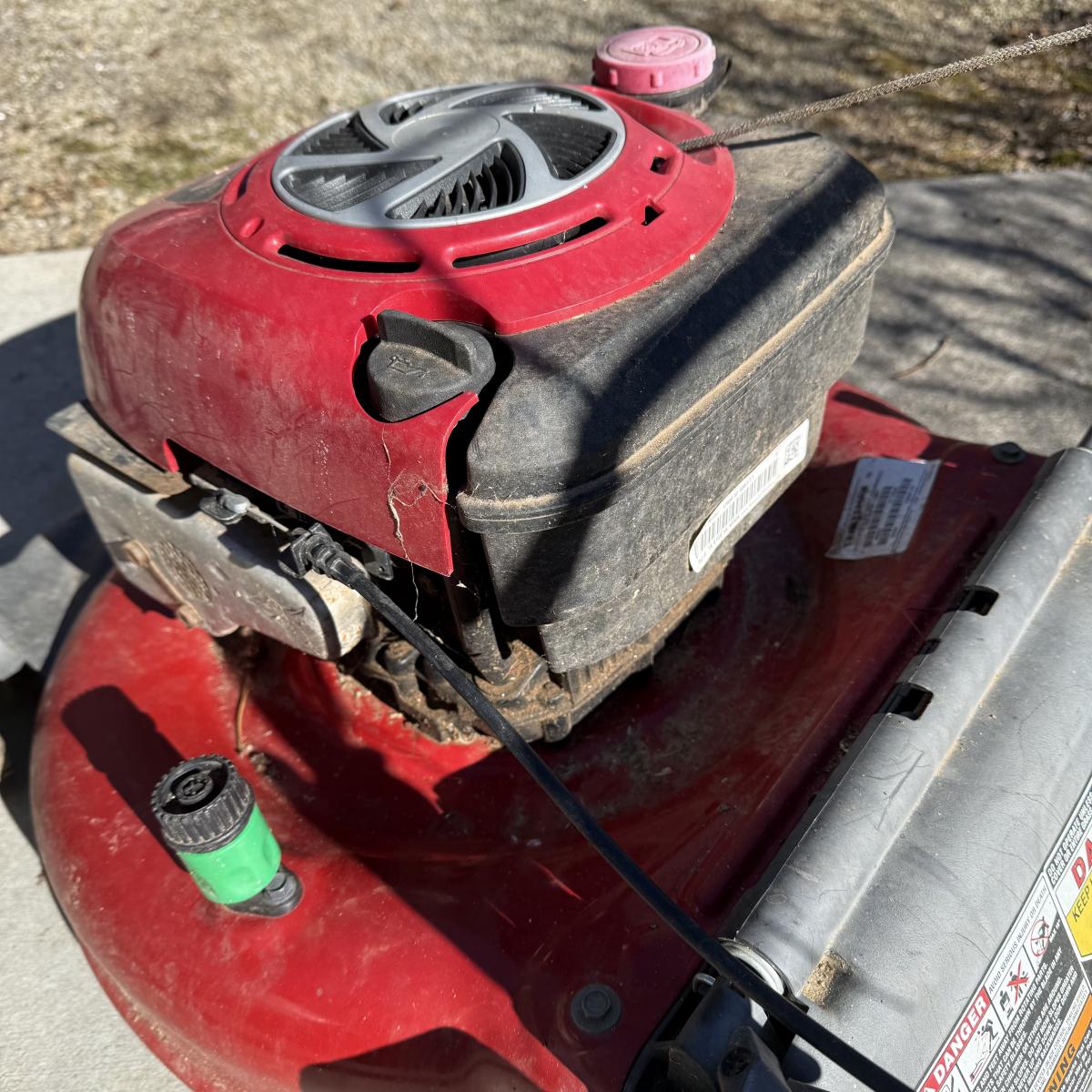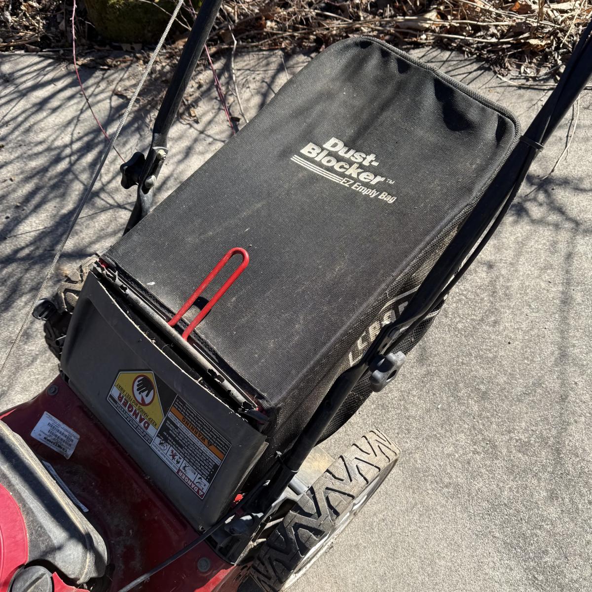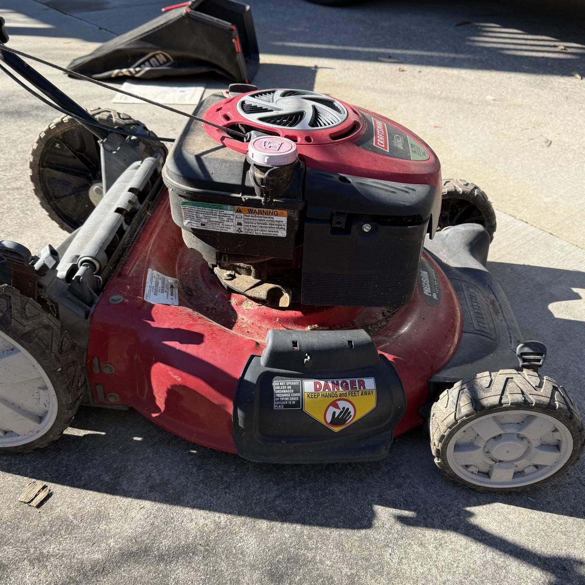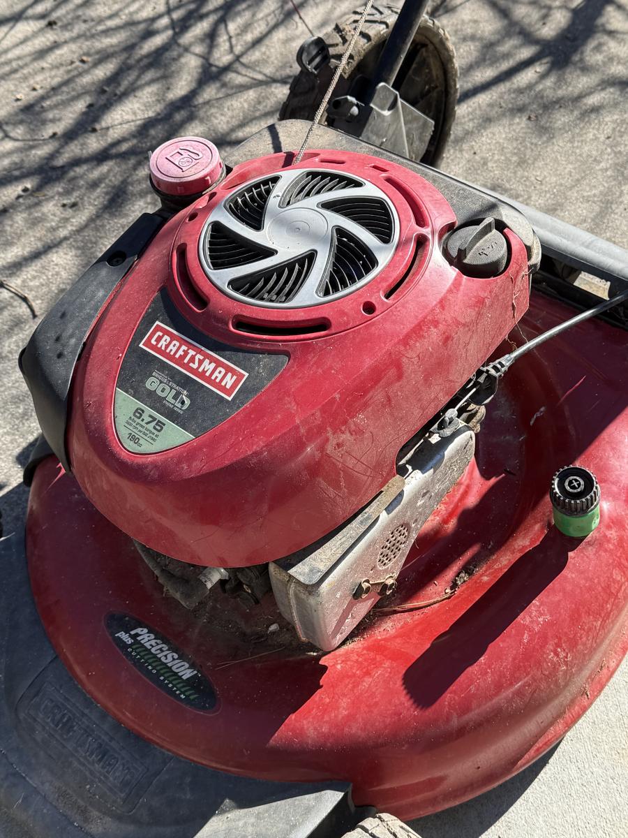 Craftsman lawn mower with grass catcher and operator’s manual. Grass catcher has some damage but appears that it shouldn’t affect its functionality. Mower turned over when pulled but did not start, likely due to no gas. Cord pulls freely.