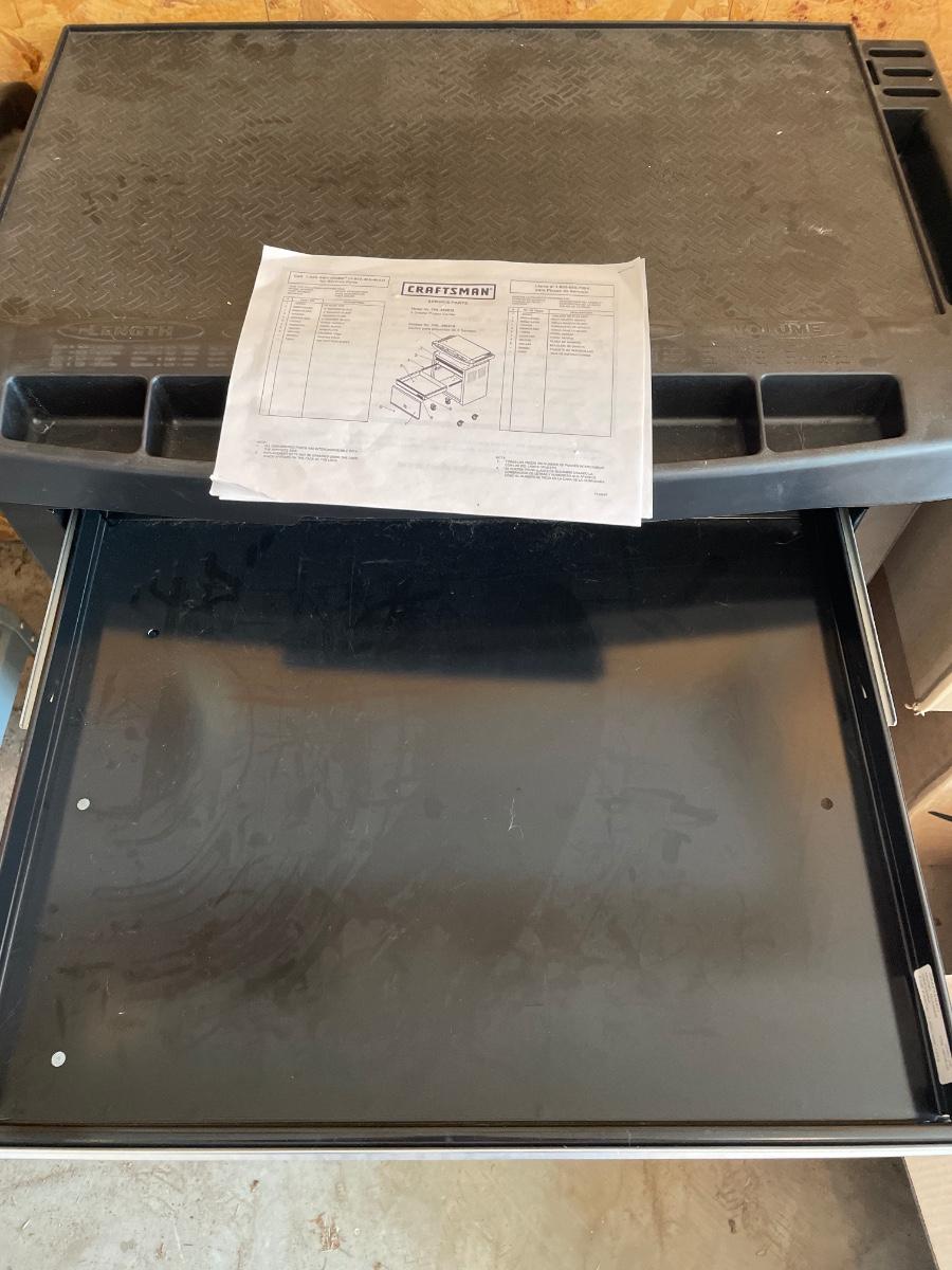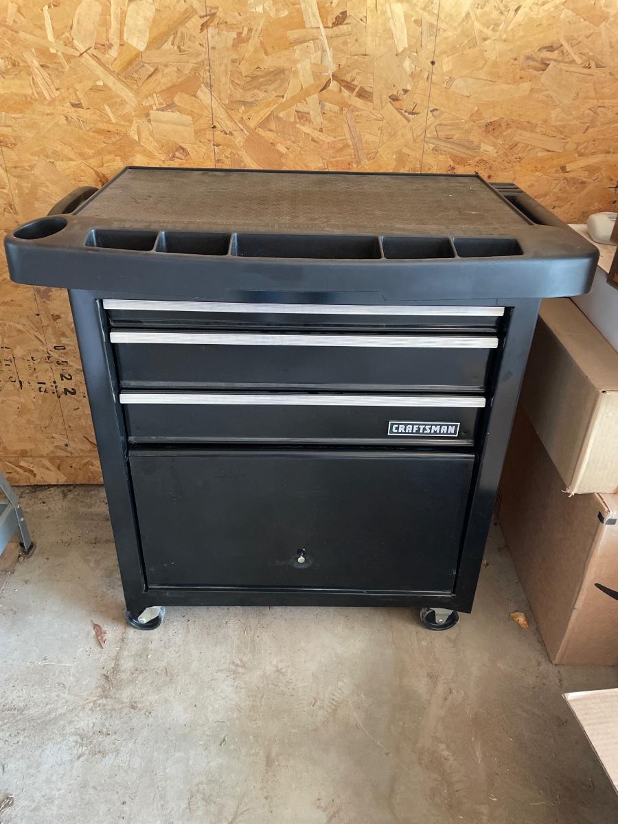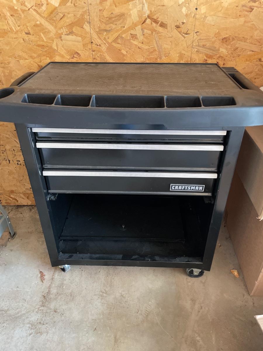 Craftsman 3 drawer rolling tool cart. Measurements are 33 1/2 inches wide by 32 inches tall by 19 1/2 inches deep.