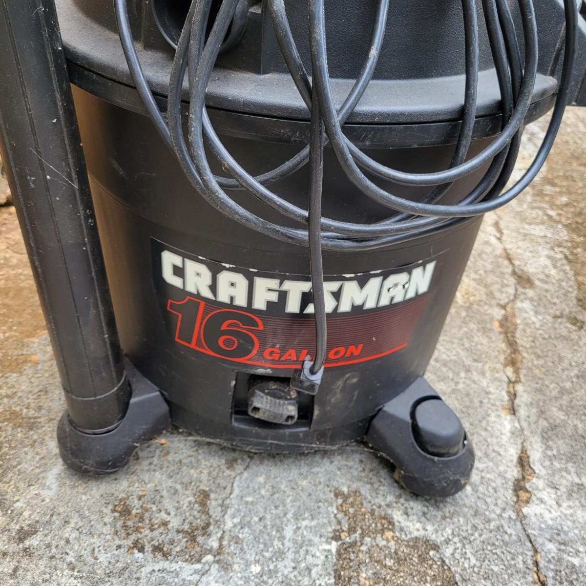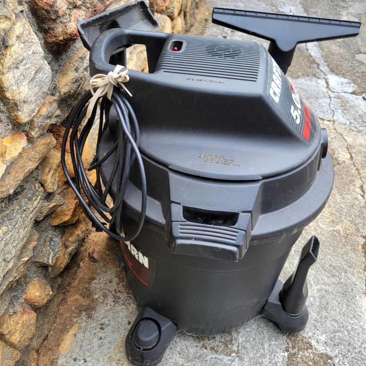 A Craftsman wet/dry vac thar powered on when plugged in. It has 5hp motor, a 12gal capacity and comes with additional accessories. Measures approximately 24"D x 28"H. Local pickup only
