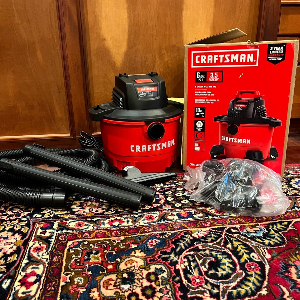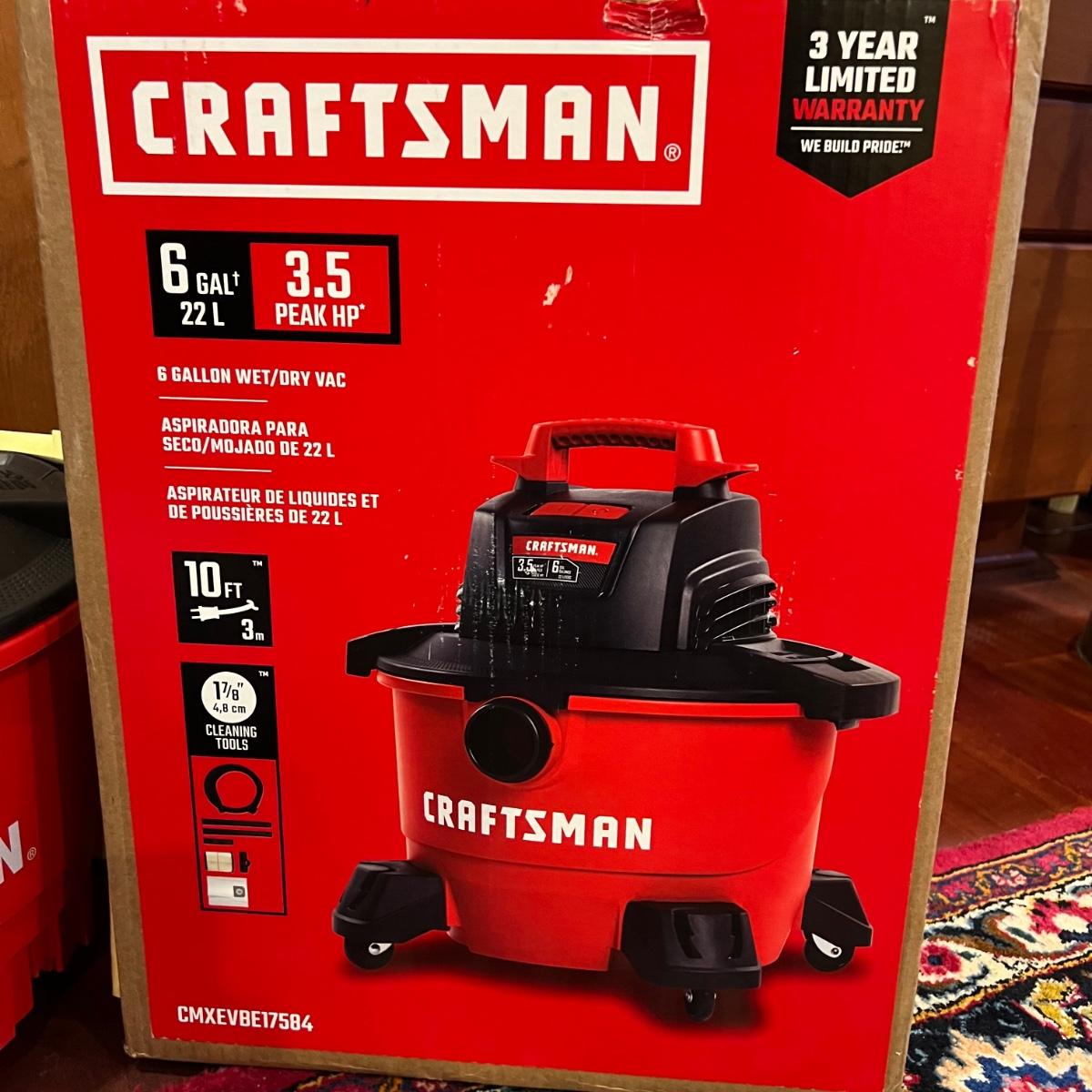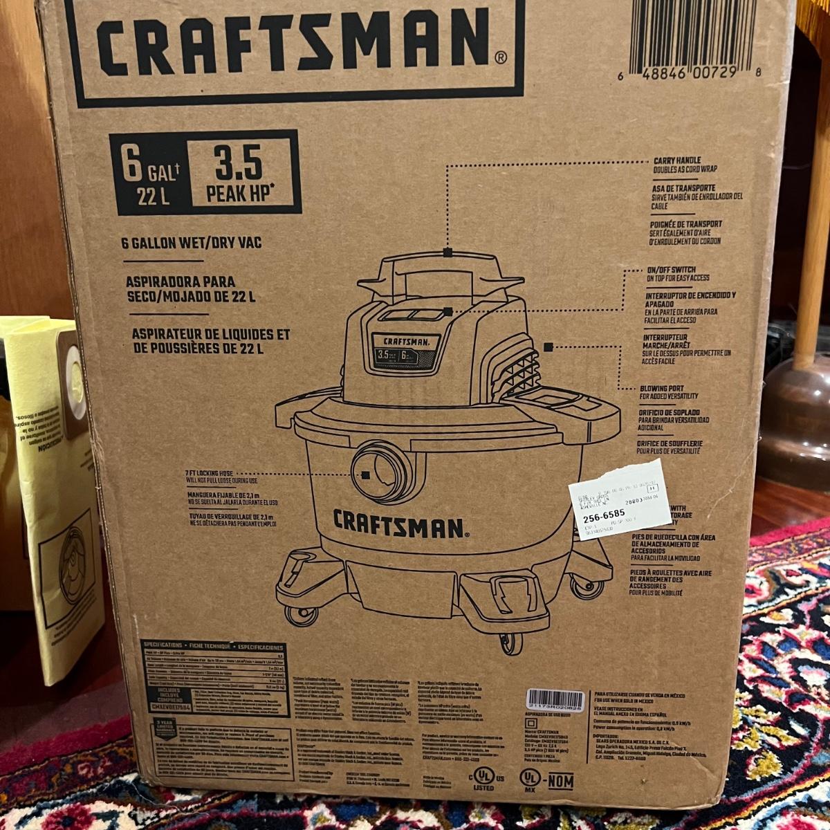 Craftsman NIB 6 gallon wet/dry vac. Includes all cleaning tools; bag insert, 7ft. Hose, filter, pole extenders and sweep attachment.