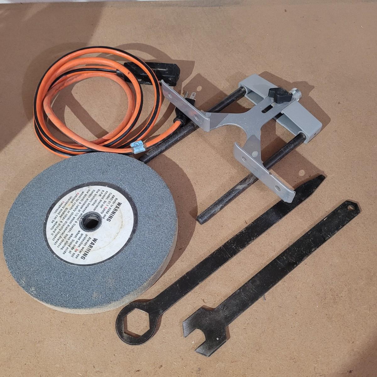 Craftsman brand grinder with attached light. Includes extra grinding stone, tools, and extension cord. Grinder and light power on and appear to work. Item measures approximately 18"x 12" x 18"H.