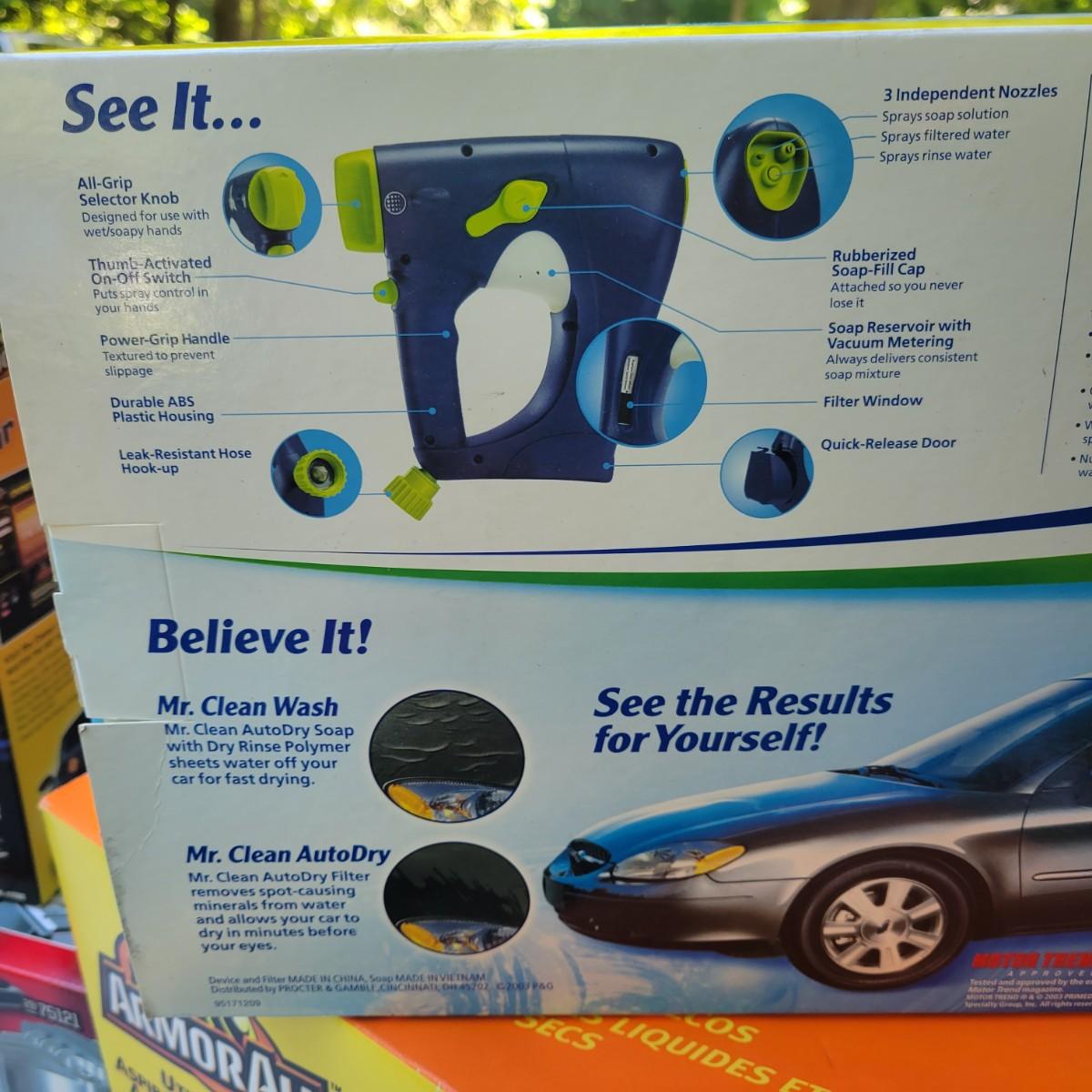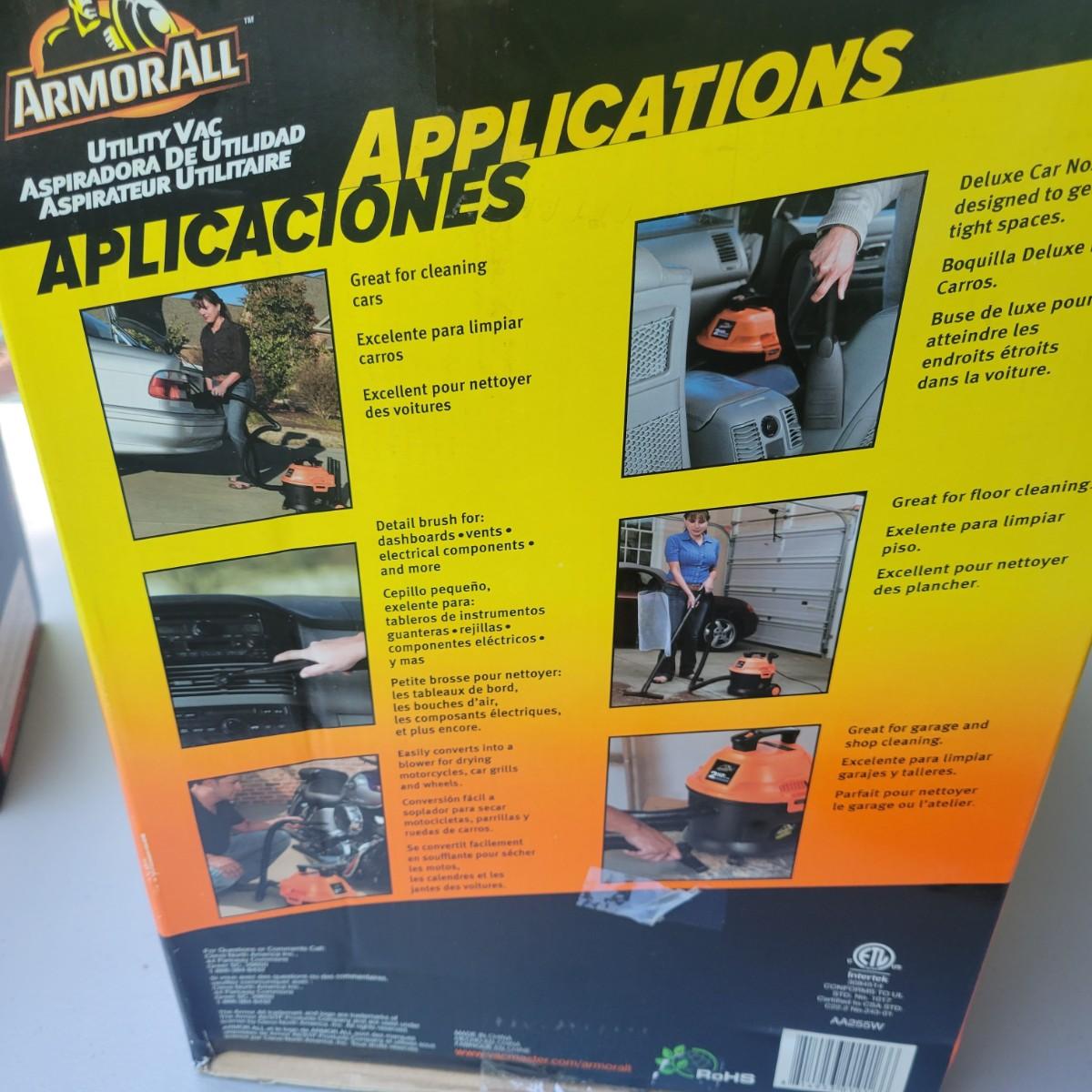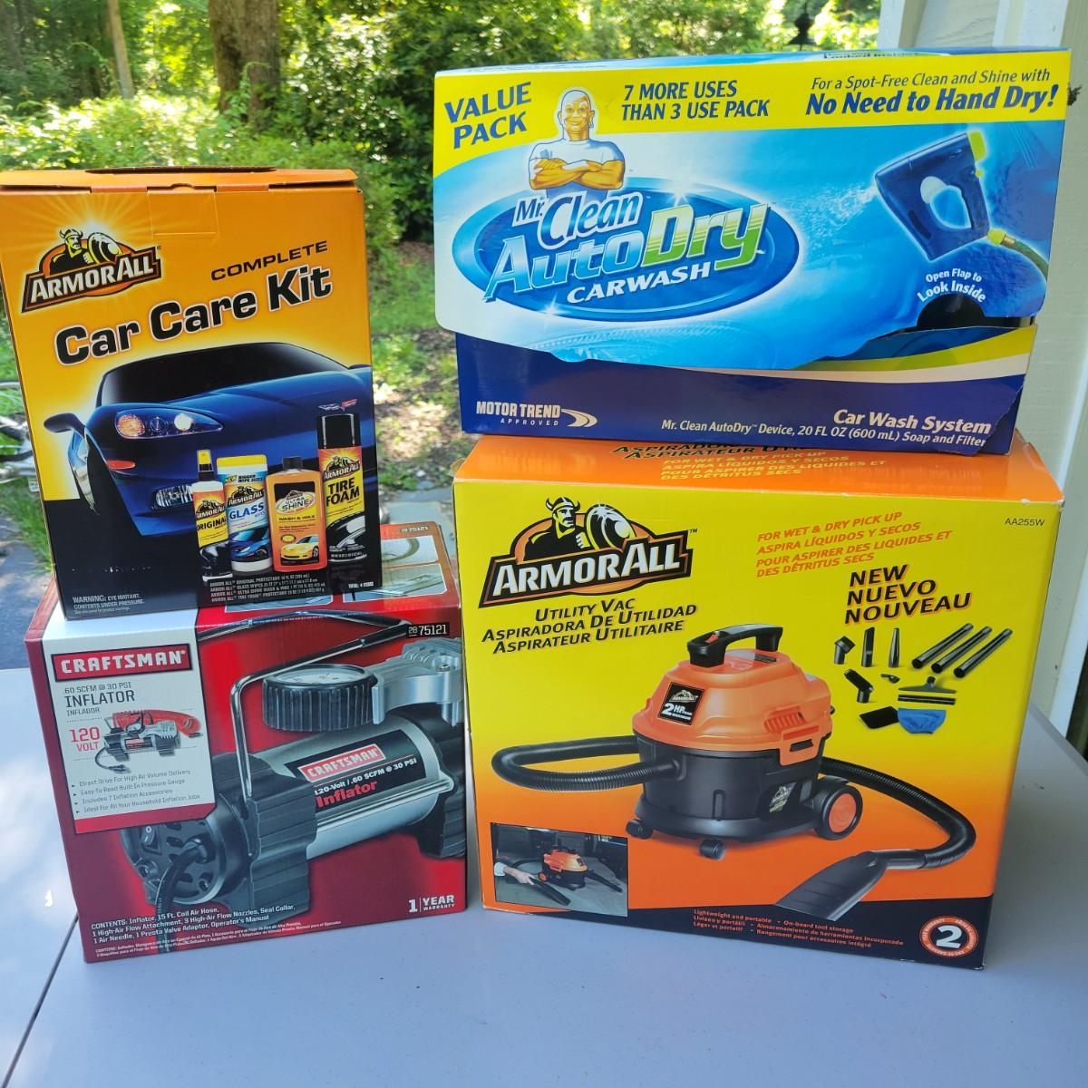 All new items in original packaging. Craftsman portable air pump, ArmorAll 2hp shop vacuum, Armorall complete car care kit, Mr. Clean auto dry car wash. Local pickup only