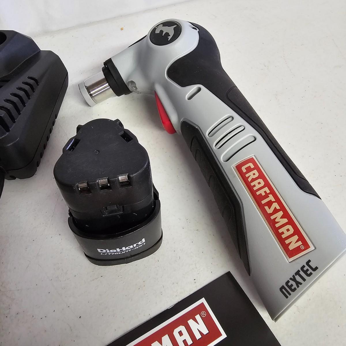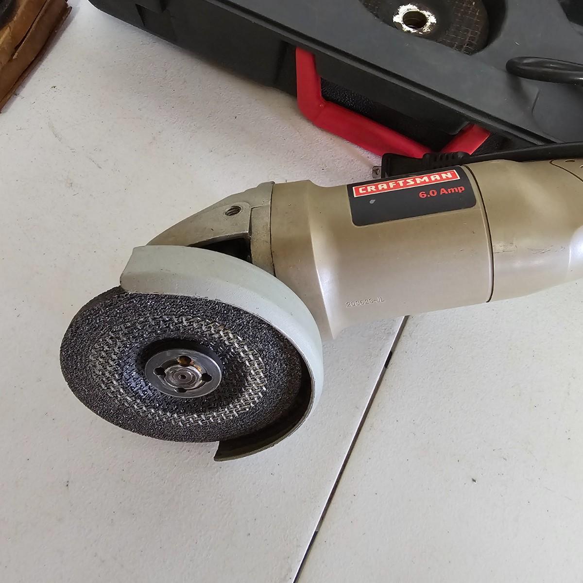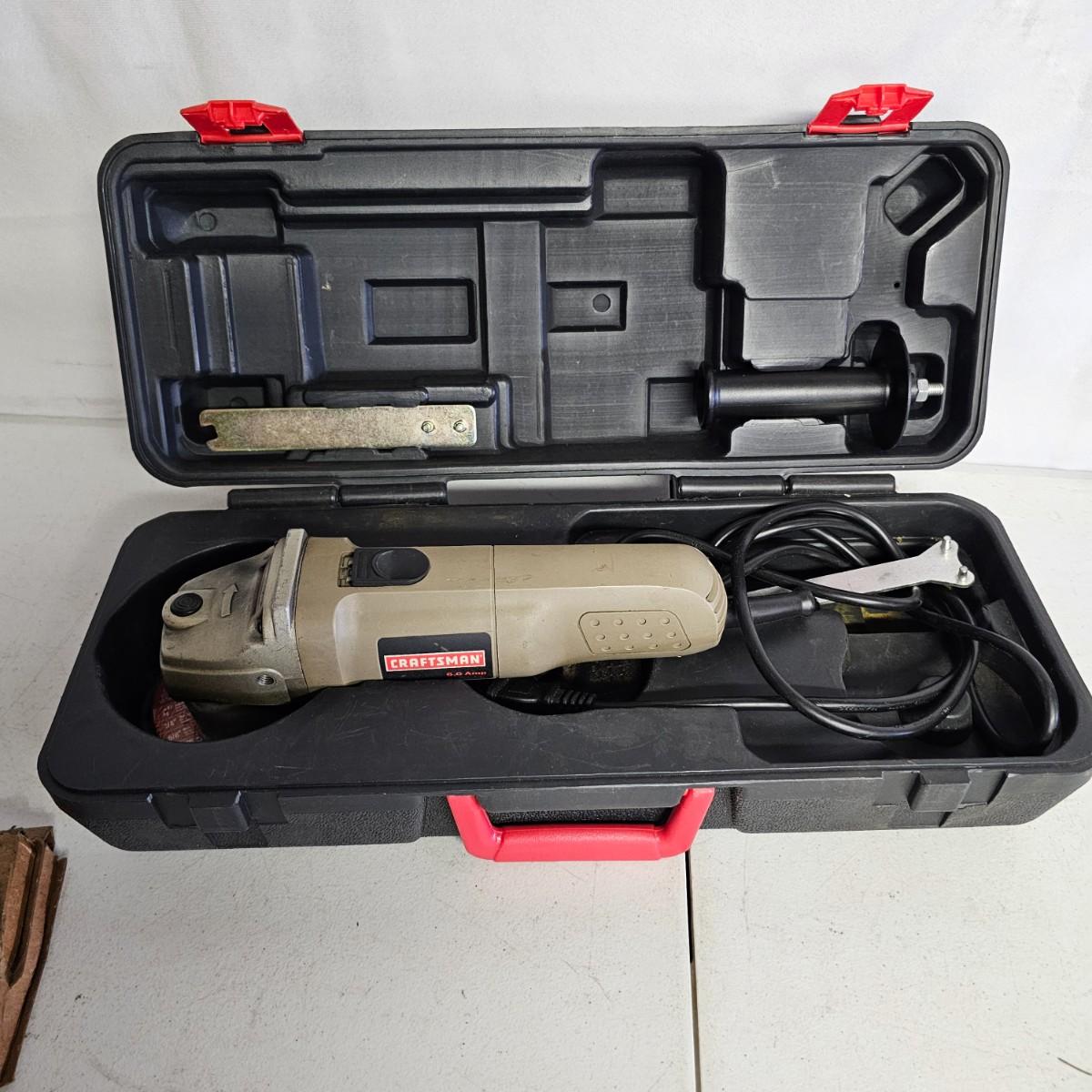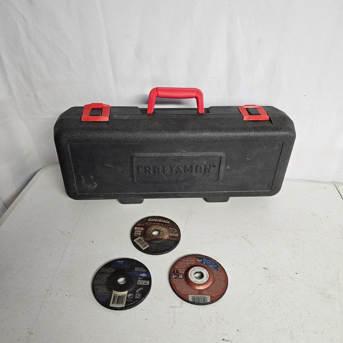 Craftsman 4" angle grinder with hard case and extra wheels, has side handle for control. Craftsman 12v lithium hammerhead auto hammer with battery and charger, comes with carry case. Black & Decker small electric screwdriver with bits, extension, and charger. Parker solid state hot melt glue gun and extra glue sticks. All items powered on when plugged in. See photos for details. Bucket included with lot. Shipping available.