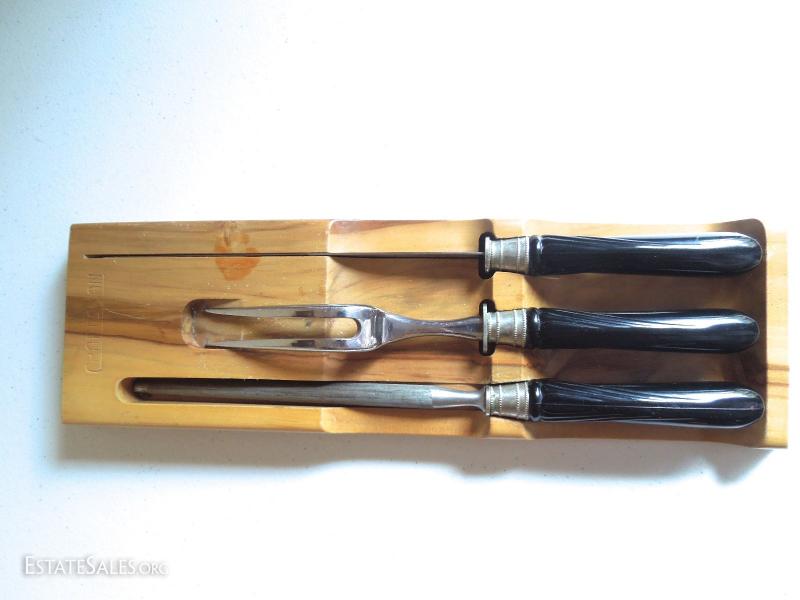 15" Rack. Composite Handles. 3 pieces: fork, knife and sharpener. Made by Craftsman.