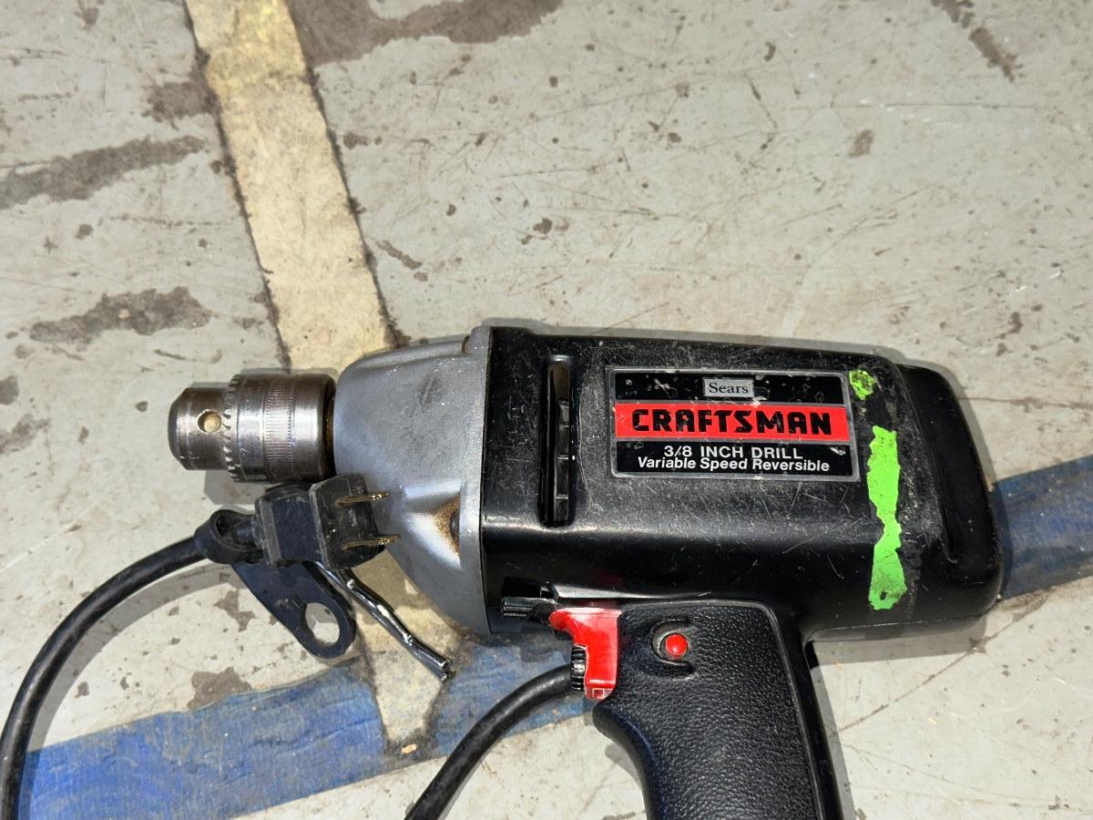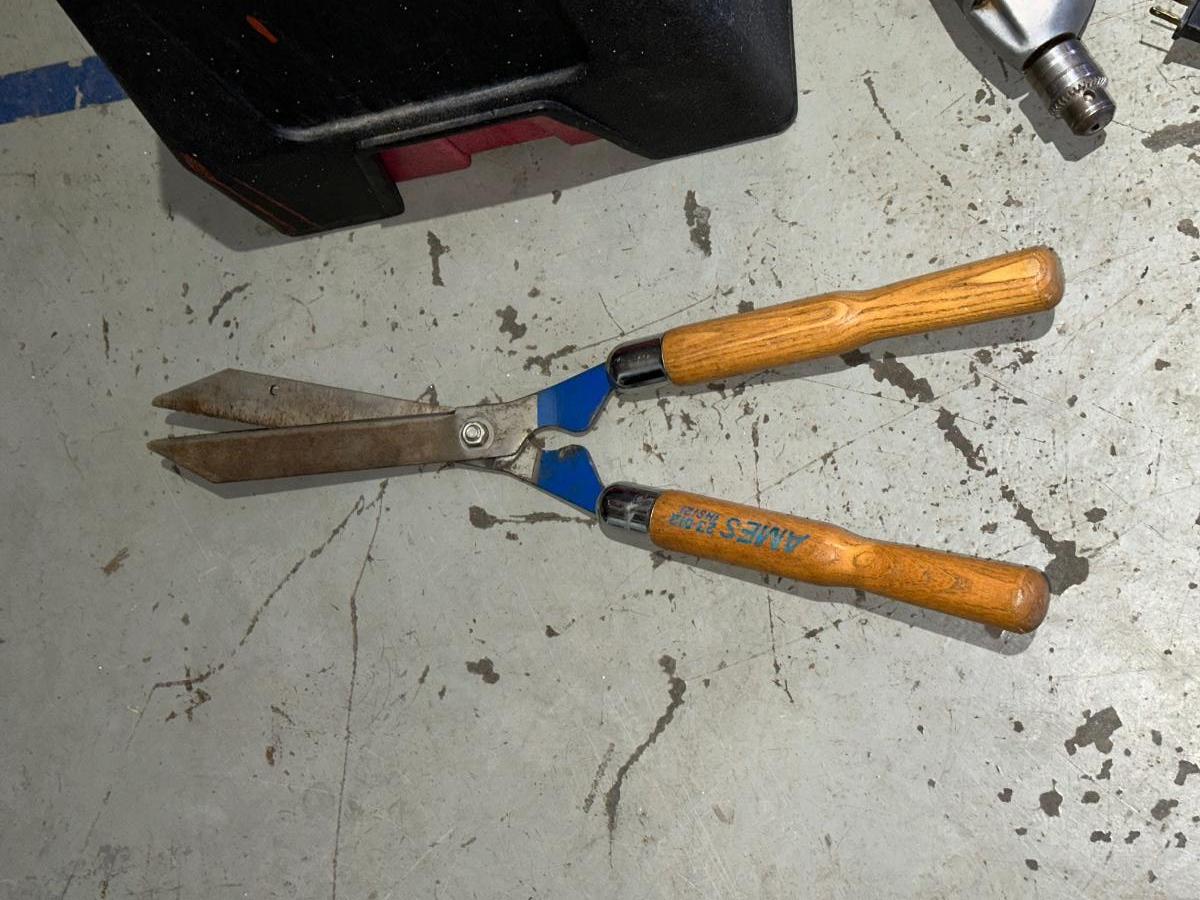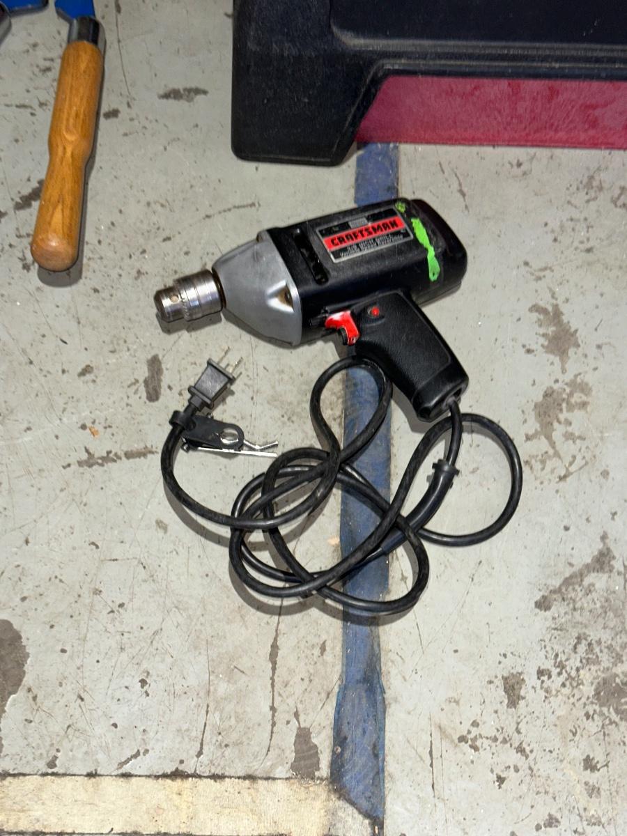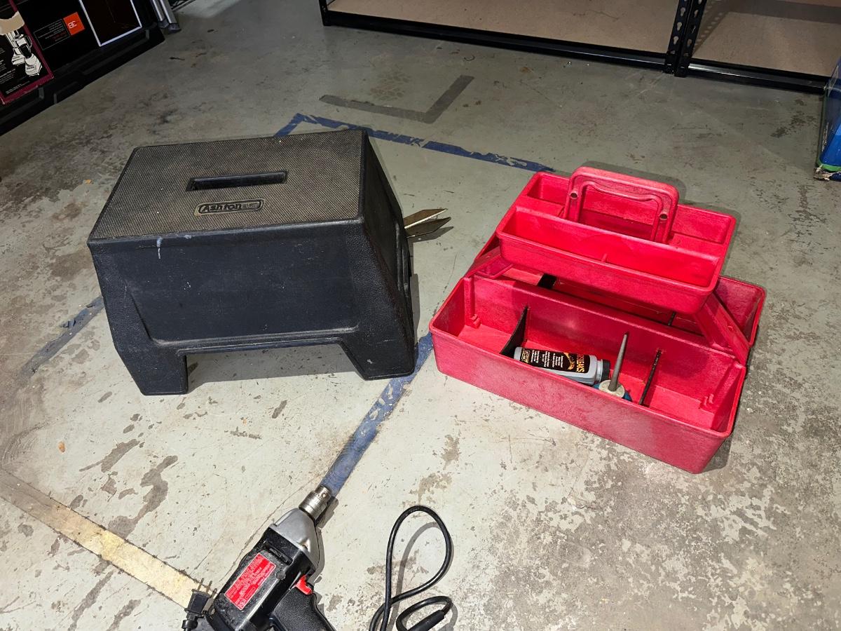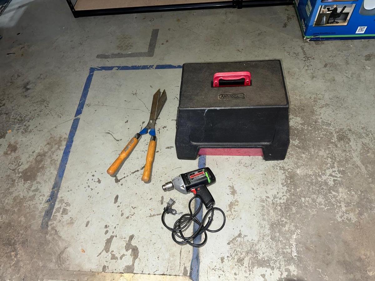 CRAFTSMAN DRILL, HEDGE CUTTERS AND A TOOL BOX STEP STOOL