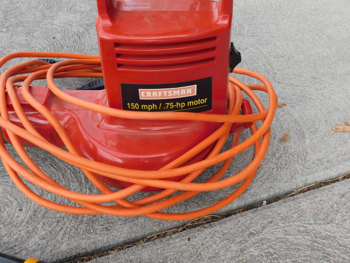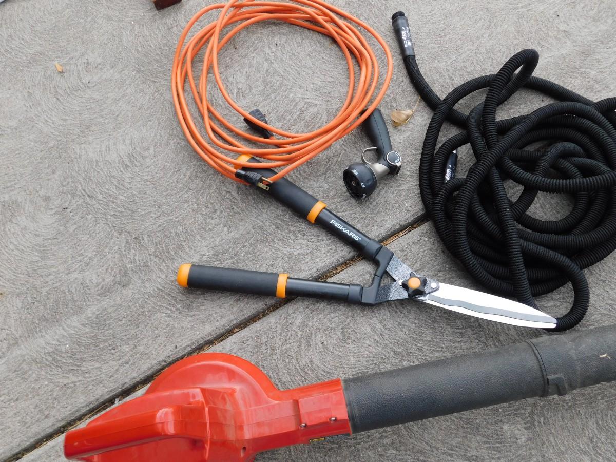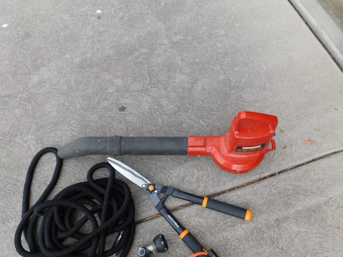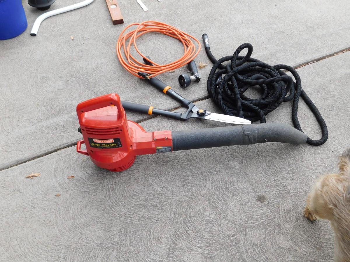 CRAFTSMAN ELECTRIC LEAF BLOWER, EXTENSION CORD, GARDEN HOSE, SPRAYER, AND HEDGE TRIMMERS