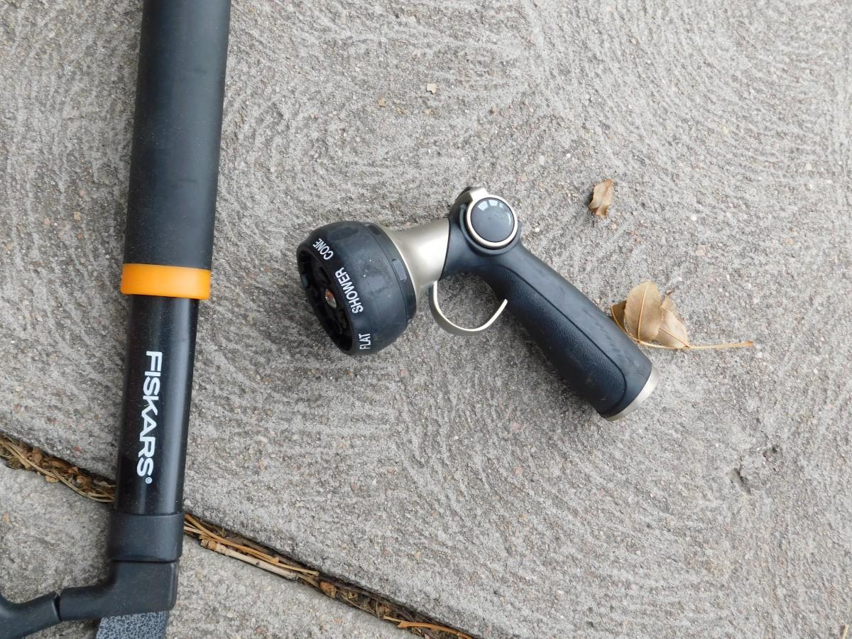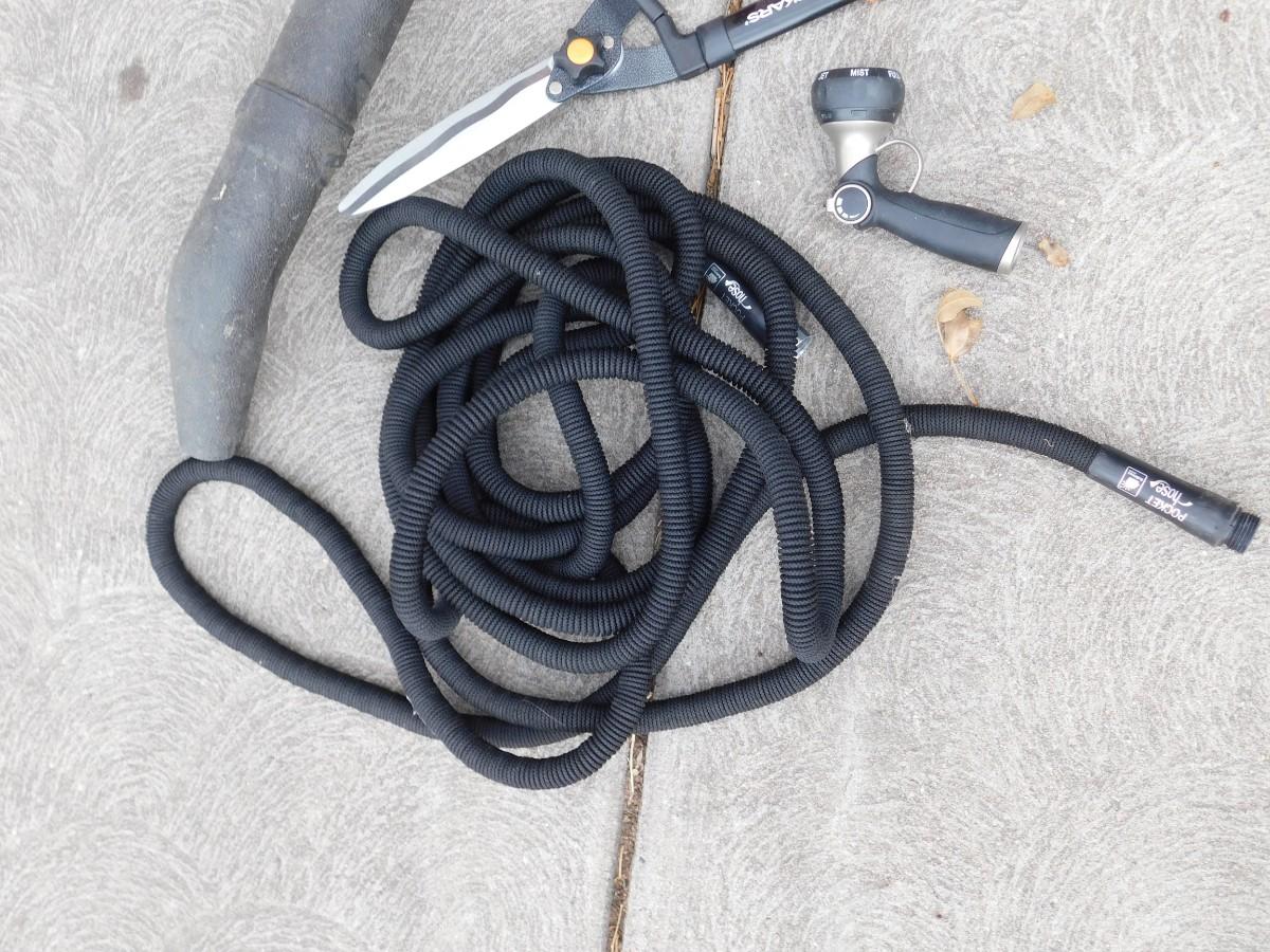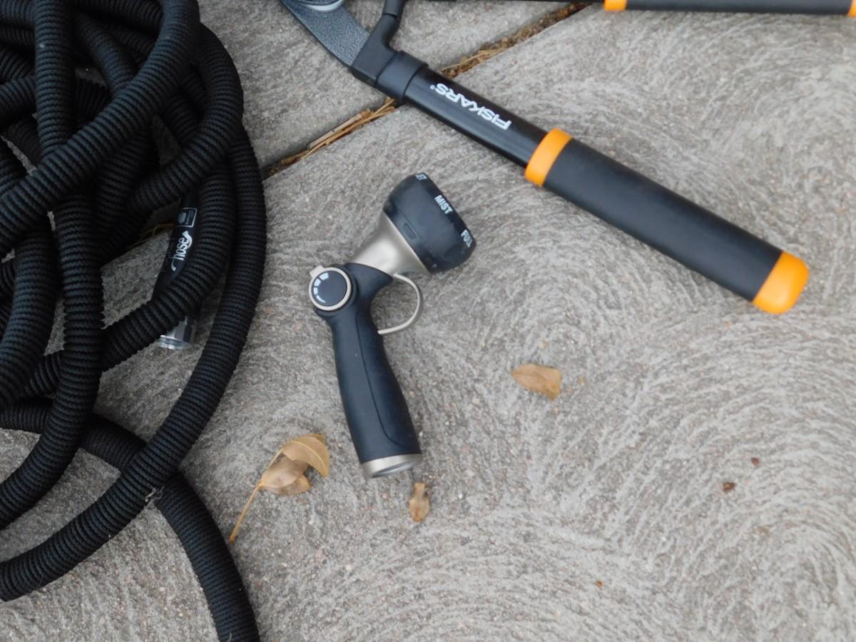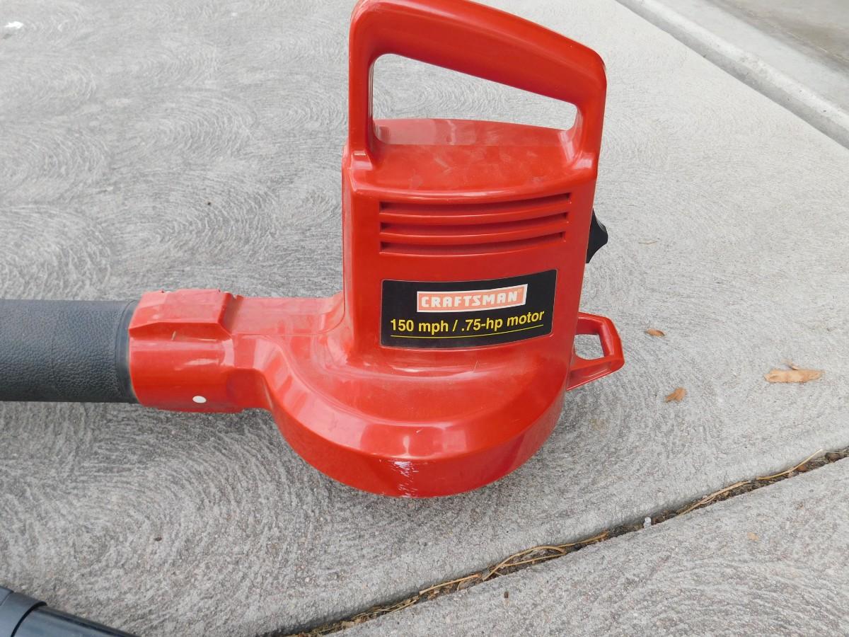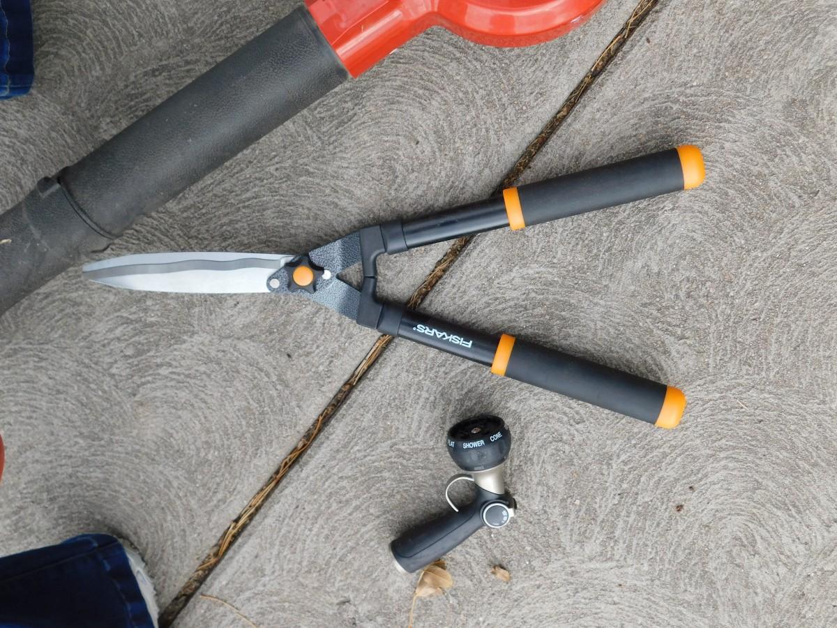 CRAFTSMAN ELECTRIC LEAF BLOWER, EXTENSION CORD, GARDEN HOSE, SPRAYER, AND HEDGE TRIMMERS
