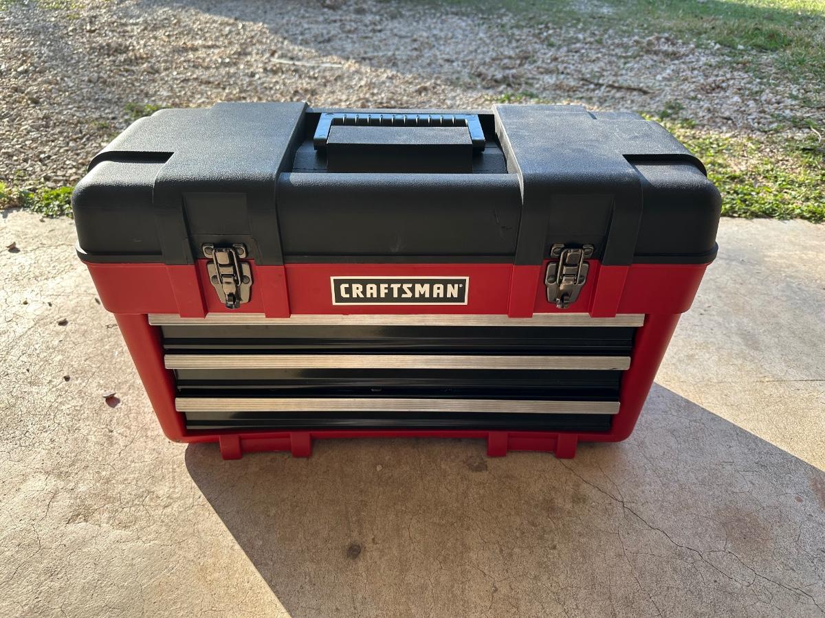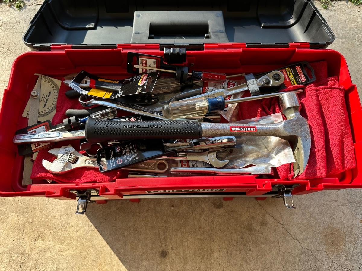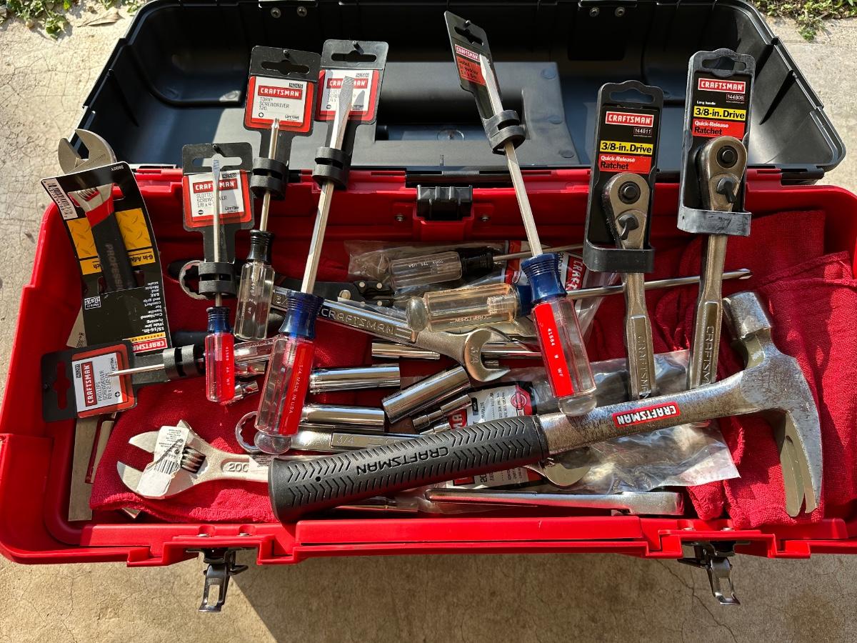 Heavy-duty Craftsman portable tool chest with pull-out drawer, loaded with Craftsman hand tools. Includes SAE & metric socket sets, combination wrenches (USA forged), ratchets, extensions, screwdrivers (some new in package), adjustable wrenches, hammer, and misc. shop tools. Solid grab-and-go setup for garage, truck, or jobsite.